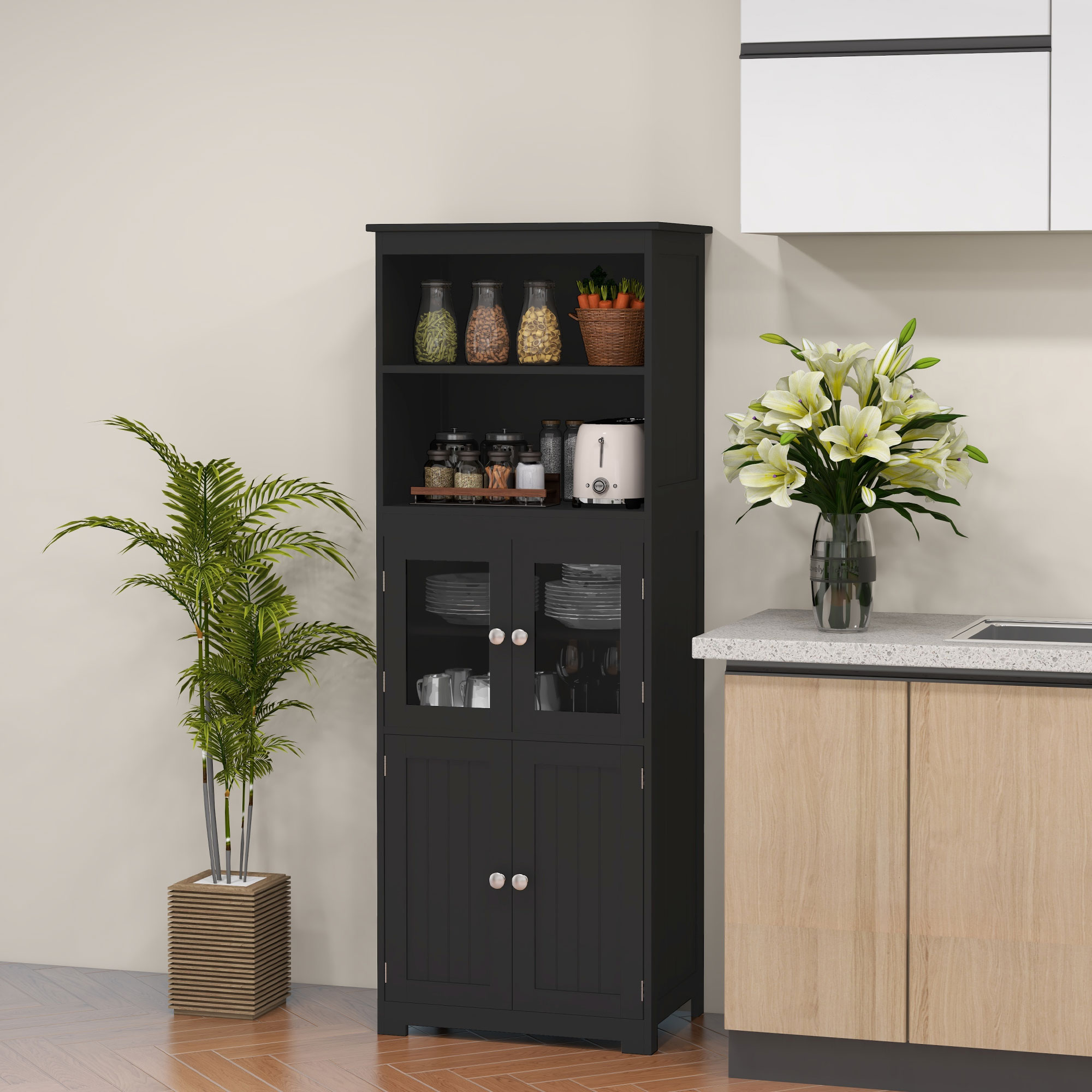 HOMCOM Alacena de Cocina Aparador de Comedor Armario de Cocina con 4 Puertas 2 Estantes Abiertos y Estante Ajustable para Salón 60x30x162 cm Negro