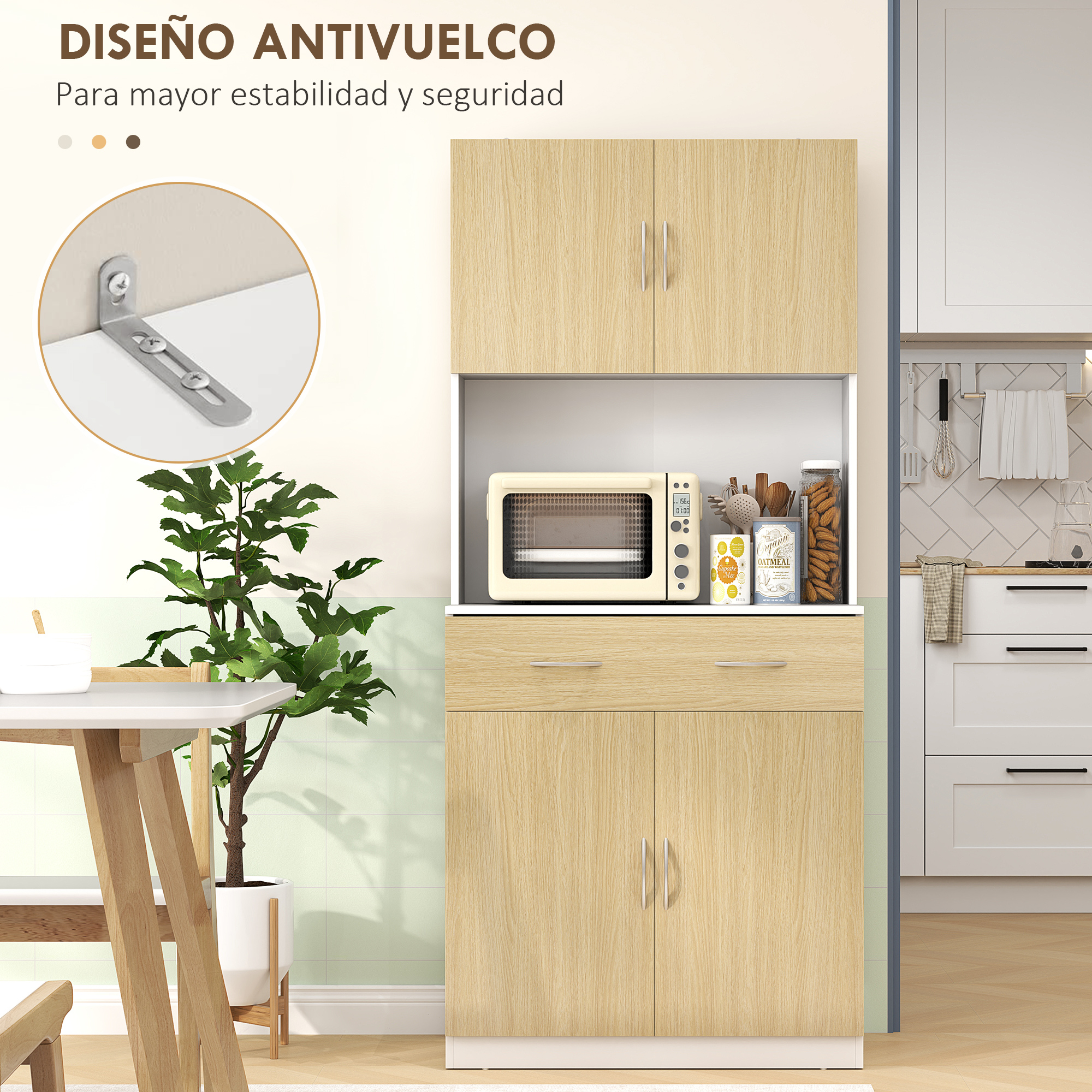 Este mueble despensa de HOMCOM de estilo moderno cuenta con dos armarios, un cajón y una gran encimera. El armario superior se puede utilizar para guardar botellas, platos … Y el armario inferior para guardar artículos más grandes. Ambos tienen un estante regulable en altura, e incluso puedes quitar el estante si es necesario. La encimera está diseñada para poder colocar un microondas, cafetera o cualquier otro pequeño electrodoméstico. Y en el cajón puedes guardar cubiertos, por ejemplo. Características: Mueble de cocina moderno y elegante Amplio espacio de almacenamiento, compuesto por dos armarios con puertas, un cajón y una amplia encimera Estantes interiores ajustables en cada uno de los compartimentos para adaptarse a tus diferentes necesidades de almacenaje Mueble auxiliar ideal para tu cocina, comedor o sala de estar Ideal para guardar utensilios de cocina, como ollas, cubiertos, entre otros Fabricado en melamina de madera resistente y fácil de limpiar Con dispositivo anti vuelco para fijar a la pared para mayor estabilidad y seguridad Requiere montaje Especificaciones: Color: madera natural, blanco Material: melamina de madera Medidas totales: 80x40x180 cm (LxANxAL) Medidas de la encimera: 80x40x44 cm (LxANxAL) Medidas del cajón: 71,8×33,7×12,4 cm (LxANxAL) Peso máximo soportado: 50 kg (total) y 5 kg (cajón y balda) Referencia: 835-538V80ND El paquete incluye: ● 1 x Alacena de cocina; ● 1 x Manual de instrucciones
