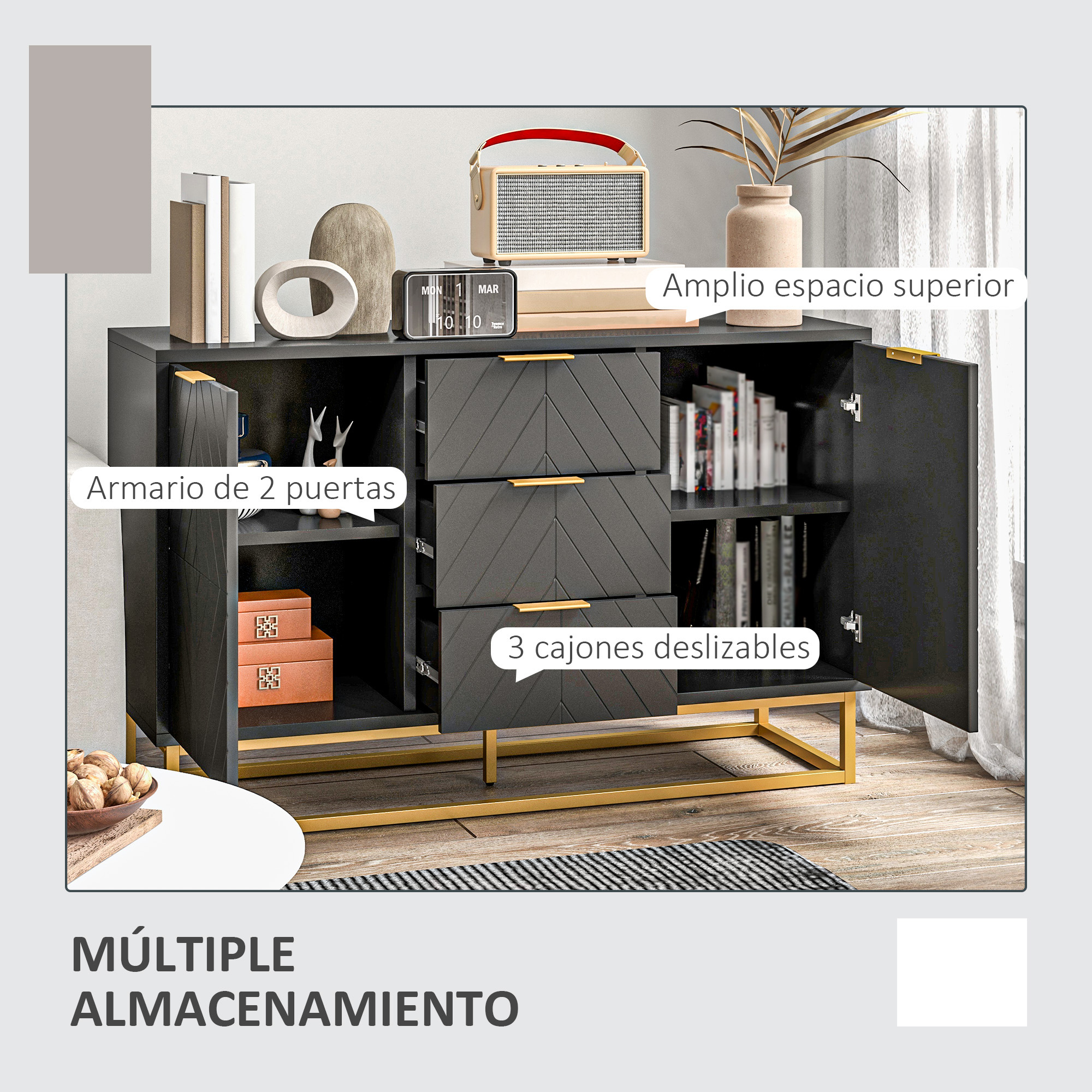 ¿Quieres reorganizar el espacio de tu casa? Este aparador de estilo moderno de HOMCOM en madera y metal es perfecto para crear un ambiente elegante y ordenado. Tiene tres prácticos cajones y dos armarios con puerta y balda interior ajustable, para que puedas usar para guardar cubiertos, platos, tu mantelería y mucho más. Características: Aparador de dormitorio compuesto por una amplia encimera, 3 cajones y 2 armarios con puerta Los dos armarios con puerta cuentan con una balda interior regulable en altura Fabricado en MDF y metal, resistente y de fácil mantenimiento Aparador para salón incluye dispositivo antivuelco para fijar en la pared para evitar que se vuelque o tambalee La base elevada evita el contacto directo con el suelo y protege tus artículos de la humedad Se requiere montaje Especificaciones: Color: negro y dorado Material: MDF y metal Medidas totales: 120x40x76 cm (LxANxAL) Medidas interiores del cajón: 34x29x10,5 cm (LxANxAL) Medidas interiores del armario: 39×36,5×27 / 28,5 cm (LxANxAL) Distancia entre los estantes: 6,4 cm Altura de la base al suelo: 16 cm Carga máxima: 50 kg (total), 8 kg (estante) y 3 kg (cajón) Referencia: 837-151V80BK El paquete incluye: ● 1 x Aparador; ● 1 x Manual de instrucciones
