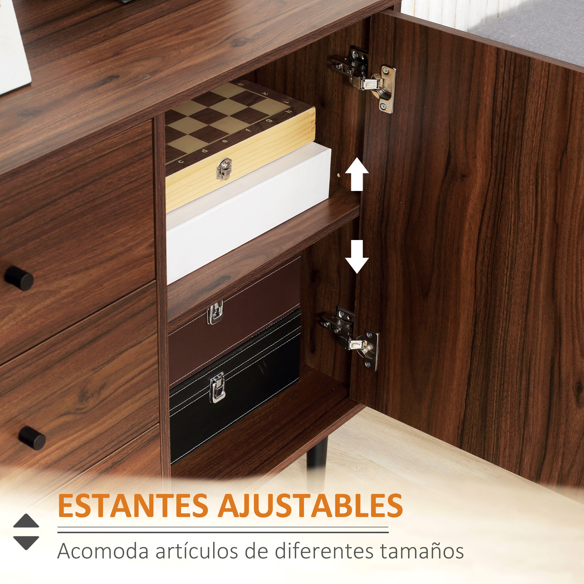 Este aparador buffet de HOMCOM te ayudará a mantener todos tus elementos organizados. Con un bonito diseño y color, este aparador añadirá un toque de elegancia a cualquier habitación de tu hogar, por lo que podrás usarlo, por ejemplo, como aparador de cocina o aparador de salón. Tiene 3 cajones amplios y 2 armarios con estantes interiores regulables que ofrecen un amplio espacio para guardar tus utensilios de cocina, vasos, cubiertos, entre otros. Características: Buffet de cocina de estilo moderno que aportará un toque de elegancia allá donde lo coloques Compuesto por 3 cajones y 2 armarios, ofrece un amplio espacio de almacenamiento Los estantes del interior del mueble son regulables en altura para adaptarse a tus diferentes necesidades y tamaños de objetos Se puede utilizar como aparador, mueble auxiliar en el despacho o como mesa consola en la entrada Fabricado en resistente melamina de madera e ideal para uso prolongado Incluye dispositivo antivuelco para mayor estabilidad y seguridad Requiere montaje Especificaciones: Color: marrón rojizo y negro Material: melamina de madera y madera de caucho Medidas totales: 127x40x76 cm (LxANxAL) Medidas de interior del cajón: 35x28x15,5 cm (LxANxAL) Medidas de estantes: 40x38x27/29,5 cm (LxANxAL)(del armario) Carga máxima: 49 kg (total), 20 kg (encimera), 3 kg (cada cajón) y 5 kg (estante) Referencia: 839-545V00BN El paquete incluye: ● 1 x Aparador; ● 1 x Manual de instrucciones