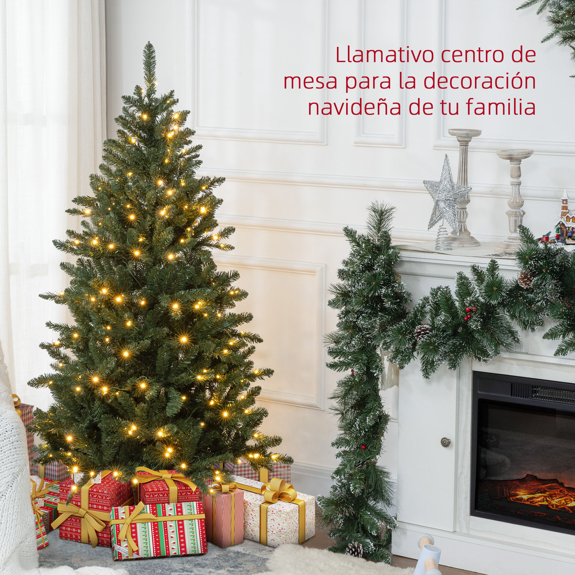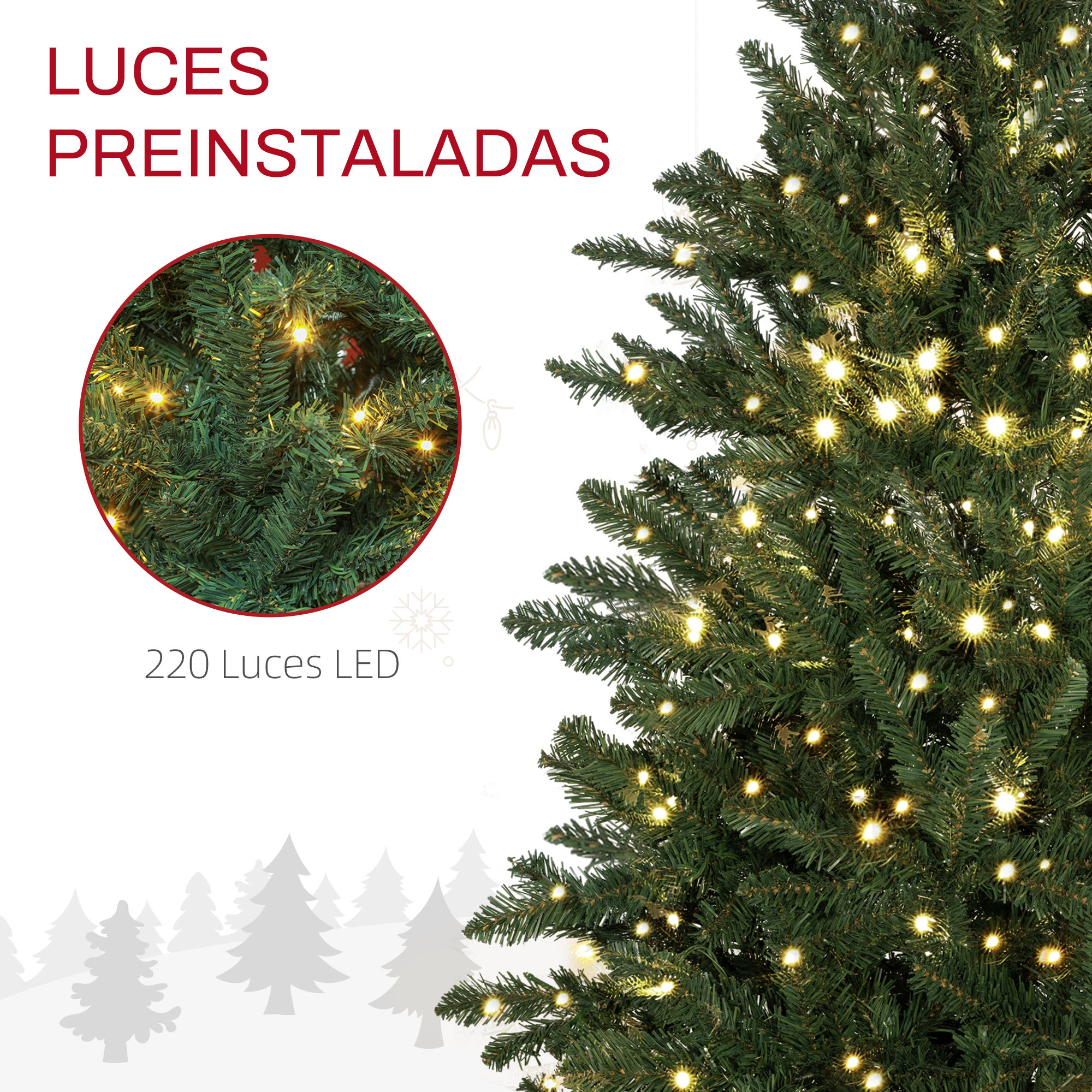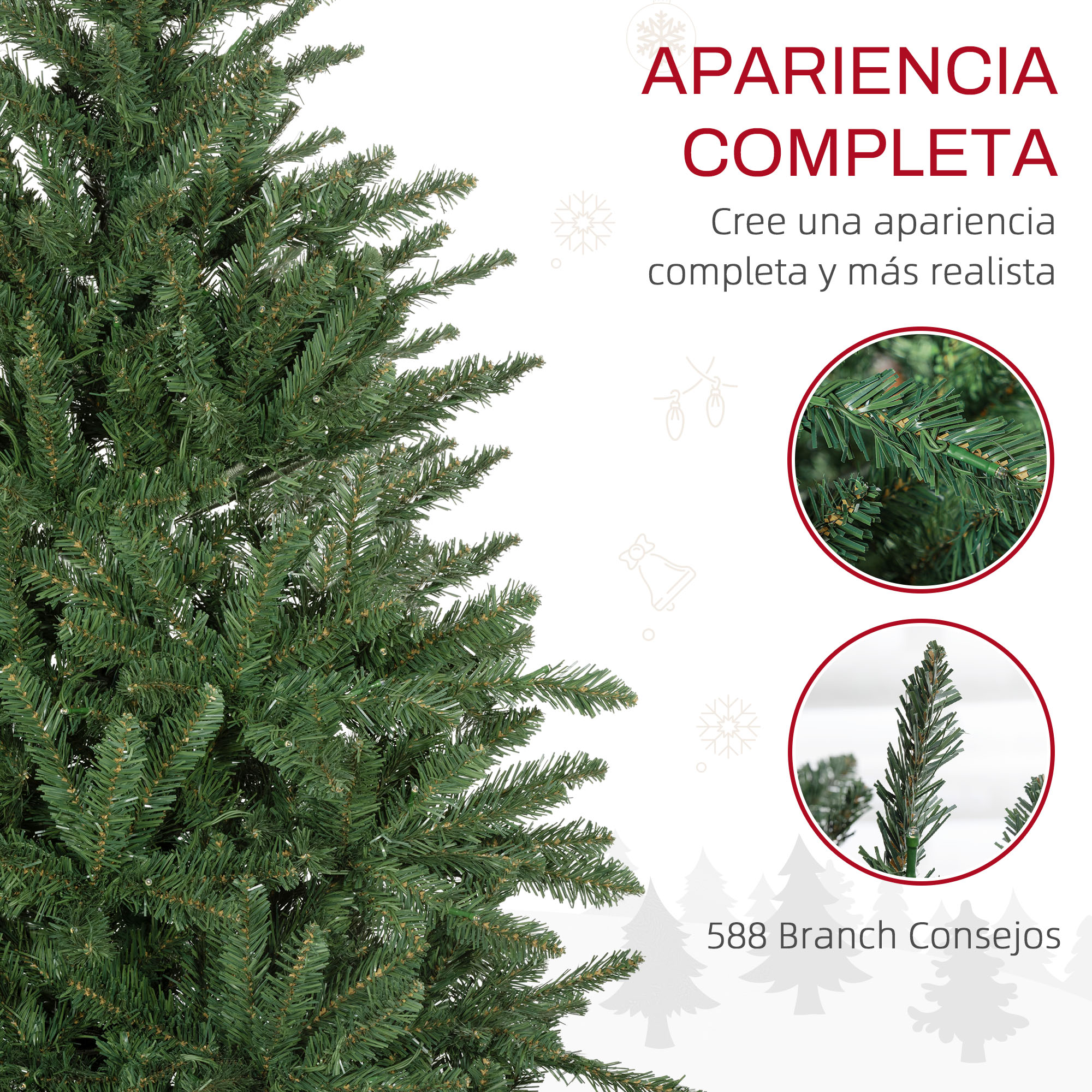 ¡Ilumina tu Navidad con este árbol artificial de HOMCOM! Este árbol de Navidad, equipado con luces LED blancas cálidas y una bonita forma, te ofrece el brillo de un árbol real con la comodidad de uno artificial. Sus ramas retardantes de llama garantizan mayor seguridad, mientras que sus patas de metal aseguran una buena estabilidad. Será el toque encantador que tu navidad necesita. Características: Este árbol de Navidad artificial está diseñado para uso en interiores Las luces LED en tono blanco cálido iluminarán tus noches navideñas La forma de árbol ofrece mucho espacio para tus decoraciones Las ramas del árbol navideño se despliegan casi solas y su diseño por secciones facilita el montaje Las ramas retardantes de llama de este árbol artificial aumentan la seguridad Las patas metálicas aseguran una posición estable del árbol de Navidad Nota: Este árbol NO incluye ningún tipo de decoración ni cubre pie o faldón que pueda aparecer en las imágenes, solo luces Especificaciones: Color: verde (árbol), blanco cálido (luz) Material: plástico, metal Medidas totales: Ø97×150 cm (DxAL) Número de puntas: 588 Número de luces LED: 220 Referencia: 830-898V90GN Nota: Solo para uso interior, no apto para uso exterior. Para conseguir un aspecto más realista, hay que extender todas las puntas individualmente, lo que supone aproximadamente 15-25 minutos El paquete incluye: ● 1 x Árbol de Navidad; ● 1 x Manual de instrucciones