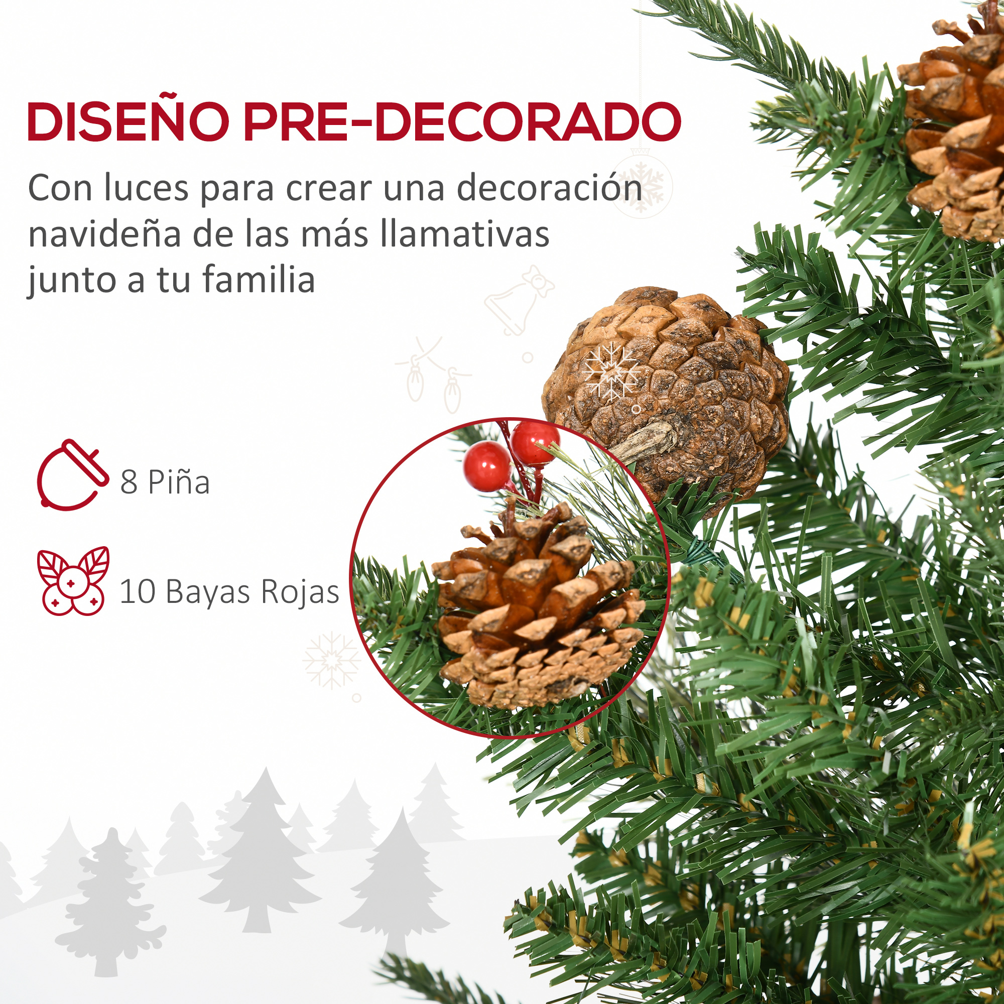 Seguro que en más de una ocasión te has planteado comprar un árbol de Navidad natural por el aspecto irreal de muchos árboles artificiales. Si este es el caso, has llegado al sitio adecuado. Este conjunto de árboles artificiales de HOMCOM tienen la belleza de un pino natural gracias a la combinación de ramas con piñas y bayas. Al ser pequeños se pueden colocar en cualquier espacio de tu casa y, además, ¡añadirán un increíble ambiente navideño! Características: Conjunto de dos árboles de Navidad con maceta, ideales para cualquier espacio de tu hogar Dos árboles de 90 cm de altura, hojas de PE y PVC de aspecto natural, 8 piñas y 70 bayas Algunas ramas se han moldeado a partir de ramas reales para crear un aspecto más realista y natural Gracias a su tamaño compacto es ideal para colocarlo sobre la mesa Las ramas son ignífugas para mayor seguridad Base robusta y duradera para una mayor estabilidad Especificaciones: Color: verde● Material: PE, PVC, acero, polipropileno (PP) Medidas totales: Ø48×90 cm (DxAL) Número de puntas: 110 Número de decoraciones: 8 piñas y 10 bayas Referencia: 830-569V00GN Solo para uso interior, no apto para exteriores Para obtener una apariencia de lo más realista, extiende todas las puntas individualmente, no tomará más de 20-30 minutos El paquete incluye: ● 2 x Árbol de Navidad; ● 1 x Manual de instrucciones