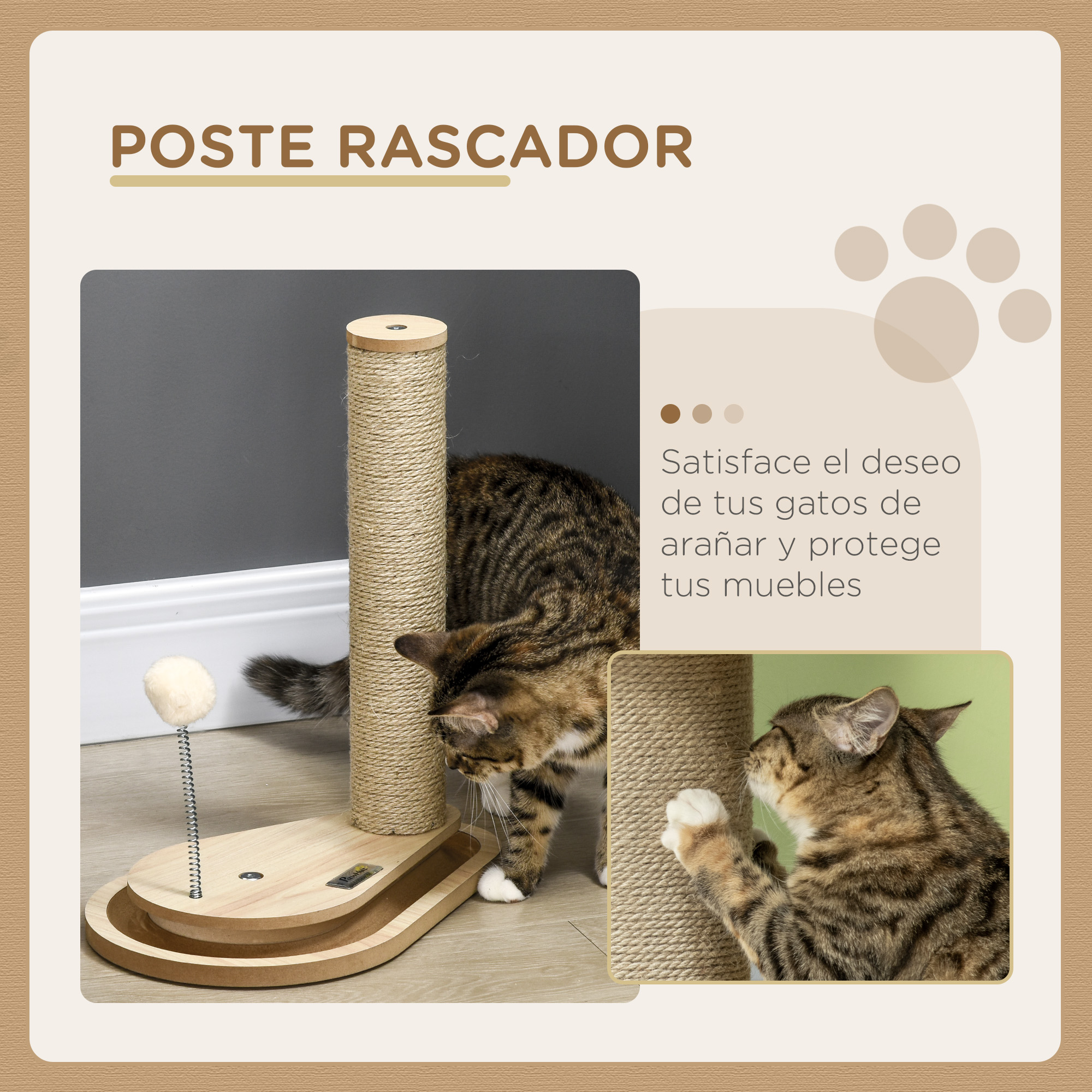 Este mini árbol para gatos PawHut con juegos integrados mantendrá a tus gatos entretenidos en todo momento. Tus gatos pasarán horas jugando con este rascador compacto que incluye actividades divertidas. Y el rascador de yute permite a los gatitos mantener sus garras afiladas, evitando que dañen los muebles. Su diseño simple y tonos neutros combinan en cualquier espacio, así que ya lo sabes ¡que tu gato no se quede sin el suyo! Características: Este arañador para gatos incluye una bola en un resorte y una pista con pequeñas bolitas para el entretenimiento de tus felinos Fabricado con paneles de aglomerado de madera estables para mayor durabilidad Torre de gatos es ligero y fácil de transportar Adecuado para gatos con un peso inferior a 4 kg Requiere montaje sencillo Especificaciones: Color: roble Material: aglomerado de madera, yute Medidas totales: 35x23x40 cm (LxANxAL) Medidas de la base: 35×23 cm (inferior), 29×17 cm (superior) Medidas de la bola: Ø2,5 cm (en la pista), Ø4 cm (en el muelle) Longitud del muelle: 14 cm Medidas del poste rascador: Ø6,5×34 cm Medidas de la plataforma: Ø7×1,5 cm Referencia: D30-658V00AK El paquete incluye: ● 1 x Mini rascador para gatos; ● 1 x Manual de instrucciones