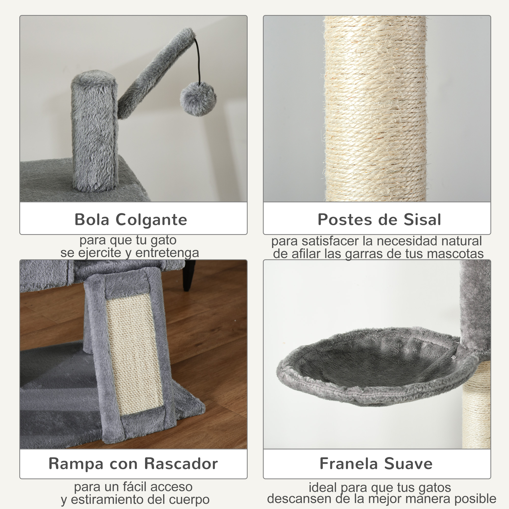 Ahorrar espacio y ofrecer una amplia superficie para que tus gatos jueguen o descansen es posible con los rascadores de suelo a techo de PawHut. Este cuenta con una barra extensora que se puede regular entre 238-270 cm para ajustar en el techo, ofreciendo una gran estabilidad y mayor seguridad para tu mascota, incluso si tu gato es muy activo. Hecho de aglomerado de madera, se compone por múltiples plataformas, postes, 1 cueva, 1 hamaca, 1 bola colgante y poste y 1 rampa con rascador. Características: Árbol rascador para gatos de suelo a techo con altura ajustable de 238 a 270 cm Se puede fijar al techo con la barra de tensión incluida Este tipo de rascadores permiten ahorrar mucho espacio en el suelo al obtenerlo en altura con las múltiples plataformas Cuenta con múltiples plataformas, postes, 1 rampa con rascador, 1 hamaca, 1 cueva y 1 bola colgante Los postes de sisal les permite afilar sus garras, protegiendo tus muebles También incluye una rampa de acceso a la cueva con superficie para rascar Estructura resistente de aglomerado de madera, resistente y estable Apto para gatos de menos de 4,5 kg Se requiere montaje Especificaciones: Color: gris claro y beige Material: aglomerado de madera, felpa y sisal Medidas totales: 60x40x238-270 cm (LxANxAL) Medidas de la cueva: 40x30x29 cm (LxANxAL) Medidas de la puerta de la cueva: 16×20 cm (LxAL) Medidas de la rampa: 32×16 cm (LxAN) Medidas de la base: 60×40 cm (LxAN) Adecuado para gatos de menos de 4,5 kg● Diámetro de la hamaca: Ø30 cm Referencia: D30-356GY El paquete incluye: ● 1 x Árbol rascador para gatos; ● 1 x Manual de instrucciones