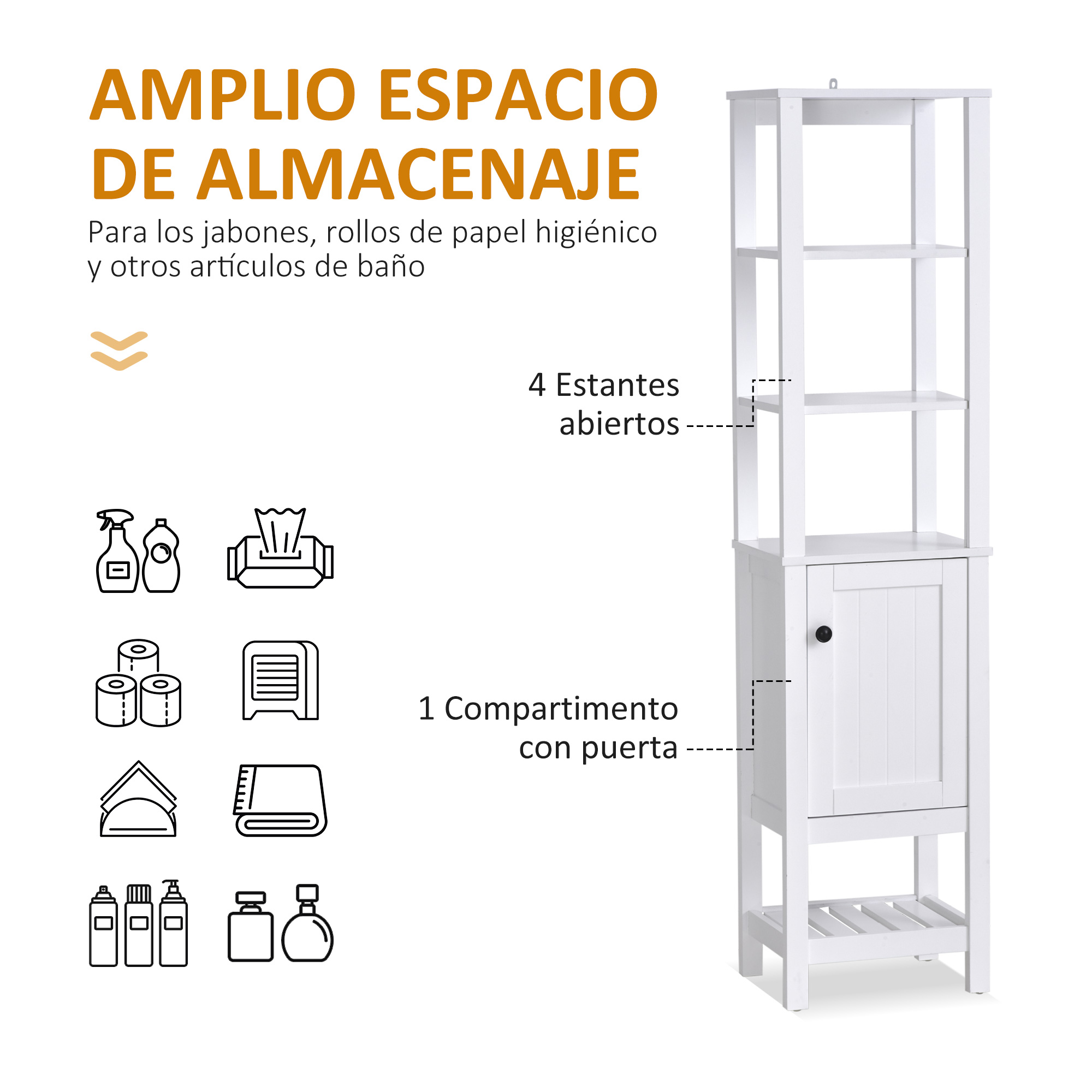 Este mueble de baño HOMCOM está diseñado para integrarse en cualquier baño de estilo rústico y moderno. Su diseño en forma de columna te permite ahorrar espacio. Su bonito diseño en color blanco, con puerta enmarcada, líneas verticales y pomo metálico, le ofrecen un aspecto actual y elegante. Hecho de MDF, cuenta con 4 estantes abiertos, un compartimento cerrado con puerta y 1 repisa inferior de listones. Ideal para tener tus enseres de baño. Características: Mueble de estilo actual y elegante que combinará fácilmente en tu baño o cualquier otro espacio de tu casa Mueble alto y compacto, ideal para esquinas y espacios estrechos Mueble de MDF laminado, resistente para un uso prolongado y fácil de limpiar Perfecto para el baño, sala de estar, dormitorio u oficina Cuenta con 4 estantes y un compartimento cerrado con puerta Ofrece espacio suficiente para el papel higiénico, jabones, artículos de tocador, etc. Puerta con bonito y elegante pomo metálico, para abrir y cerrarla fácilmente Con un dispositivo antivuelco de seguridad para mayor resistencia y estabilidad Se requiere montaje Especificaciones: Color: blanco Material: MDF Medidas totales: 40x30x164 cm (LxANxAL) Altura de los estantes: 25,8 cm, 17,5 cm (estante inferior) Medidas de la puerta: 30,4×45,4 cm (ANxAL) Peso máximo soportado: 30 kg (total), 5 kg (cada estante) Referencia: 370-132 El paquete incluye: ● 1 x Armario de baño; ● 1 x Manual de instrucciones