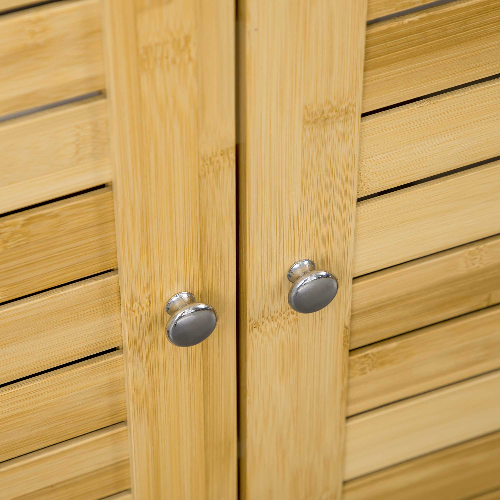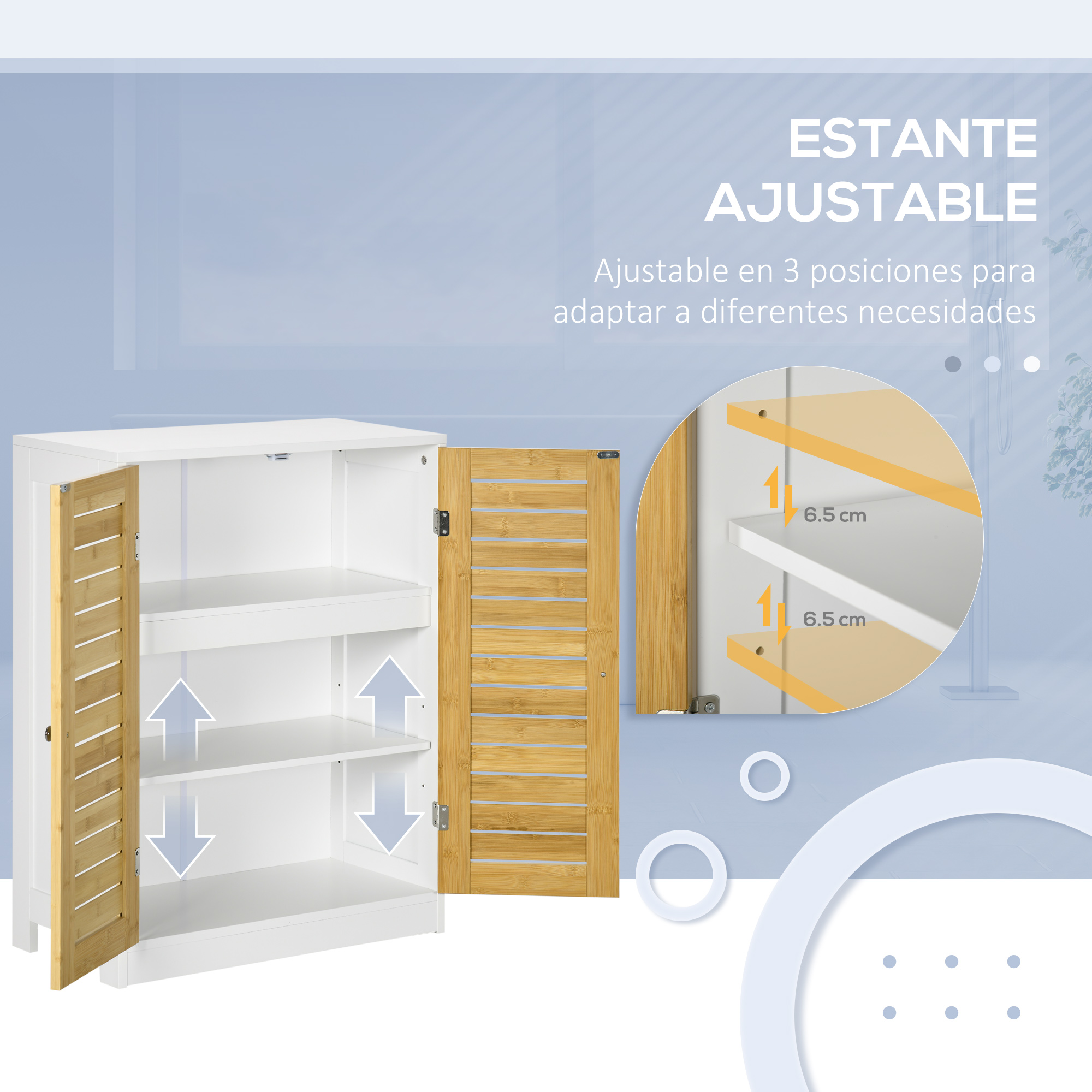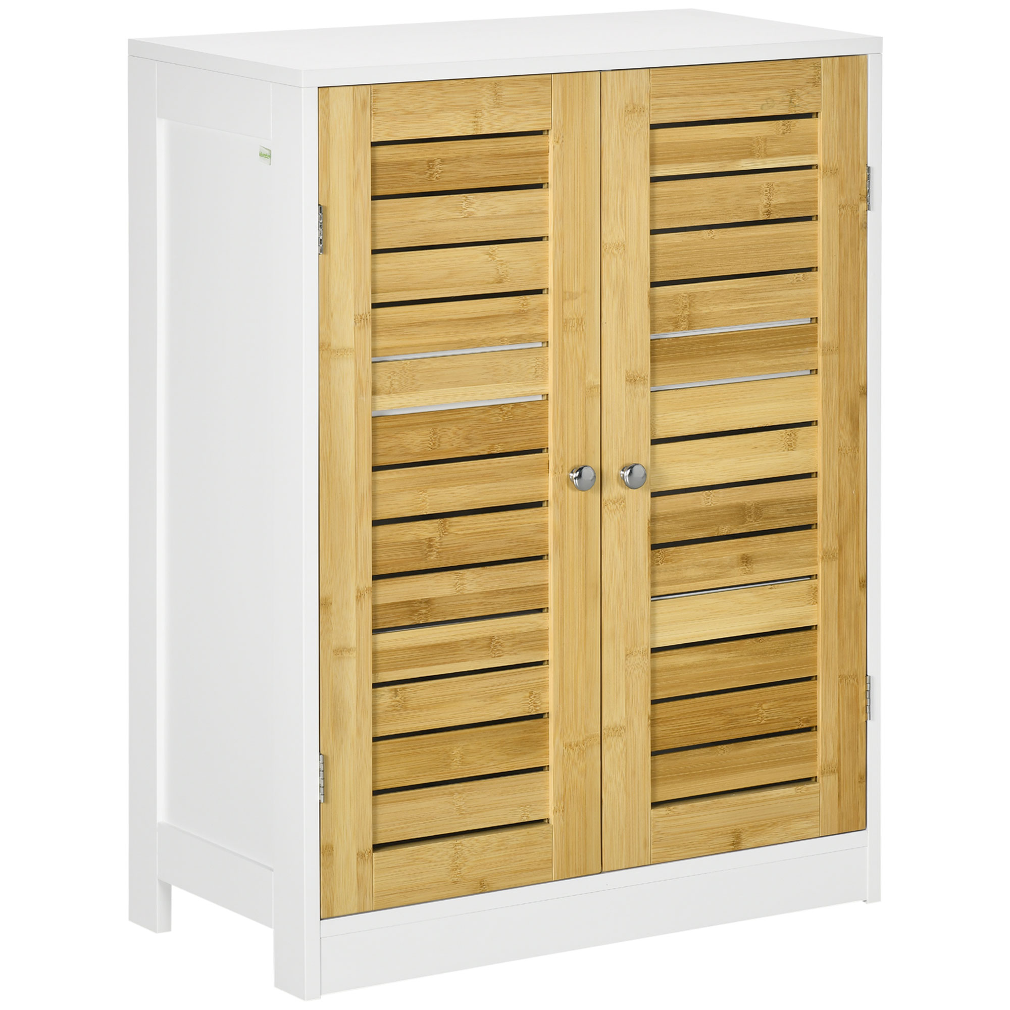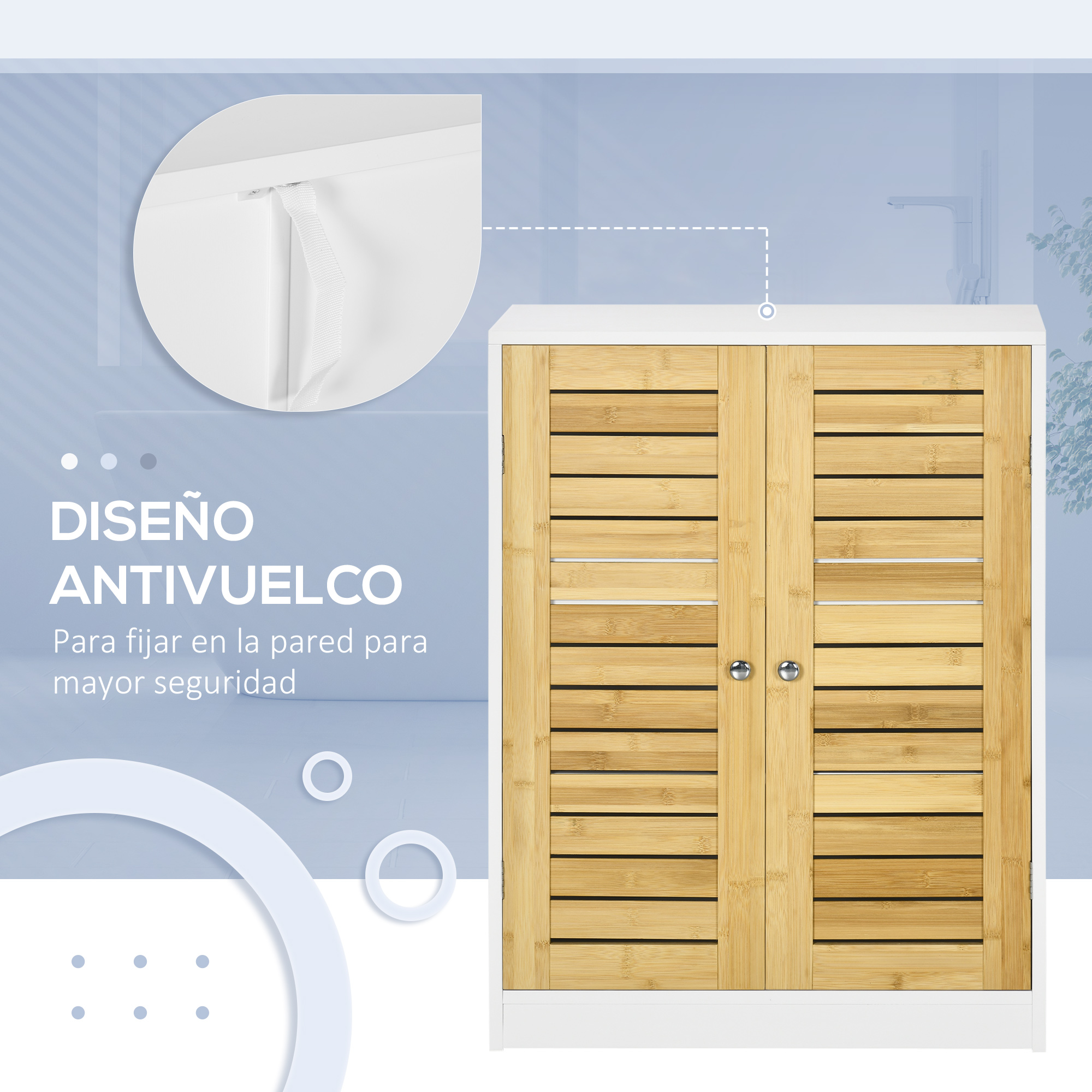 kleankin Armario Auxiliar de Baño Mueble Auxiliar de Baño con Puertas de Bambú y Estante Ajustable para Ducha Dormitorio Aseo 60x30x80 cm Blanco y Natural