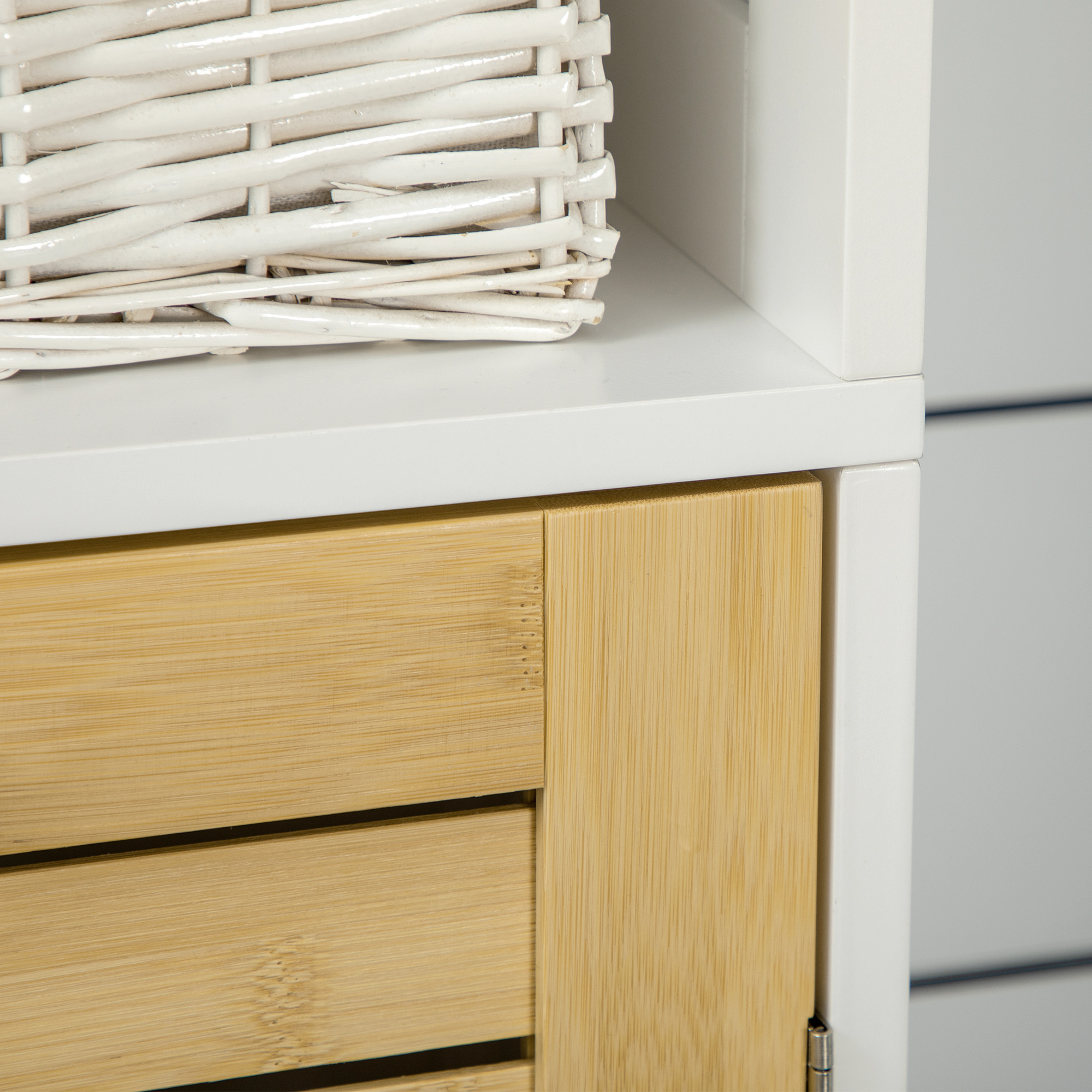 kleankin Armario Alto de Baño Columna Auxiliar de Baño con Puerta de Bambú y 3 Estantes de Almacenaje para Dormitorio Aseo 35x27x171 cm Blanco y Natural