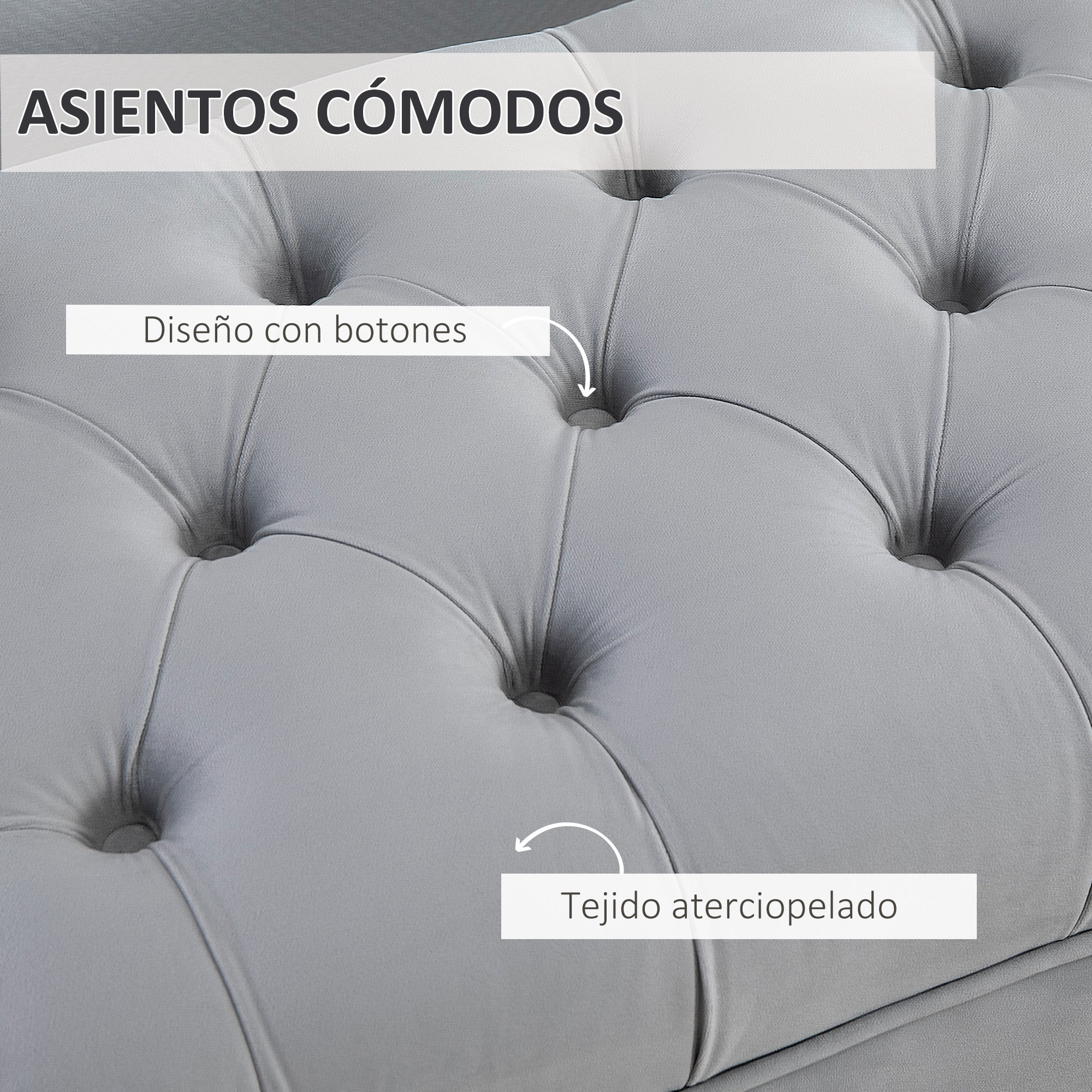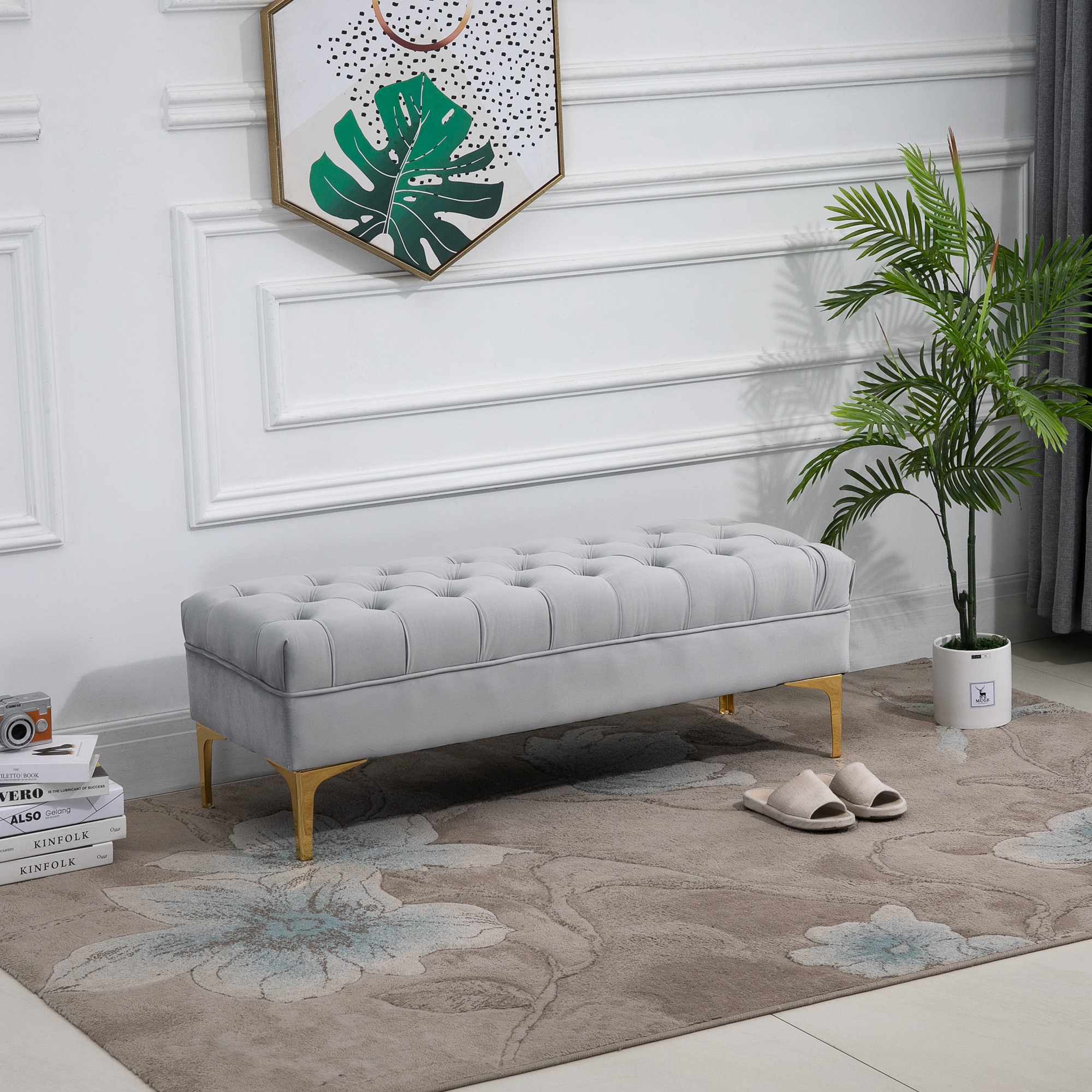 ¿Estás buscando un banco de asiento vintage y práctico? HOMCOM tiene la solución con este banco de pie de cama para dormitorio. Este banco acolchado puede servir como banco de asiento, banco para el pie de la cama o banco de entrada, y es adecuado para la sala de estar, comedor, dormitorio o pasillo. Está cubierto de tela aterciopelada con un cojín acolchado de espuma gruesa para una experiencia de asiento cómoda. Características: Banqueta de dormitorio de estilo elegante con asiento con mechones de botones Gracias a su versatilidad, se puede utilizar como asiento junto a la ventana, banco al final de la cama o banco de entrada El acolchado de espuma gruesa de alta densidad (26D) con tapizado con tacto aterciopelado ofrece una experiencia cómoda de sentado Base elevada equipada con patas con acabado dorado Estructura robusta de madera contrachapada Banqueta de dormitorio cuenta con pies con almohadillas protectoras para proteger el suelo de rayones Se requiere montaje Especificaciones: Color: gris claro, dorado Material: terciopelo sintético (100% poliéster), relleno de espuma de 26D, metal, madera contrachapada Medidas totales: 118x45x42 cm (LxANxAL) Medidas del asiento: 118x45x26 cm (LxANxAL) Espesor de la espuma: 12 cm Medidas de las patas: 4x4x16 cm (LxANxAL) Carga máxima: 120 kg Referencia: 831-163V01GY El paquete incluye: ● 1 x Banco para pie de cama; ● 1 x Manual de instrucciones