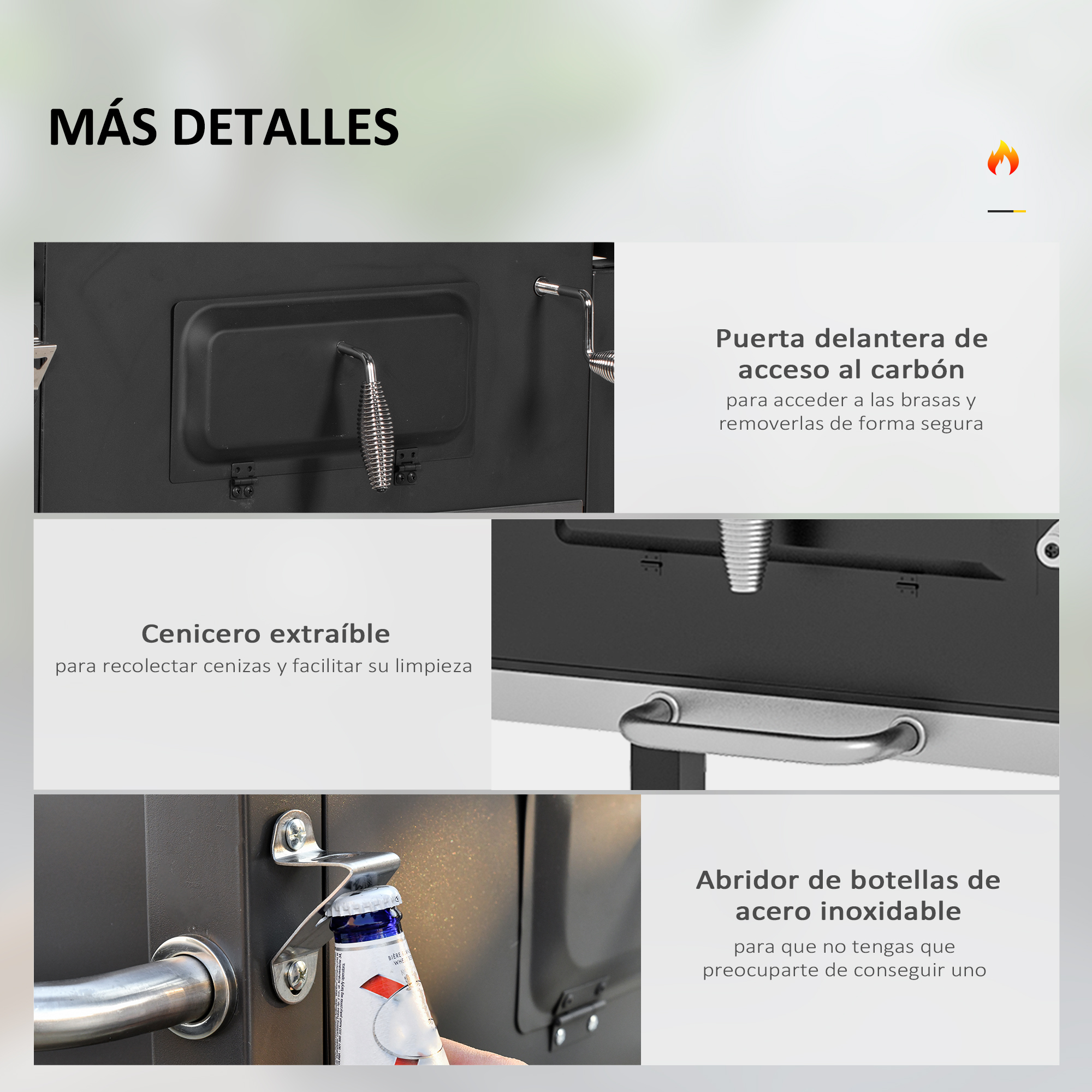 ¿Te gusta hacer barbacoas con amigos y familiares? Esta barbacoa de carbón con ruedas Outsunny es la opción perfecta para cocinar al aire libre. Permite cocinar a altas temperaturas con la tapa cerrada para cocer y asar tus alimentos de una forma más rápida y eficiente, ya que retiene el calor ahorrando combustible. La parrilla ofrece una amplia superficie para cocinar todo tipo de alimentos, como verduras, pinchos, hamburguesas, patatas y más. Características: Barbacoa de carbón con parrillas de cocción de acero esmaltado y rejilla para calentar de acero, todas aptas para uso alimentario Tapa con mango de acero inoxidable y termómetro Bandeja de carbón ajustable para controlar el calor y la cocción Tiene un cajón extraíble, recoge cenizas para facilitar la limpieza posterior a la cocción El estante lateral plegable y el estante inferior ofrecen un espacio adicional donde puedes guardar alimentos y utensilios para cocinar Barbacoa diseñada en forma de carro con gran estabilidad, que permite moverla según tus necesidades gracias a sus 2 ruedas Especificaciones: Color: negro Material: acero inoxidable y metal Medidas totales: 113x65x108 cm (LxANxAL) Medidas del área de la parrilla: 55×41,6 cm. Cada parrilla mide 27,5×41,6 cm (LxAN) Bandeja de carbón: 51x37x2,5 cm (LxANxAL) Estante lateral: 33,5×48,5 cm (LxAL) Puerta frontal: 34×15,5 cm (LxAL) Estante inferior: 61x37x2 cm (LxANxAL) Medidas de las ruedas: Ø15×3,5 cm (DxAL) Carga máxima: 20 kg (parrilla), 10 kg (estante), 3 kg (rejilla de calentamiento) Combustible: carbón (no se puede utilizar llama abierta) Referencia: 846-013V00GY El paquete incluye: ● 1 x Barbacoa de carbón; ● 1 x Manual de instrucciones