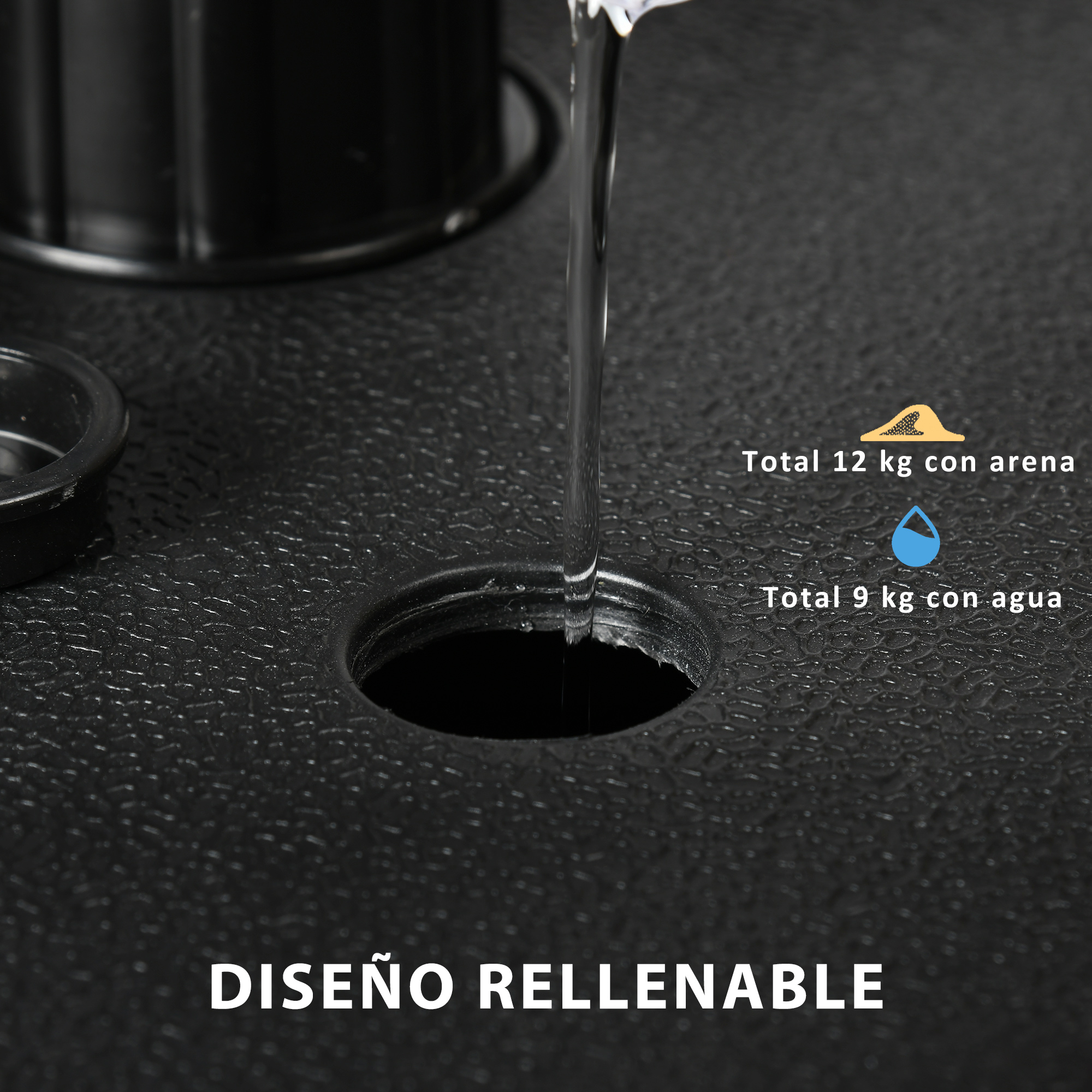 Si tienes una sombrilla en casa, tienes que asegurarte también de tener un buen soporte. Por esto, Outsunny te ofrece esta base para parasol que se puede rellenar. Llénala con agua, arena o ambas cosas a la vez, y obtén un soporte firme, estable y seguro. Tiene el orificio de drenaje y llenado en la parte superior para mayor comodidad, ya que si quieres meterle agua podrás hacerlo incluso insertando la manguera del jardín. Más fácil de usar imposible. Características: Base compatible con sombrillas de menos de 2,5 m de diámetro y postes de 32 mm a 38 mm Adecuada para estabilizar los parasoles que colocamos en el centro de la mesa Hecho de plástico PE resistente para resistir los elementos exteriores Pesa hasta 9 kg cuando el soporte está lleno de agua y 12 kg cuando está lleno de arena El puerto de llenado en la parte superior facilita el llenado y la limpieza de la base Adecuado para tener en el jardín, en el patio, al lado de la piscina u otros espacios al aire libre Requiere montaje Especificaciones: Color: negro Material: PE Medidas total: 38x38x12 cm (LxANxAL) Medidas de la base inferior: 38x38x7 cm (LxANxAL) Peso después del llenado: 9 kg (agua), 12 kg (arena) Recomendado para mástiles de: Ø32 mm, Ø38 mm Referencia: 84D-230V00BK Referencias de parasoles Outsunny compatibles: 84D-017, 84D-097 Nota: Por favor, mide el diámetro de tu sombrilla antes de comprar el producto para asegurarte de su compatibilidad El paquete incluye: ● 1 x Base para sombrilla; ● 1 x Manual de instrucciones