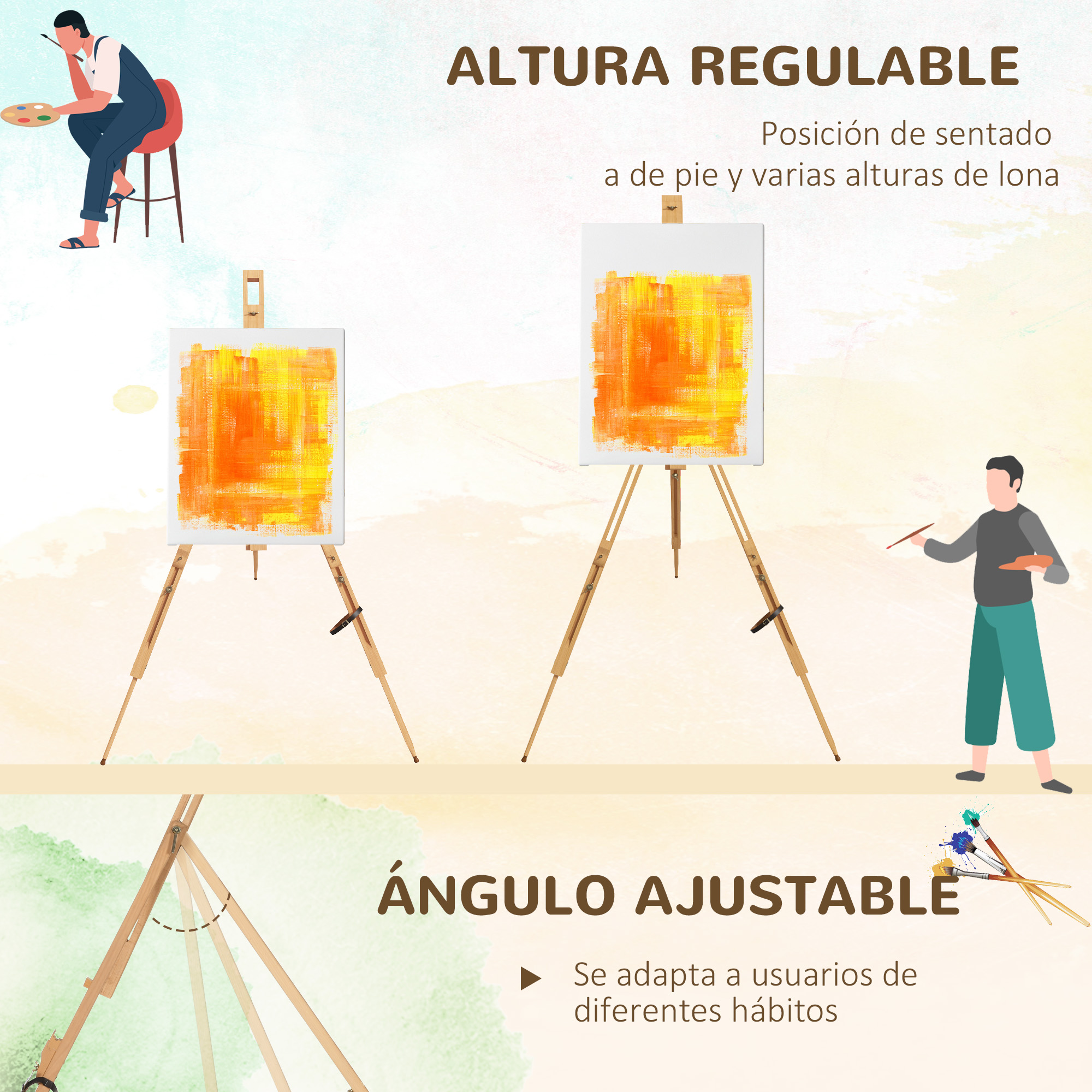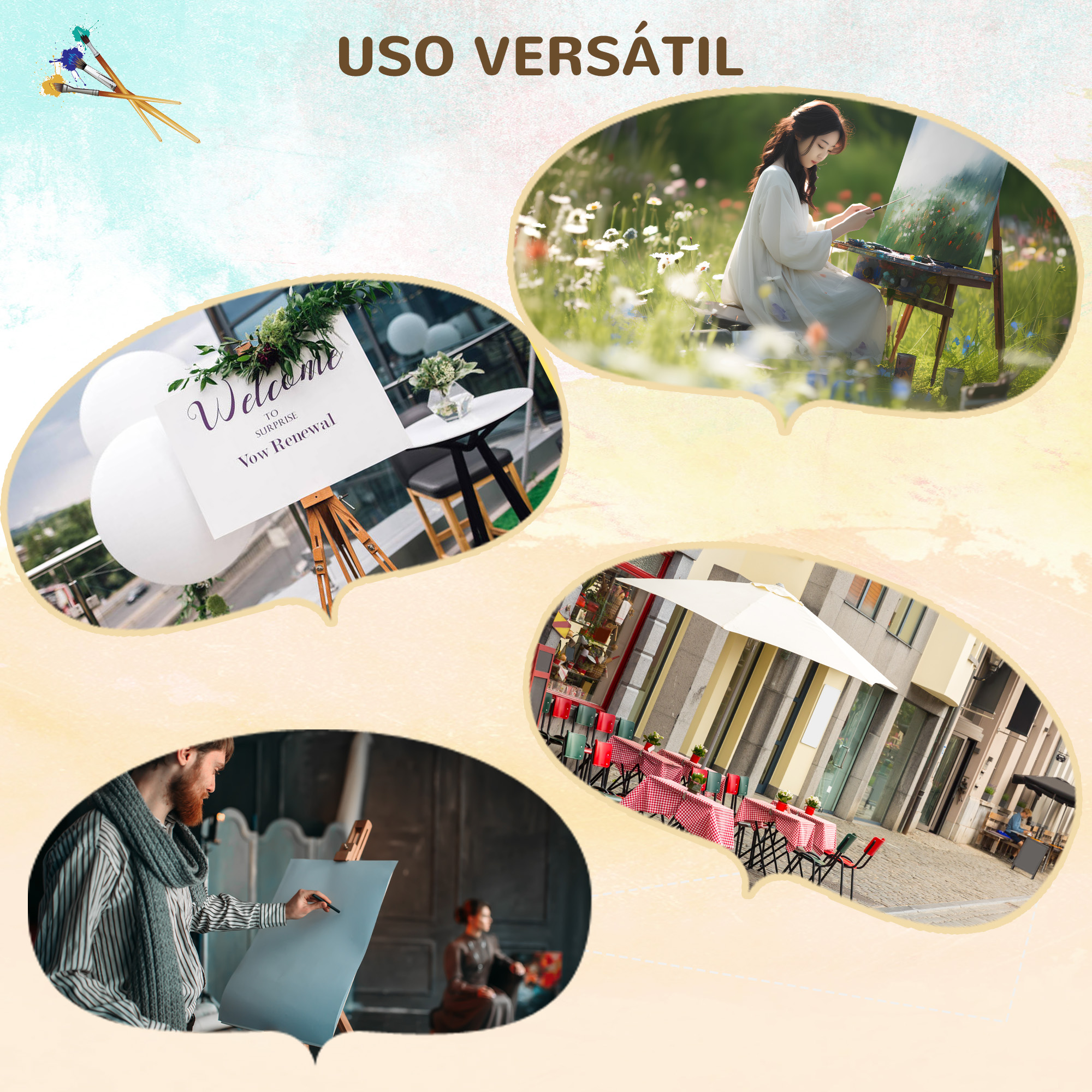 Fabricado en madera de haya, este caballete para pintar de Vinsetto no solo ofrece un soporte resistente y estable gracias a su diseño de trípode, sino que también se adapta a tus necesidades. Con su altura ajustable, puedes pintar cómodamente tanto de pie como sentado, lo que te permite mantener una postura adecuada y reducir la fatiga. Además, su diseño plegable lo hace fácil de transportar y almacenar, lo que lo convierte en una herramienta indispensable para cualquier artista. Características: Caballete plegable ideal para los amantes del arte, artistas, escuelas, estudios, o incluso para exponer cuadros ngulo ajustable para pintar de pie o sentado Estructura de madera de haya con diseño de trípode para mayor estabilidad Estructura plegable con correa de fijación Se requiere montaje Especificaciones: Color: madera natural Material: madera de haya Medidas totales: 93x84x183 cm (LxANxAL) Medidas estando plegado: 88x13x7 cm (LxANxAL) Altura máxima del lienzo: 107 cm Referencia: 914-027V00ND El paquete incluye: ● 1 x Caballete de pintura; ● 1 x Manual de instrucciones