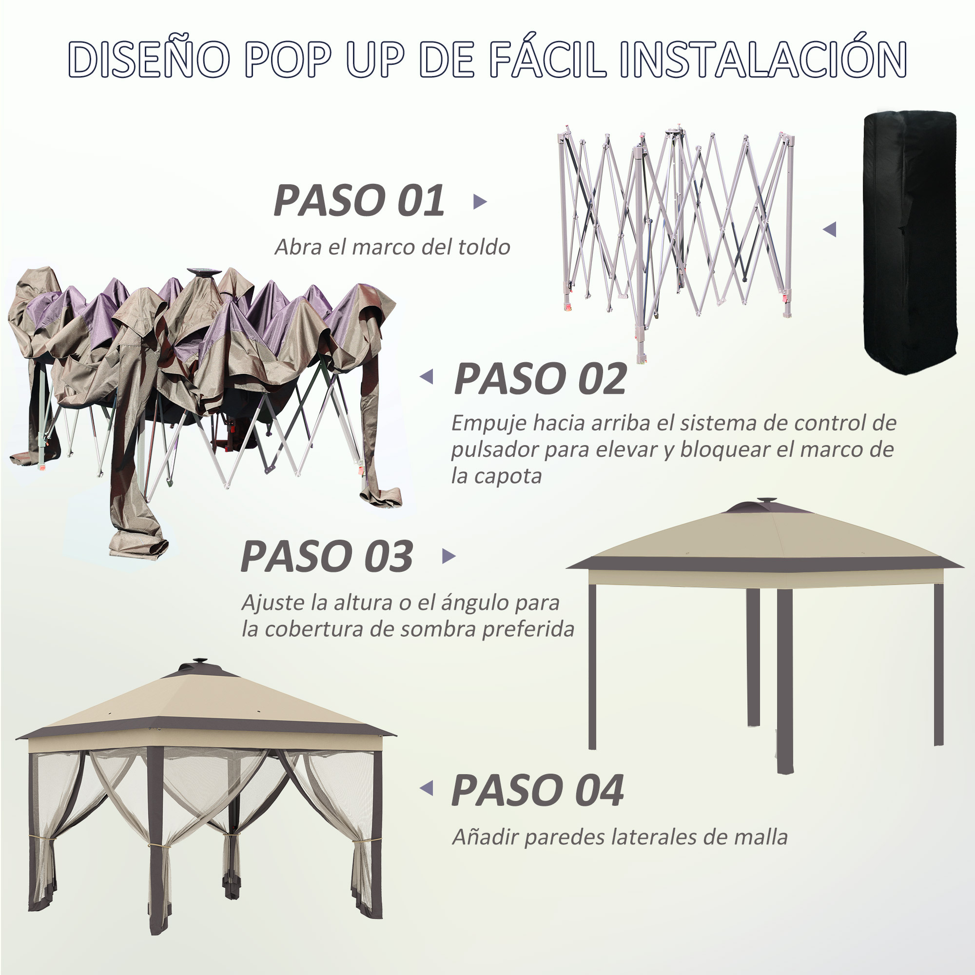 Haz que tu jardín sea más práctico y bonito con este cenador plegable de Outsunny. El marco de metal es ajustable en altura, mientras que las paredes laterales con mosquitera, que son totalmente extraíbles, ofrecen un área de relajación lejos del sol y los insectos. ¡Disfruta de los momentos al aire libre con esta práctica carpa plegable con paredes! Características: Cuenta con 17 luces LED solares, que crean el ambiente perfecto y cálido Las luces también pueden ser cargadas mediante USB Estructura de metal con recubrimiento de polvo plegable, para que los usuarios puedan montar y desmontar en cuestión de minutos Doble techo para una buena ventilación y resistencia al viento Patas ajustables en 3 niveles de altura para ajustar al lugar y a tus necesidades Equipado con una práctica bolsa para facilitar su traslado y transporte Requiere montaje Especificaciones: Color: beige Material: metal, tela Oxford de 160 g/m², revestimiento de PA y tela de malla de 35 g/m² Medidas totales: 330x330x290 cm (LxANxAL) Altura de los aleros: 200 cm Altura de la viga: 185 cm Medidas de los laterales: 306×200 cm (LxAL) Medidas plegadas: 21,5×21,5×116 cm (LxANxAL) Distancia de control remoto: 3-8 m Luz LED: 4,1 V, 0,43 A, 1,8 W, 160-220 nm Capacidad total de la batería: 6000 mah, tiempo de descarga: 8-9 horas Referencia: 84C-302V01BG Nota: No usar el producto en caso de lluvia o condiciones climáticas desfavorables El paquete incluye: ● 1 x Cenador plegable; ● 4 x Cuerda de tensión; ● 12 x Estaca de tierra; ● 1 x Bolsa de transporte; ● 1 x Manual de instrucciones
