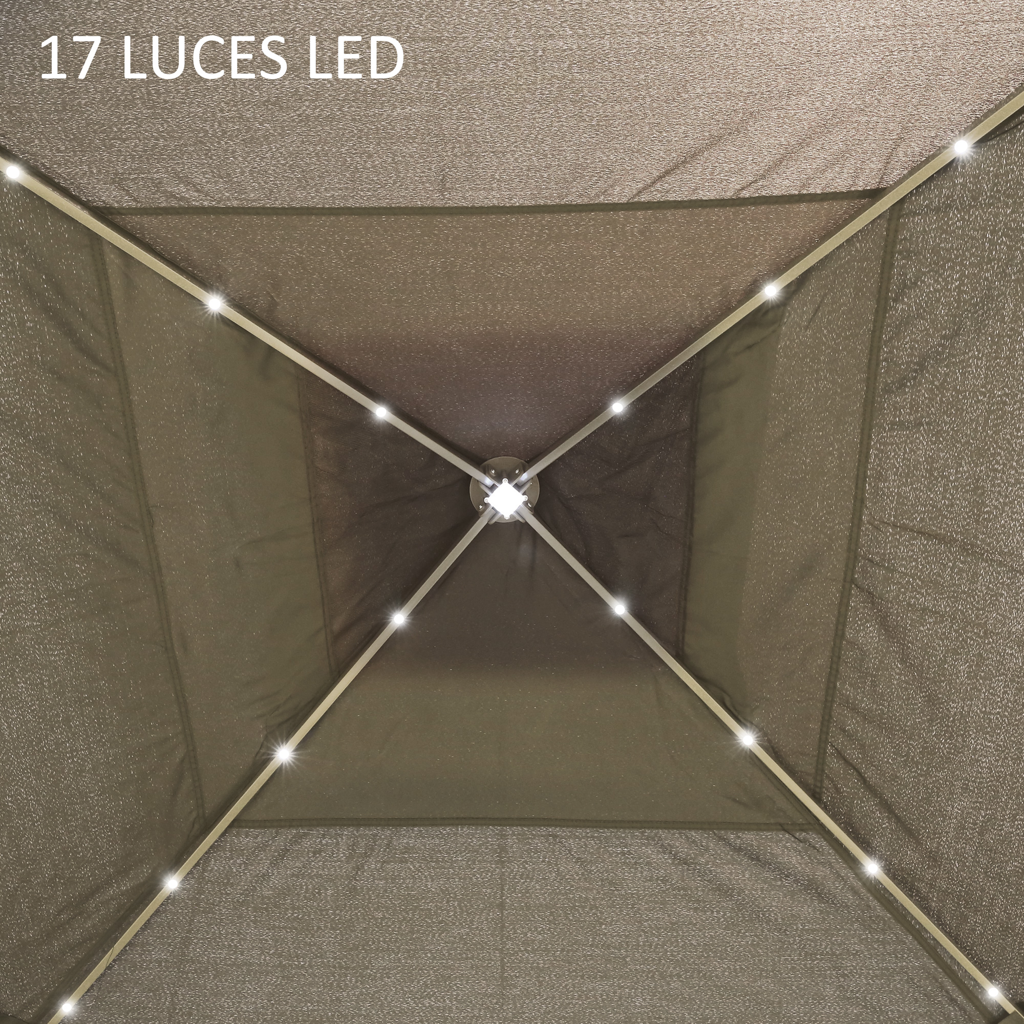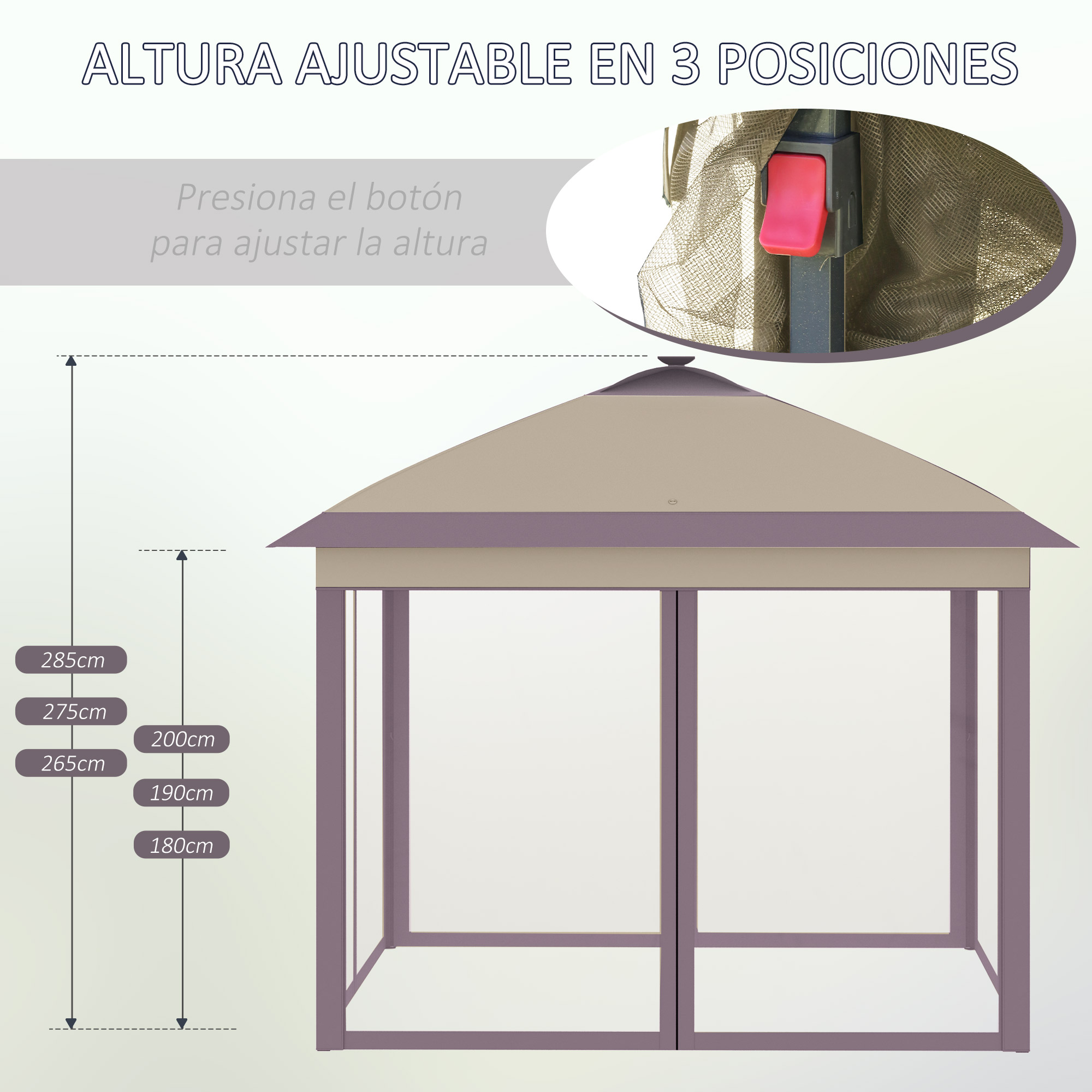 Haz que tu jardín sea más práctico y bonito con este cenador plegable de Outsunny. El marco de metal es ajustable en altura, mientras que las paredes laterales con mosquitera, que son totalmente extraíbles, ofrecen un área de relajación lejos del sol y los insectos. ¡Disfruta de los momentos al aire libre con esta práctica carpa plegable con paredes! Características: Cuenta con luces LED solares, que crean el ambiente perfecto y cálido Las luces también pueden ser cargadas mediante USB Estructura de metal con recubrimiento de polvo plegable, para que los usuarios puedan montar y desmontar en cuestión de minutos Doble techo para una buena ventilación y resistencia al viento Mosquiteras en los 4 lados, para mantener alejados a los insectos, dejar pasar el aire y ofrecer mayor privacidad Patas ajustables en 3 niveles de altura para ajustar al lugar y a tus necesidades Equipado con una práctica bolsa para facilitar su traslado y transporte Incluye clavijas y cuerdas para fijarlo al suelo Requiere montaje Especificaciones: Color: beige Materiales: metal, tela Oxford y tela de malla Medidas totales: 330x330x285 cm (LxANxAL) Altura de los aleros: 200 cm Altura de la viga: 190 cm Medidas de los laterales de malla: 306×200 cm (LxAL) Medidas cuanto está plegado: 21,5×21,5×116 cm (LxANxAL) Luz LED: 4,1 V, 0,43 A, 1,8 W, 160-220 nm Capacidad de la batería: 4000 mah, tiempo de descarga: 8-9 horas Referencia: 84C-302BG Nota: No usar el producto en caso de lluvia o condiciones climáticas desfavorables El paquete incluye: ● 1 x Cenador plegable; ● 4 x Cuerda de tensión; ● 8 x Estacas de tierra; ● 1 x Bolsa de transporte; ● 1 x Manual de instrucciones