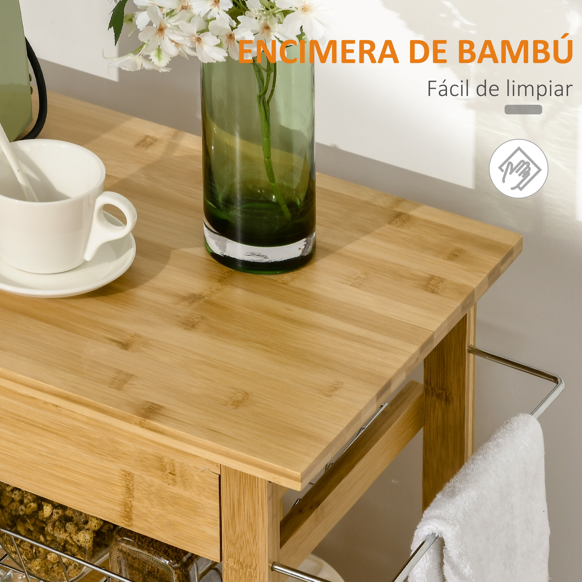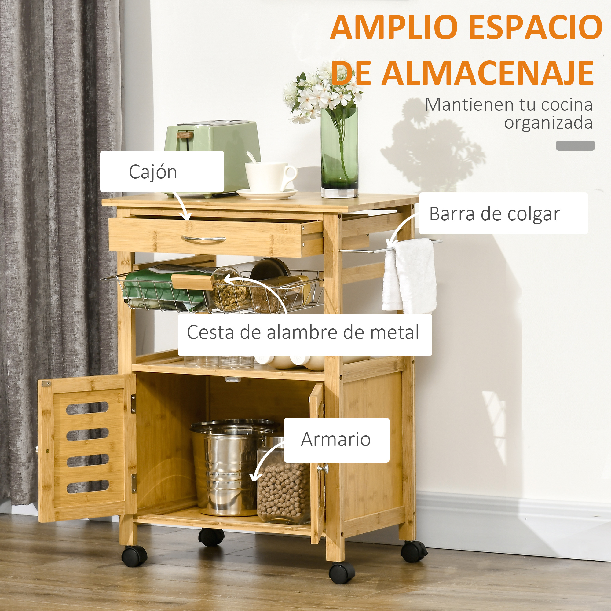 HOMCOM Carrito de Cocina con Ruedas de Bambú Carro de Servicio con 1 Cajón Cesta Extraíble Barra Lateral y Armario para Salón 66x36x79 cm Natural