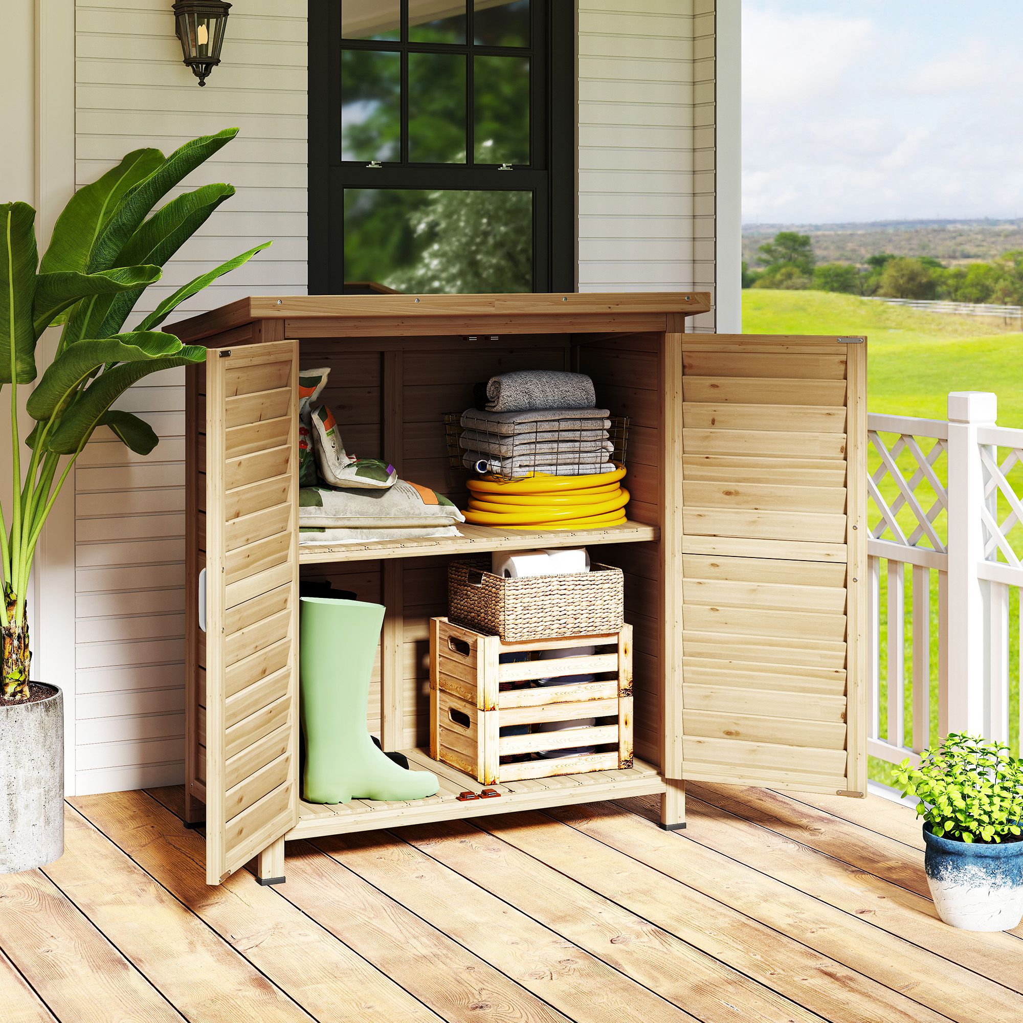 Outsunny Cobertizo de Almacenamiento de Madera para Jardín 87×46,5×96,5 cm con 2 Estantes Interiores 2 puertas de Buena Ventilación y Techo Inclinado para Exterior Terreza Natural