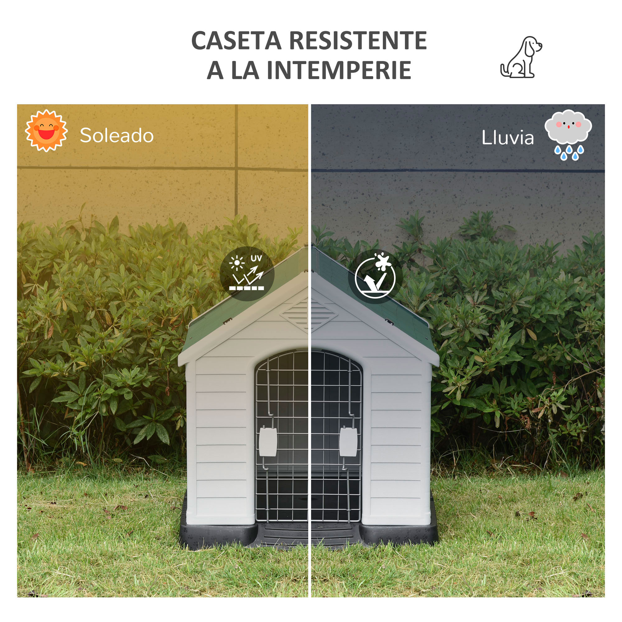 Esta caseta de Pawhut es ideal para perros de tamaño mediano. Con un diseño estilo cabaña, cuenta con un techo a dos aguas para que el agua de la lluvia no se acumule. Ideal para interior y exterior, tiene una puerta de metal que se puede abrir por ambos lados y la base tiene dos orificios exteriores para fijarla con 2 piquetas en suelos blandos. Elegante y funcional, para que tu perro descanse cómodamente en el jardín, balcón, etc. Características: Adecuada para perros de tamaño mediano como Beagle, Border Collie, Bull Terrier, etc. Hecha de PP resistente y puerta de metal con recubrimiento resistente a la corrosión Fácil de limpiar gracias a su diseño y materiales Con base elevada para proteger a tu perro de la lluvia, humedad y mosquitos Techo inclinado a dos aguas para que el agua no se encharque Uso tanto en interiores como exteriores Puerta de malla metálica desmontable y bidireccional con dos cerraduras de presión Requiere montaje Especificaciones: Color: verde, blanco y negro Material: PP y metal Medidas totales: 78x87x81 cm (LxANxAL) Medidas interiores (base no incluida): 71x76x47-72 cm (LxANxAL) Altura de la base: 8 cm Medidas de la puerta: 33×51 cm (LxAL) Carga máxima: 30 kg Referencia: D02-066V01 El paquete incluye: – 1 x Caseta para perros; – 2 x Estaca de tierra; – 1 x Manual de instrucciones