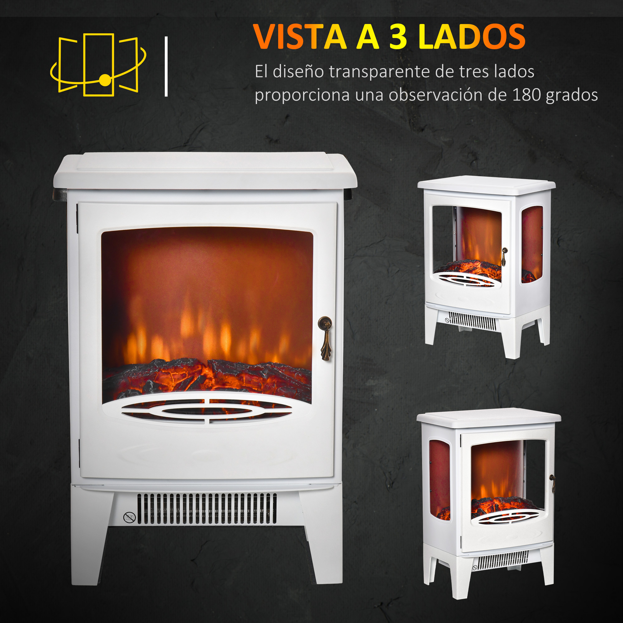 ¿Quieres que tu hogar sea más cálido y acogedor? ¡Elige esta chimenea eléctrica de HOMCOM para calentar y decorar tus espacios con un solo producto! Está equipada con un elegante efecto llama con brillo ajustable, que puedes usar por separado del calefactor. Gracias a los 3 lados transparentes, tienes una vista óptima de la llama y los 2 niveles de calor te permiten calentar tus espacios a la temperatura que prefieras. Características: Chimenea eléctrica independiente con puerta frontal y diseño transparente en 3 lados para una mejor visión Cubre un área de 20-25 m², ideal para el salón, dormitorio y más Dos modos de calefacción de 900W y 1800W para todas tus necesidades de calor La llama realista de LED y la función de calefacción pueden ser utilizadas de manera independiente Control de brillo y temperatura del calor Chimenea decorativa con sistema de apagado automático en caso de sobrecalentamiento Cable de alimentación de 1,5 m con enchufe Se requiere montaje Especificaciones: Color: blanco Material: acero, ABS Medidas totales: 39x26x54,8 cm (LxANxAL) Medidas de la ventana: 27×26 cm (frontal), 13,5×24,5 cm (laterales) Potencia ajustable: 900W, 1800W Área cubierta: 20-25 m² Voltaje: 220-240V, 50Hz Cable de alimentación: 1,5 m Nivel de ruido: 50 dB Referencia: 820-222V90WT Nota: No cubras el calefactor ni obstruyas la ventilación inferior para evitar el sobrecalentamiento El paquete incluye: ● 1 x Chimenea eléctrica; ● 1 x Manual de instrucciones