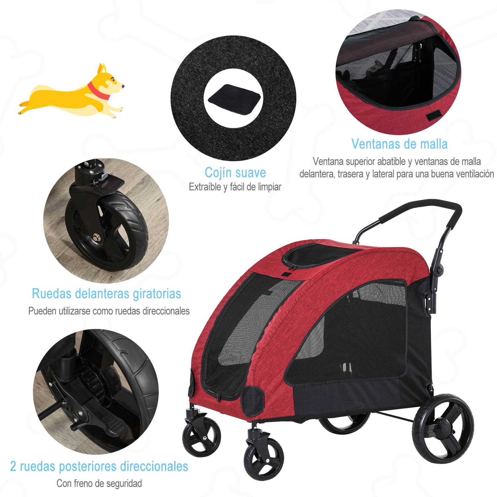 Este cochecito de PawHut para mascotas es ideal para llevar a tu mascota a un parque o centro comercial. Tiene 4 ventanas de malla con muy buena ventilación y suficiente espacio interno. Cuenta con una correa de seguridad para llevar a tu mascota protegida en todo momento. Las ruedas delanteras de este carrito pueden girar 360 ° y las posteriores están equipadas con frenos. Es especialmente adecuado para perros de tamaño mediano o grandes. Características: Cochecito con gran espacio interior, con correa de seguridad Hecho de acero resistente y tejido Oxford Adecuado para perros medianos y grandes, puede soportar hasta 35 kg Con 4 ruedas grandes, 2 ruedas giratorias de 360º y 2 con frenos Las ventanas superiores y laterales son transpirables, ofreciendo una óptima ventilación y visibilidad El cojín del asiento es extraíble, lo que facilita su limpieza Fácil de montar Especificaciones: Color: rojo Material: acero y tela Oxford Medidas totales: 98x82x110 cm (LxANxAL) Medidas interiores: 80x64x64 cm (LxANxAL), 15 cm sobre el suelo Medidas de la puerta delantera: 33×55 cm (LxAL) Medidas de la ventana superior: Ø50 cm Medidas de la ventana lateral: 52×37 cm (LxAL) Medidas de la ventana posterior: 60×15 cm (LxAL) Medidas de la bolsa: 43×23 cm (LxAL) Medidas de la rueda delantera: Ø16 cm (EVA) Carga máxima: 35 kg Referencia: D00-105RD Nota: Adecuado para puertas con una anchura mínima de 82 cm. mide el ancho de la puerta en tu hogar antes de comprarlo El paquete incluye: ● 1 x Cochecito para Mascotas