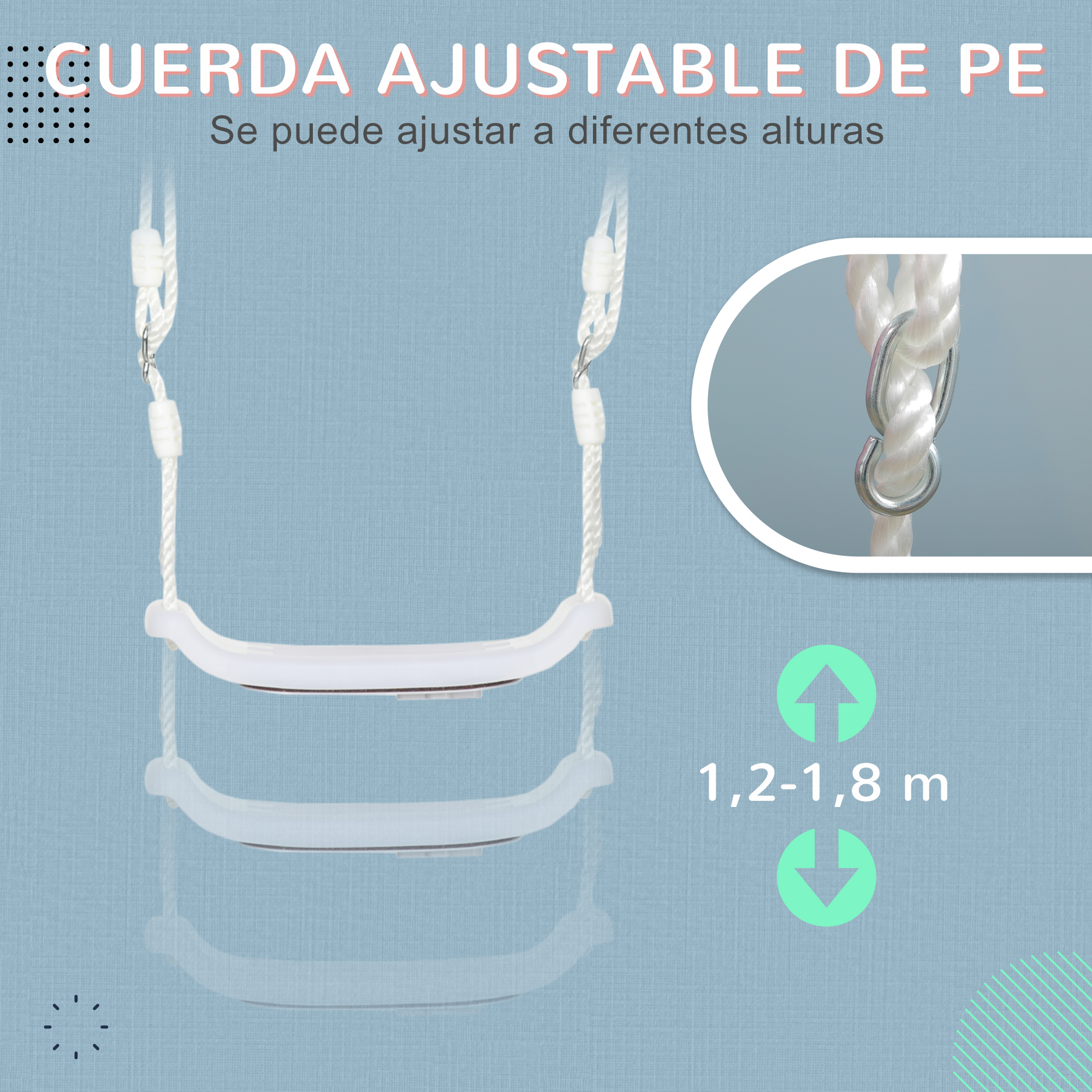 Dale a tus hijos mucha diversión en casa o en el jardín con este columpio infantil de Outsunny con luces LED. El columpio pasa así de un color a otro (3 diferentes), dando un ambiente festivo y haciendo que tu hogar sea acogedor y llamativo. También podrás colgar este cómodo columpio en cualquier lugar gracias a las cuerdas suministradas que son ajustables. Este columpio se convertirá rápidamente en el sitio favorito de tus hijos, donde sea que lo coloques. Características: Luces LED de colores para iluminar el columpio por la noche Las cuerdas se pueden ajustar a diferentes alturas (1,2-1,8 m) Se puede utilizar tanto en interiores como en exteriores Cuerda de PE fuerte para un fácil agarre y asiento resistente para mayor seguridad Fácil de montar Especificaciones: Color: blanco Material: polietileno Medidas totales: 39×16,5×120-180 cm (LxANxAL) Medidas del asiento: 39×16,5 cm (LxAN) Rango ajustable de la cuerda: 1,2-1,8 m Edad de certificación: +3 años Edad recomendada: 3-6 años Carga máxima: 70 kg Certificaciones: EN62115, EN71-1-2-3, EN71-8 Referencia: 344-060V00WT Nota: 4 pilas AA no incluidas. Asegúrate de que la altura del asiento sea superior a 35 cm desde el suelo. El paquete incluye: ● 1 x Columpio para niños; ● 2 x Anilla redonda; ● 2 x Anilla en forma de ocho