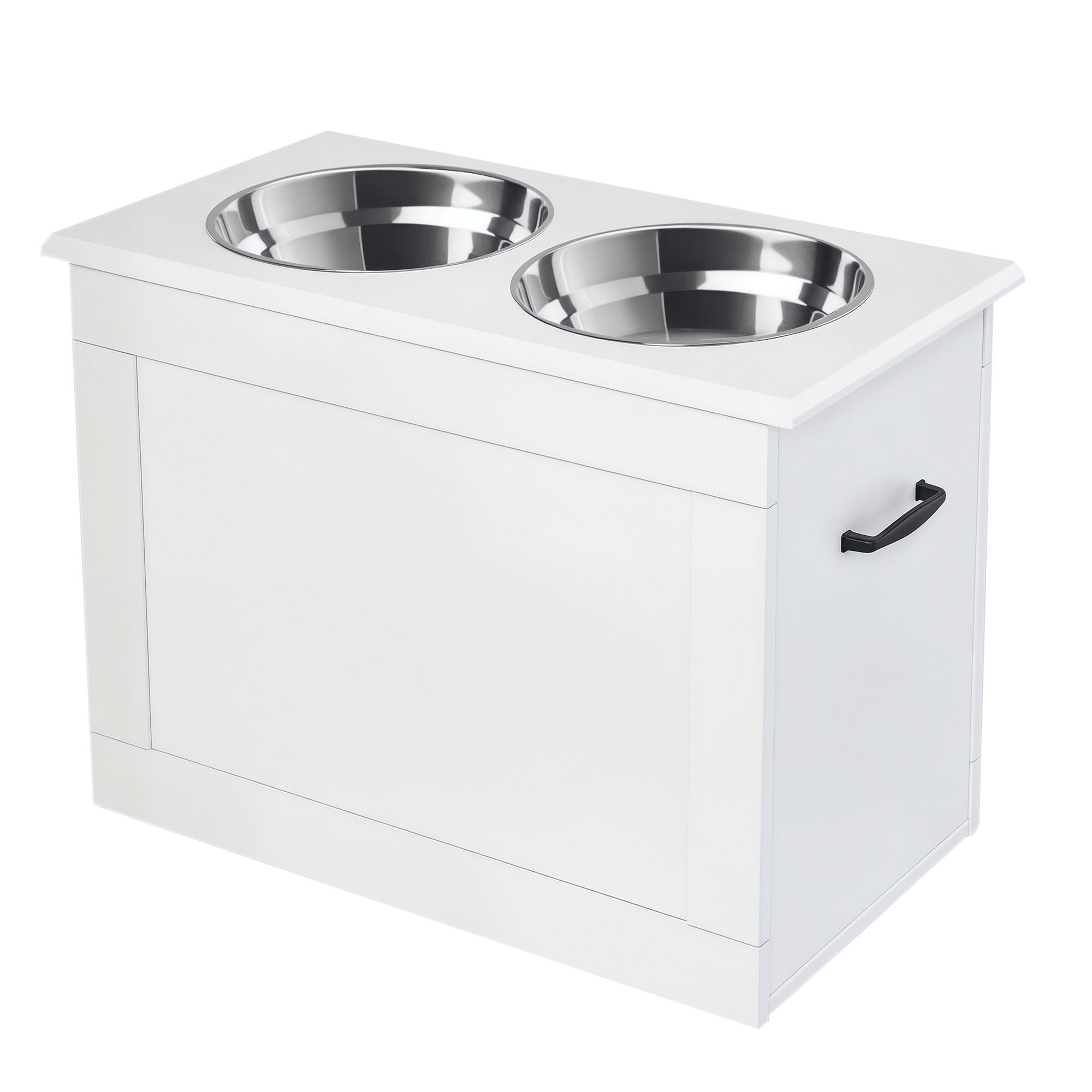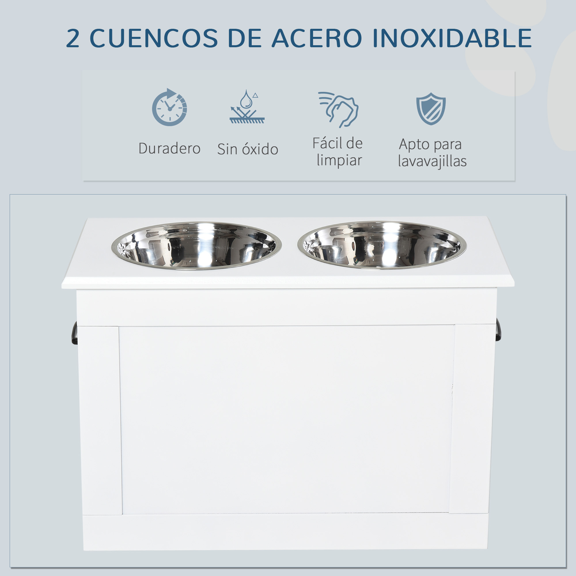 PawHut Comedero Perro Elevado con 2 Cuencos de Acero Inoxidable 2×2000 ml Comedero Elevado para Perros Grandes con Tapa Abatible y Almacenamiento Oculto Blanco