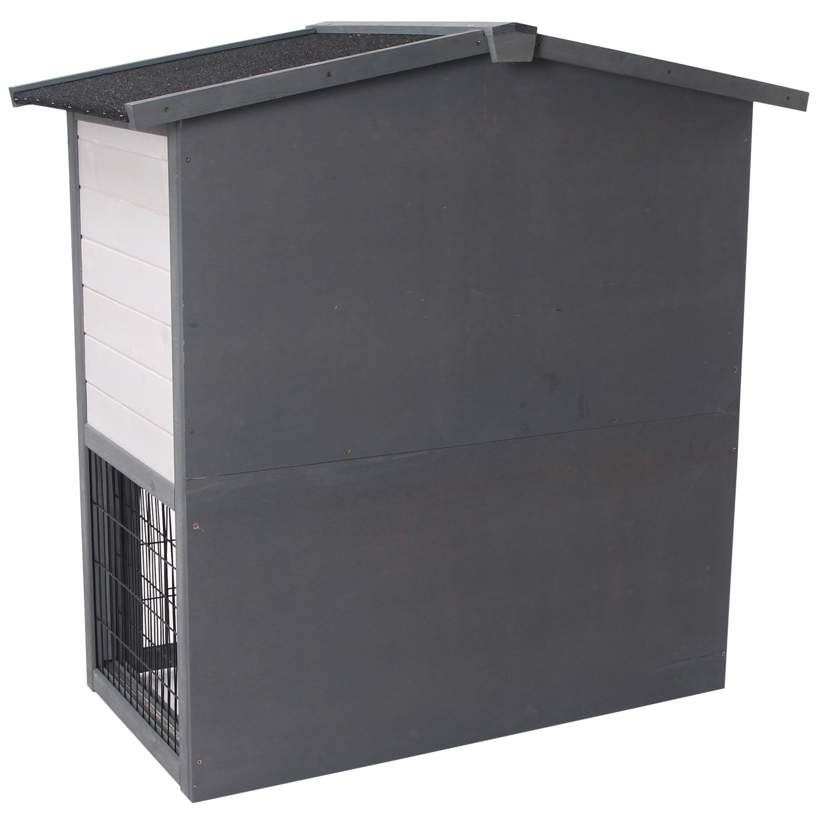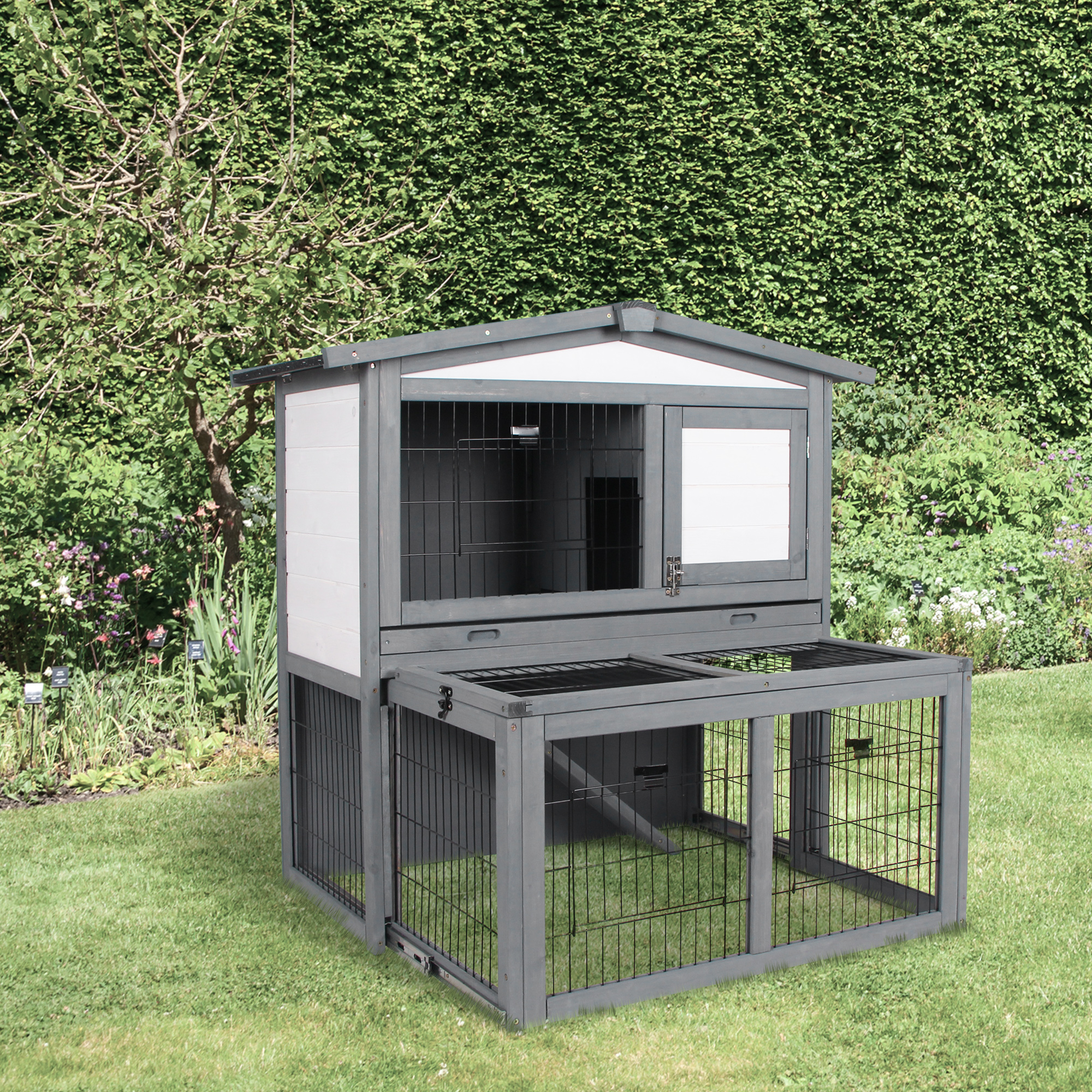 PawHut Conejera de Exterior Madera de 2 Niveles Jaula para Conejos Animales Pequeños con Techo Abatible Zona Abierto Telescópica Bandeja Extraíble y Rampa 101,5x90x100 cm Gris