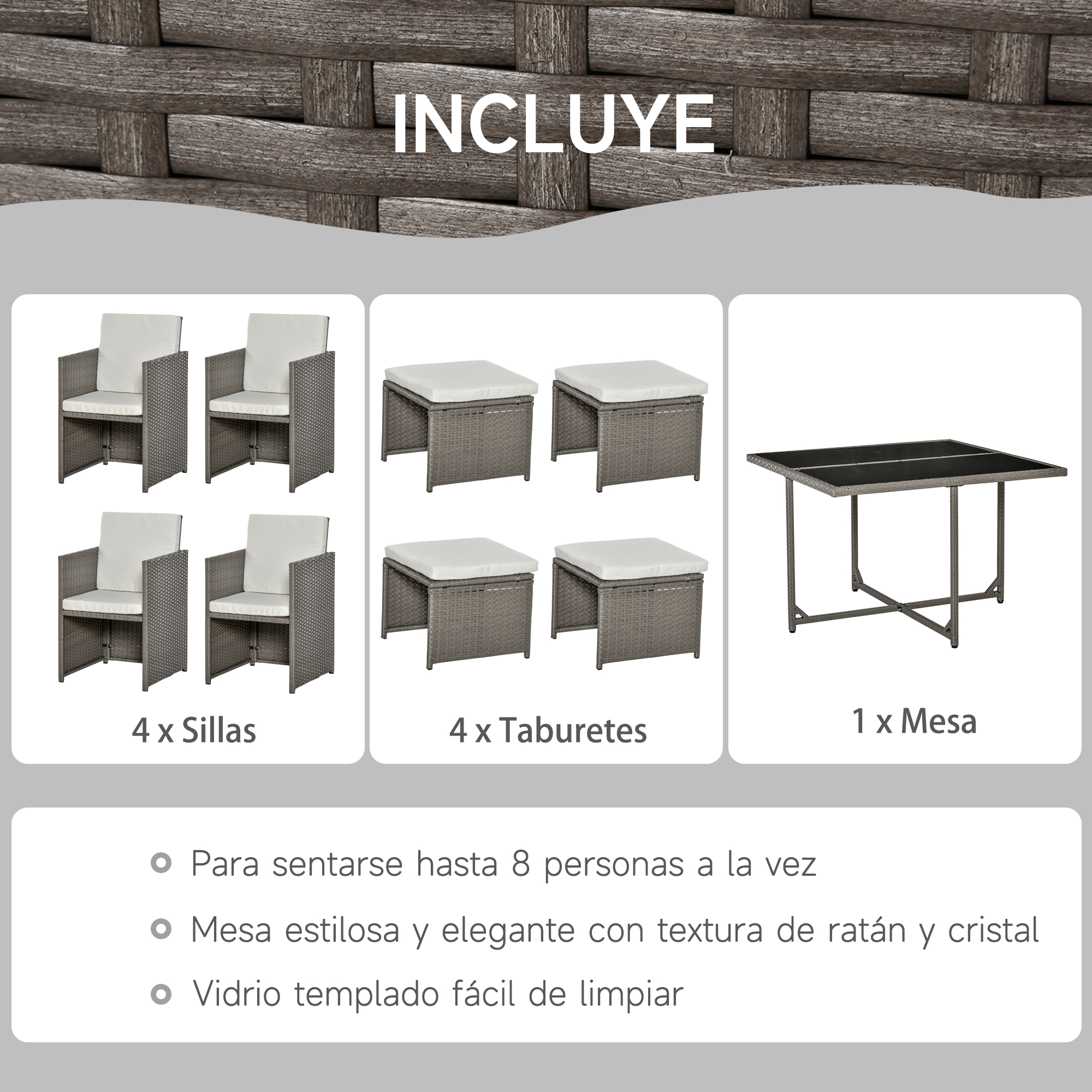 ¿Estás buscando muebles para tu jardín o terraza? Entonces no puedes perderte este conjunto de 9 piezas de Outsunny. Consta de una mesa cuadrada con 4 sillas y 4 taburetes. Con estructura metálica y cubierto de ratán PE y encimera de la mesa de cristal, es un conjunto moderno y actual. Y lo mejor de todo es que los asientos quedan recogidos debajo de la mesa sin ocupar espacio. Los taburetes bajo las sillas y las sillas bajo la mesa. ¡Una opción muy práctica y decorativa! Características: Cojines acolchados y con fundas hidrófugas lavables Mesa de comedor con almohadillas ajustables para los pies que pueden proteger el piso y agregar más estabilidad en terrenos irregulares No requieren apenas mantenimiento, se pueden limpiar con un paño húmedo Mesa con almohadillas ajustables para los pies para proteger el suelo y aportar mayor estabilidad en suelos irregulares CONSEJO: Se recomienda cubrir los muebles con una funda protectora cuando no estén en uso para alargar su durabilidad y proteger del polvo, lluvia, etc. Especificaciones: Color: gris y beige Material: PE ratán, acero y poliéster Medidas de la mesa: 109x109x72 cm (LxANxAL) Medidas de las sillas: 56x52x87 cm (LxANxAL) Medidas de los taburetes: 41x41x35 cm (LxANxAL) Altura del asiento (sin cojín): 39 cm Carga máxima: 120 (silla), 60 kg (taburete) y 50 kg (mesa) Referencia: 861-021CW El paquete incluye: ● 1 x Mesa; ● 4 x Silla; ● 4 x Taburete; ● 12 x Cojín; ● 1 x Manual de instrucciones