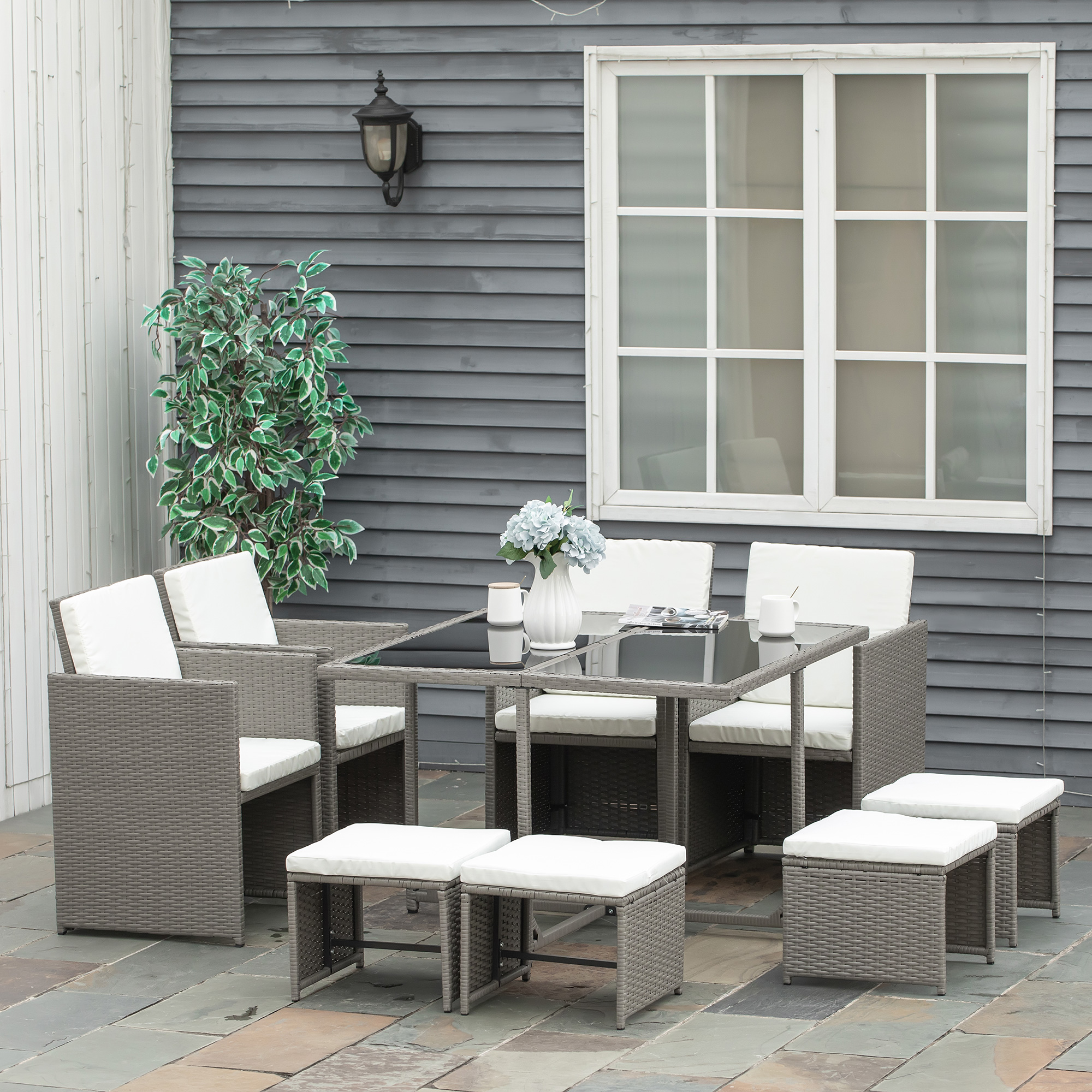 Outsunny Conjunto de Muebles de Jardín 9 Piezas de Ratán para Comedor Sillas Apilables con Cojines Extraíbles Lavables Mesa de Vidrio Templado para Exterior Patio Terraza Gris