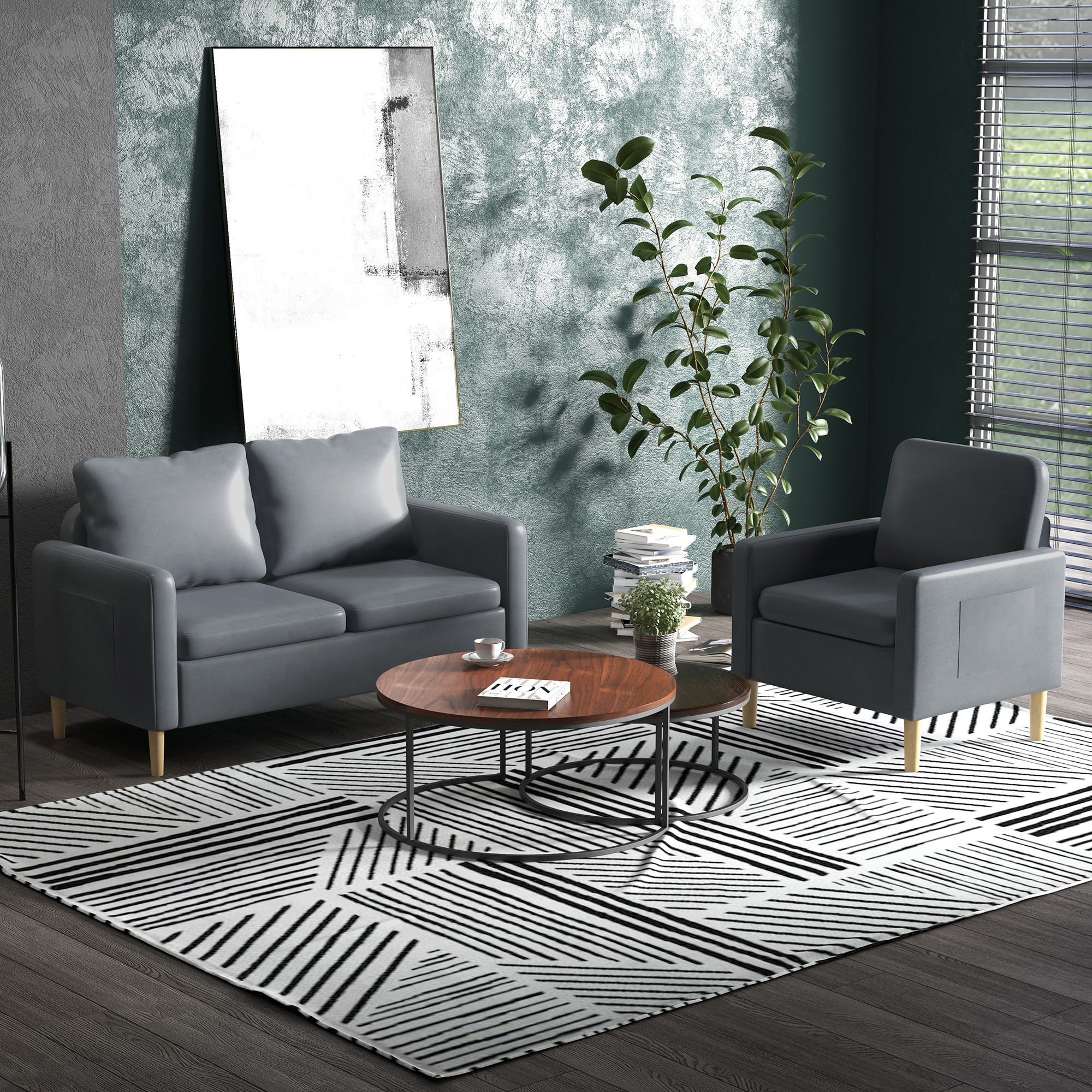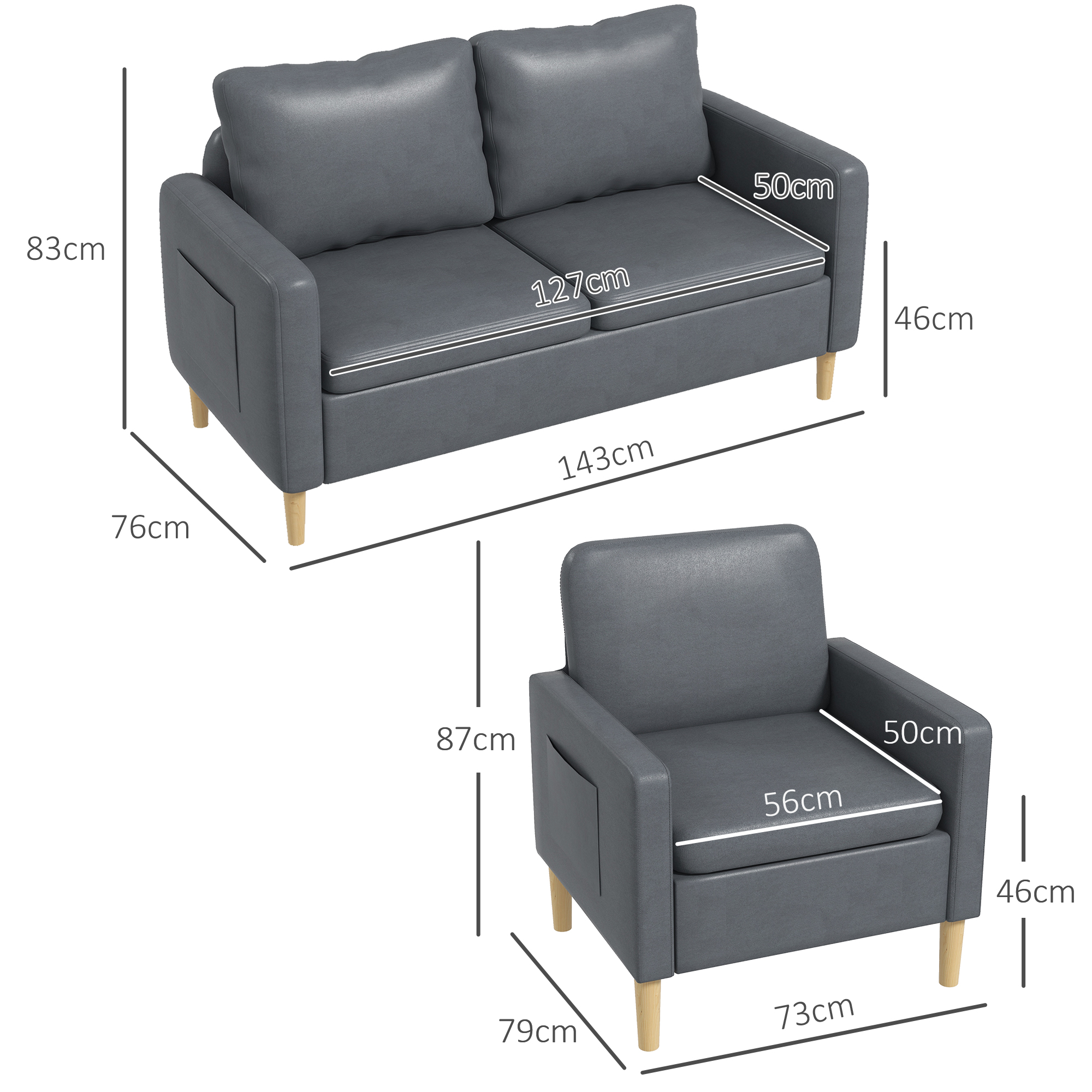 HOMCOM Conjunto de Sofá Incluye 1 Sofá de 2 Plazas y 1 Butaca de Salón con Bolsillos Laterales Reposabrazos y Patas de Madera para Dormitorio Oficina Gris
