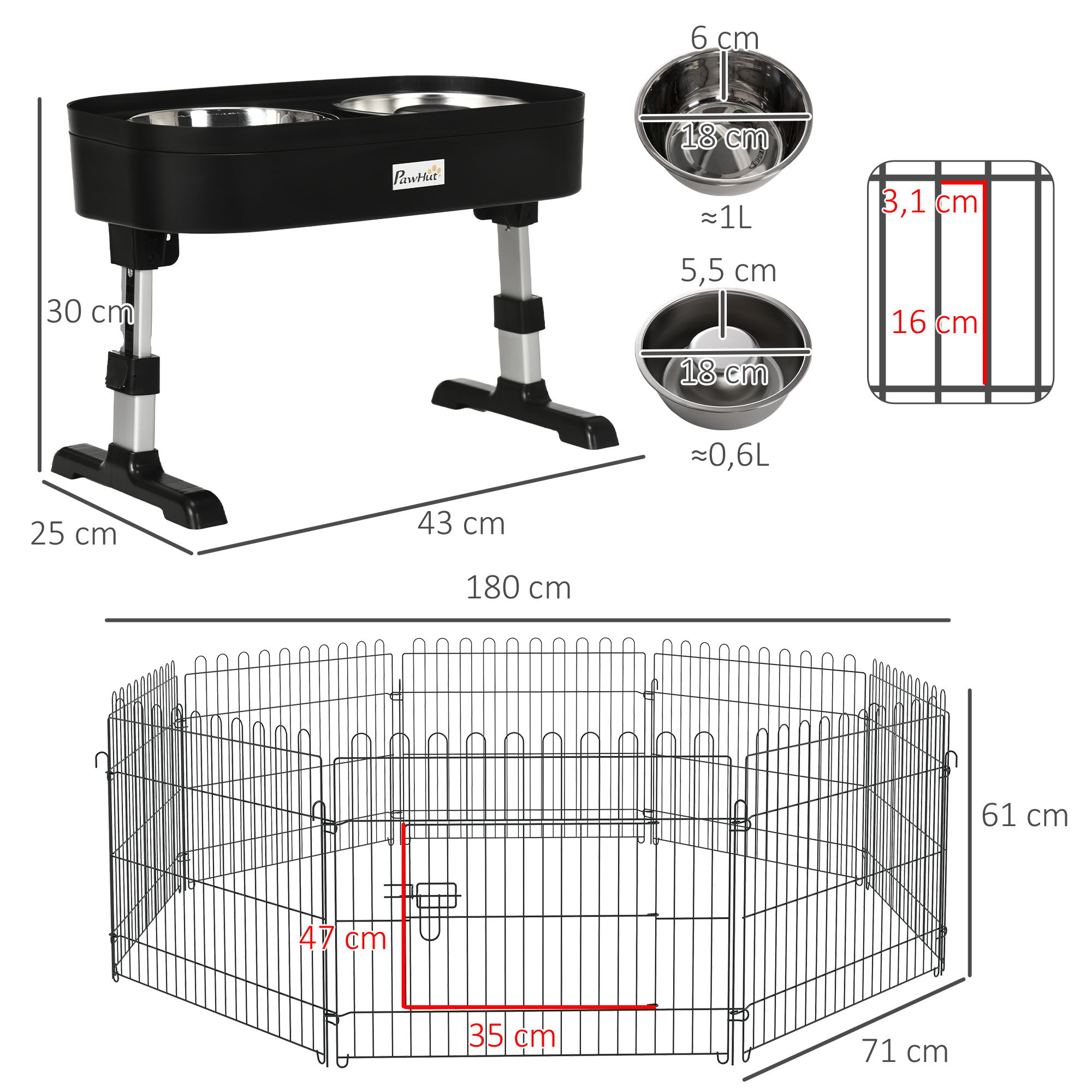 PawHut Conjunto para Mascotas Juego de Parque para Perros Plegable de 8 Paneles y Comedero Elevado para Perros de 4 Alturas Ajustables 71×61 cm 43x25x30 cm Negro