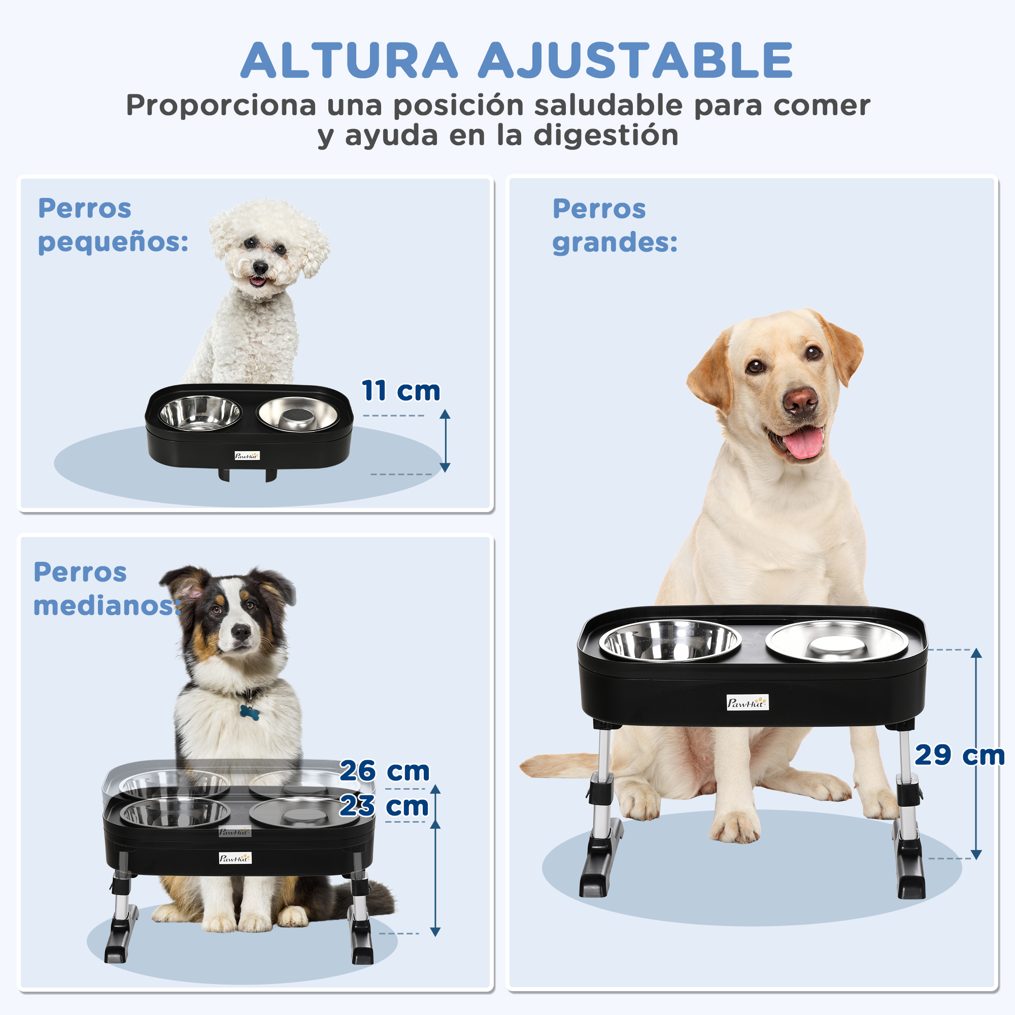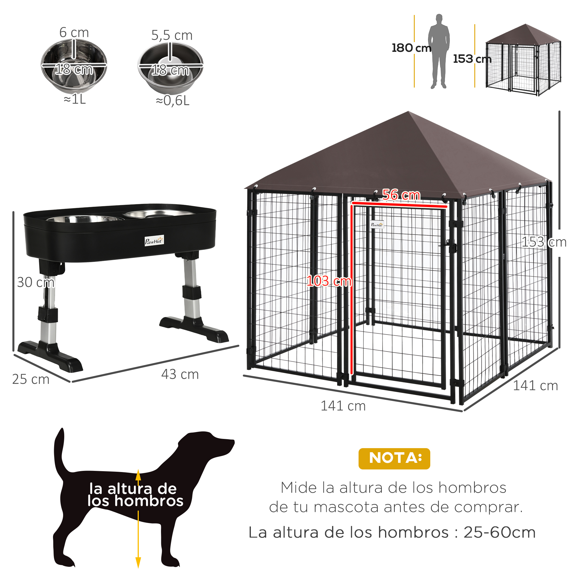 Este pack de jaula y comedero para perros es la combinación perfecta para tu mascota. La jaula, con su cubierta de techo resistente a los rayos UV y al agua, proporciona un espacio seguro y amplio para que tus perros se relajen. El comedero, con su altura ajustable y alimentador lento, garantiza una alimentación saludable y cómoda para tu mascota. Características: El pack incluye una jaula con un toldo de tela Oxford y un comedero para mascotas El comedero tiene bordes elevados y un orificio de recogida de alimentos para facilitar la limpieza El comedero es adecuado para perros pequeños (altura de los hombros: 25-40 cm), perros medianos (altura de los hombros: 40-50 cm, 45-55 cm) y perros grandes (altura de los hombros: 50-60 cm) Especificaciones: Color: negro y marrón Material: metal, tela Oxford (100% poliéster), polipropileno, acero inoxidable Medidas totales de la jaula: 141x141x153 cm (LxANxAL) Número de piezas: 8 Medidas de una sola pieza: 67×113 cm (LxAN) Medidas de la puerta: 56×103 cm (LxAL) Distancia entre barrotes: 57 mm (vertical), 93 mm (horizontal) Distancia entre barrotes: 45 mm (vertical), 95 mm (horizontal)(de la puerta) Medidas totales del comedero: 43x25x30 cm (LxANxAL) Altura del estante para los cuencos: 11 cm, 23 cm, 26 cm, 29 cm (desde el suelo) Medidas de los cuencos: Ø18×6 cm (DxAL)(1 L), Ø18×5,5 cm (DxAL)(0,6 L) Referencia: D02-P004 El paquete incluye: ● 1 x Parque para perros (referencia: D02-031); ● 1 x Comedero elevado(referencia: D08-047V00BK); ● 2 x Manual de instrucciones