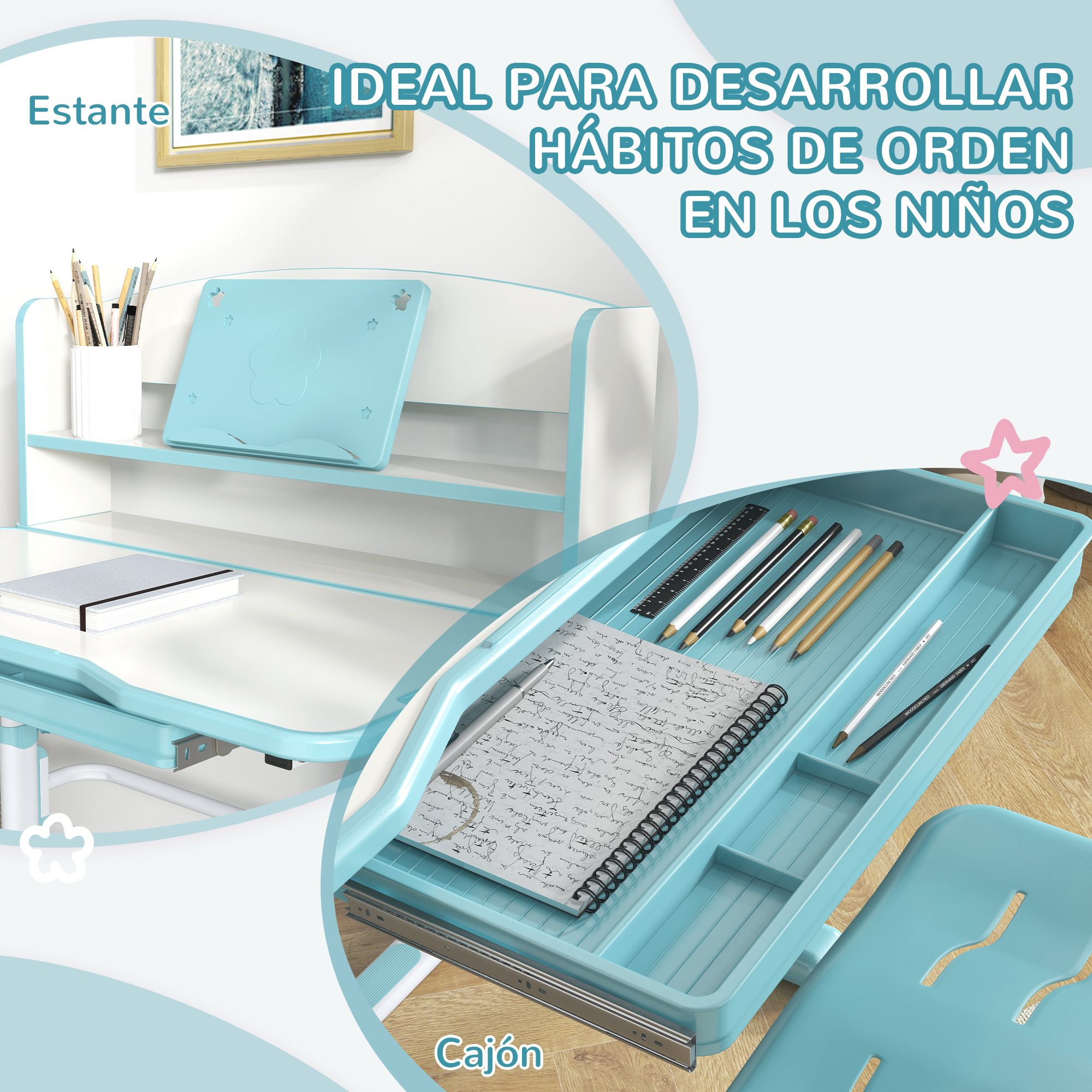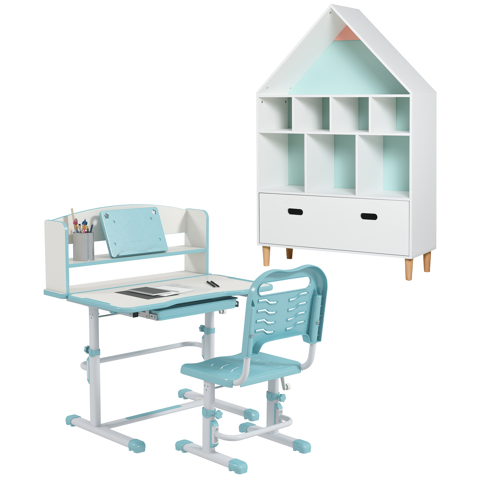 ZONEKIZ Conjunto para Niños Incluye 1 Juego de Escritorio y Silla para Niños Altura Ajustable y 1 Estantería Infantil con 8 Compartimentos Abiertos Azul y Blanco