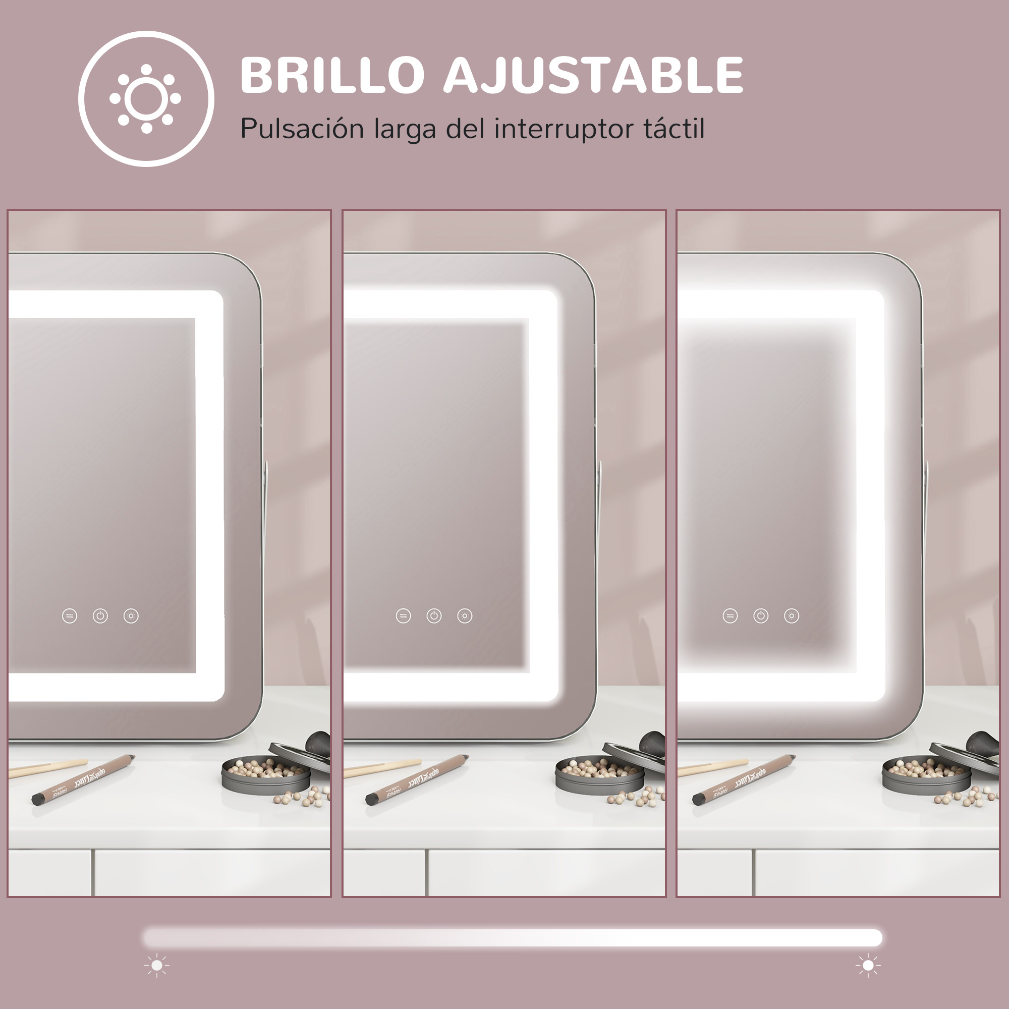 Este espejo de maquillaje estilo Hollywood de HOMCOM es perfecto para todas tus necesidades de belleza. Con una tira de luz LED, iluminará completamente su rostro. Ofrece tres modos de iluminación (cálida, fría y natural) con niveles de brillo ajustables con solo pulsar un botón. También incluye una toma USB, ideal para cargar dispositivos mientras te arreglas. Características: Espejo con luz para maquillaje, ideal para tener una visión completa del rostro Espejo con luz Equipado con una tira de luz LED con una vida útil de 50,000 horas aproximadamente Incluye un puerto USB para que puedas cargar tus dispositivos Ofrece tres modos de iluminación y ajuste de brillo mediante control táctil Incluye un pequeño espejo de aumento portátil de 10 aumentos para una visión detallada Gira 360 grados para facilitar el ajuste del ángulo de visión Tiene un marco de metal resistente y estable Una excelente elección para los amantes de la belleza Especificaciones: Color: blanco Material: vidrio, metal Medidas totales: 31x3x41,5 cm (LxANxAL) Medidas del espejo: 30×40 cm (ANxAL) Profundidad del vidrio: 4 mm Temperatura del color: 3000K/4000K/6500K Brillo: 852 lúmenes Vida útil: 50,000 horas aprox. Entrada: 220-240V, 50-60Hz Potencia: 24 W (total), 10 W (LED) y 9 W (USB) Longitud del cable: 1,5 m Referencia: 505-014V90WT El paquete incluye: ● 1 x Espejo de maquillaje; ● 1 x Manual de instrucciones