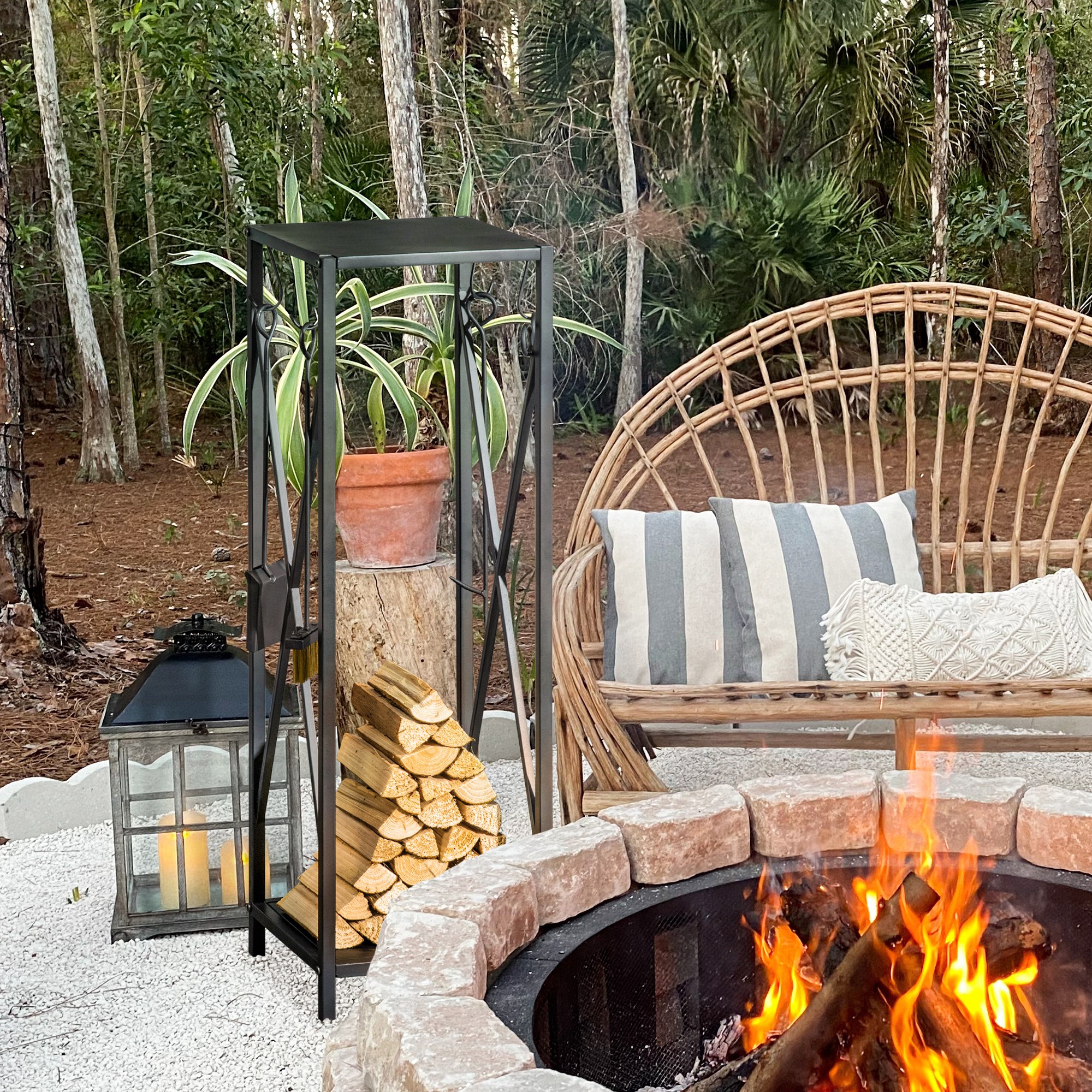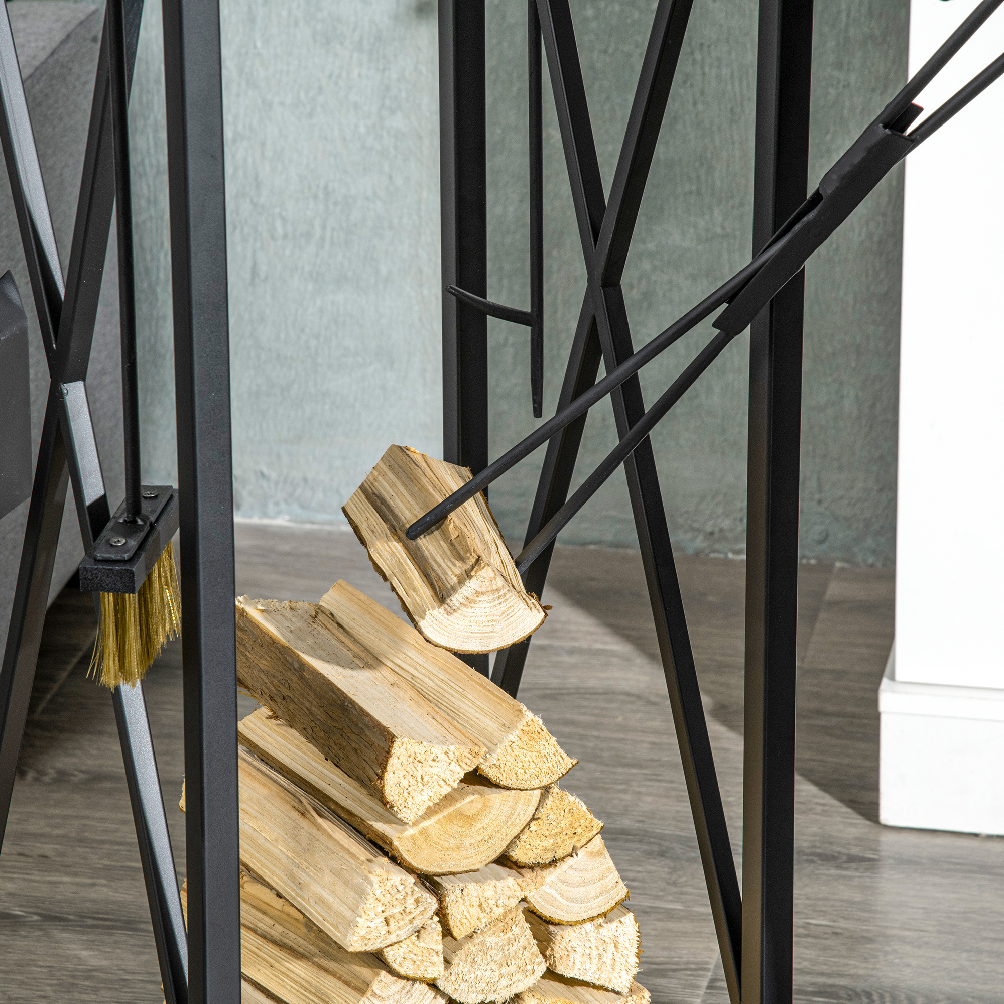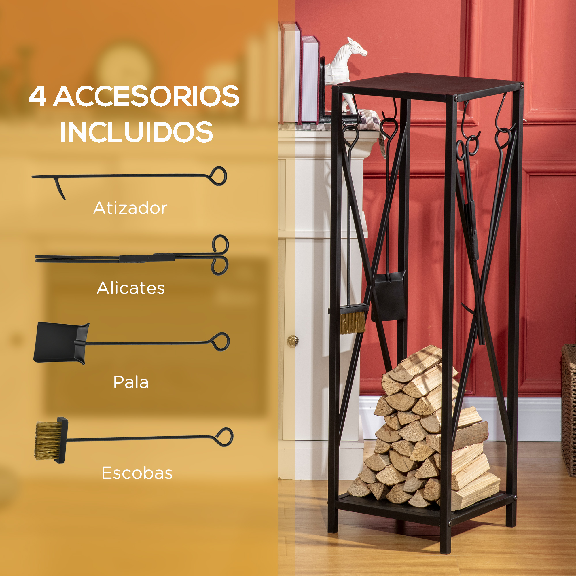 Outsunny Soporte para Leña Estante de Leña Metálico Leñero de Exterior con Ganchos Pala Cepillo Atizador y Tenazas Carga 65 kg para Interior y Exterior 34x34x111 cm Negro