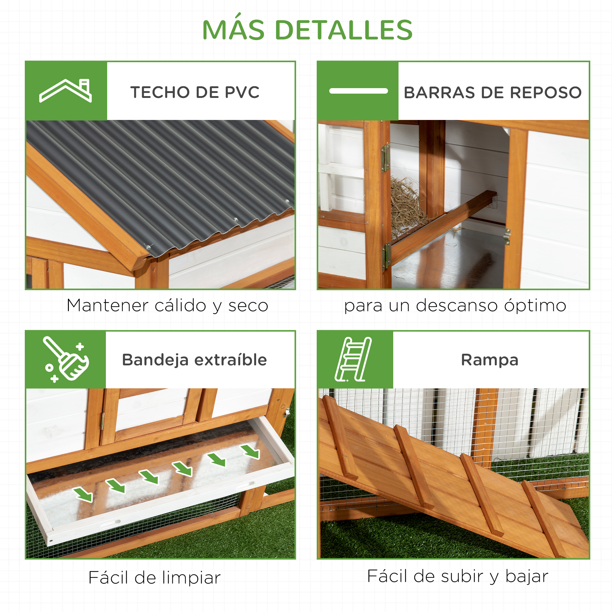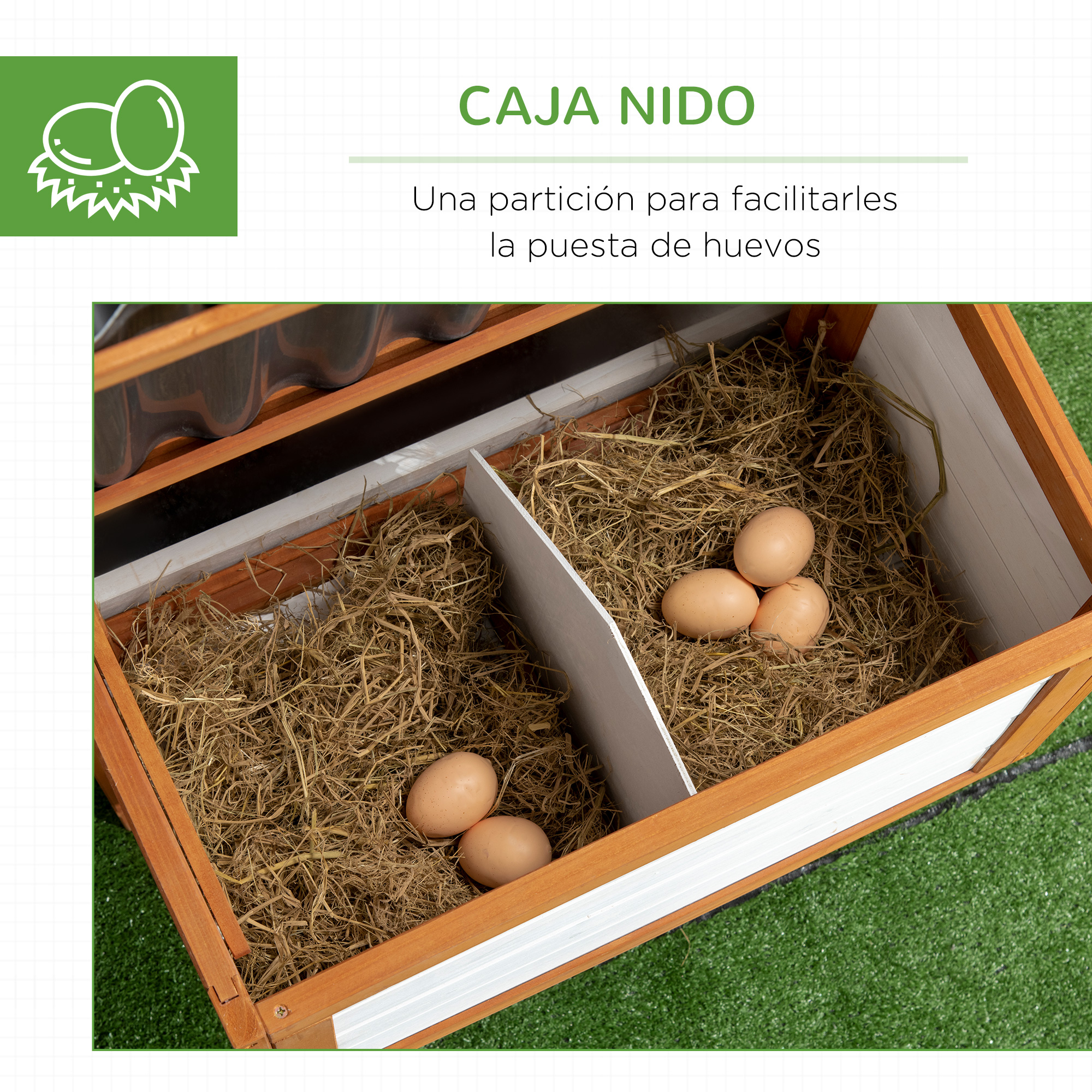 Dale a tus gallinas un hogar cómodo y acogedor con este gallinero de PawHut. Se compone de tres zonas diferenciadas, una abierta para que tus gallinas puedan correr libremente mientras están protegidas de los depredadores, una caseta cerrada y un nido lateral. Hecha de madera de abeto con pintura no tóxica y techo de PVC, es seguro para tus mascotas e ideal para uso a largo plazo. ¡Es el espacio perfecto para que tus gallinas descansen y se diviertan! Características: Hecho de madera de abeto y techo de PVC El área abierta aprovecha al máximo el espacio, ofreciendo una mayor libertad de movimiento La casa elevada evita el contacto directo con el suelo, manteniendo a tus animales seguros, secos y cálidos Con bandeja extraíble para facilitar la limpieza Tiene 2 perchas dentro de la casa La rampa antideslizante facilita el acceso entre la zona abierta y la caseta La malla metálica mantiene a tus mascotas a salvo de sus depredadores y asegura una buena ventilación Adecuado para 2-4 gallinas Requiere montaje Especificaciones: Color: madera, blanco y negro Material: madera de abeto, PVC y metal Medidas totales: 181×79,5×117,5 cm (LxANxAL) Medidas de casa principal: 69,5×58,5×70,5 cm (total), 66×55 cm (interior), 0.36 m² (área) Medidas de puerta de la casa: 24×38 cm (LxAN) Medidas de caja nido: 55x30x32/30 cm (total), 51×28 cm (interior), 0,14 m² (área) Zona abierta: 69,5×58,5×36 cm (debajo de la casa), 78×58,5x75cm (lateral), 0,79 m² (área) Medidas de puerta de la zona abierta: 33,5×66 cm (LxAN) Medidas de la rampa: 58×21 cm (LxAN) Medidas de la bandeja: 62,5×56,5×3,5 cm (LxANxAL) Referencia: D51-367V00OG El paquete incluye: ● 1 x Gallinero; ● 1 x Manual de instrucciones