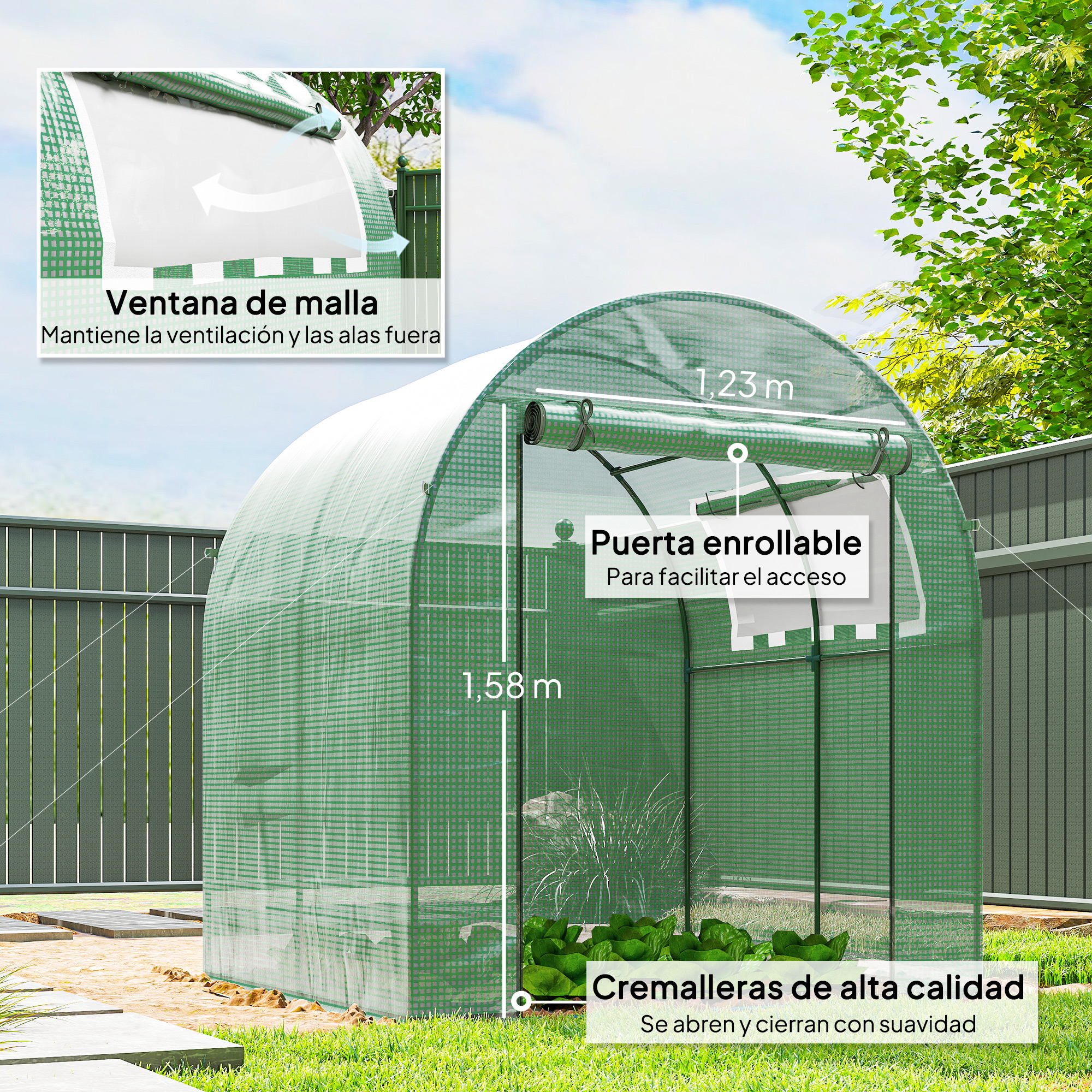 ¿Te apena ver cómo el invierno acaba con tus flores preferidas y tus plantas? ¿Crees que tu jardín podría ofrecerte vegetales frescos todo el año? Si es así, este invernadero pequeño de Outsunny para cultivo en exterior es ideal para ti. Sus ventanas de malla enrollables ofrecen una buena ventilación y como su puerta también es enrollable, podrás acceder a él cómodamente. ¿A qué esperas para sacarle el mayor partido a tu jardín incluso en invierno? Características: Invernadero de jardín ideal para extender la temporada de crecimiento de tus plantas y cultivos El techo arqueado evita la acumulación de agua de lluvia Estructura de acero para mayor resistencia y durabilidad Cubierta de PE resistente a la lluvia ya los rayos UV Gran puerta enrollable para facilitar el acceso al interior Este invernadero de túnel tiene 1 ventana enrollable a la derecha, para una mejor ventilación interior Incluye 4 estacas de tierra y 4 cuerdas de sujeción para fijar en el suelo para mayor estabilidad y resistencia al viento El borde de 10 cm debe estar completamente enterrado en el suelo para que haga su función NOTA: No apto para condiciones climáticas adversas Especificaciones: Color: verde Material: acero y PE Medidas totales: 180x180x200 cm (LxANxAL) Medidas de la ventana lateral: 120×45 cm (LxAN) Medidas de la puerta: 123×158 cm (LxAN) Nivel de resistencia al viento: 4 Referencia: 845-775V00GN El paquete incluye: ● 1 x Invernadero; ● 4 x Estaca para el suelo; ● 4 x Cuerda de tensión; ● 1 x Manual de instrucciones