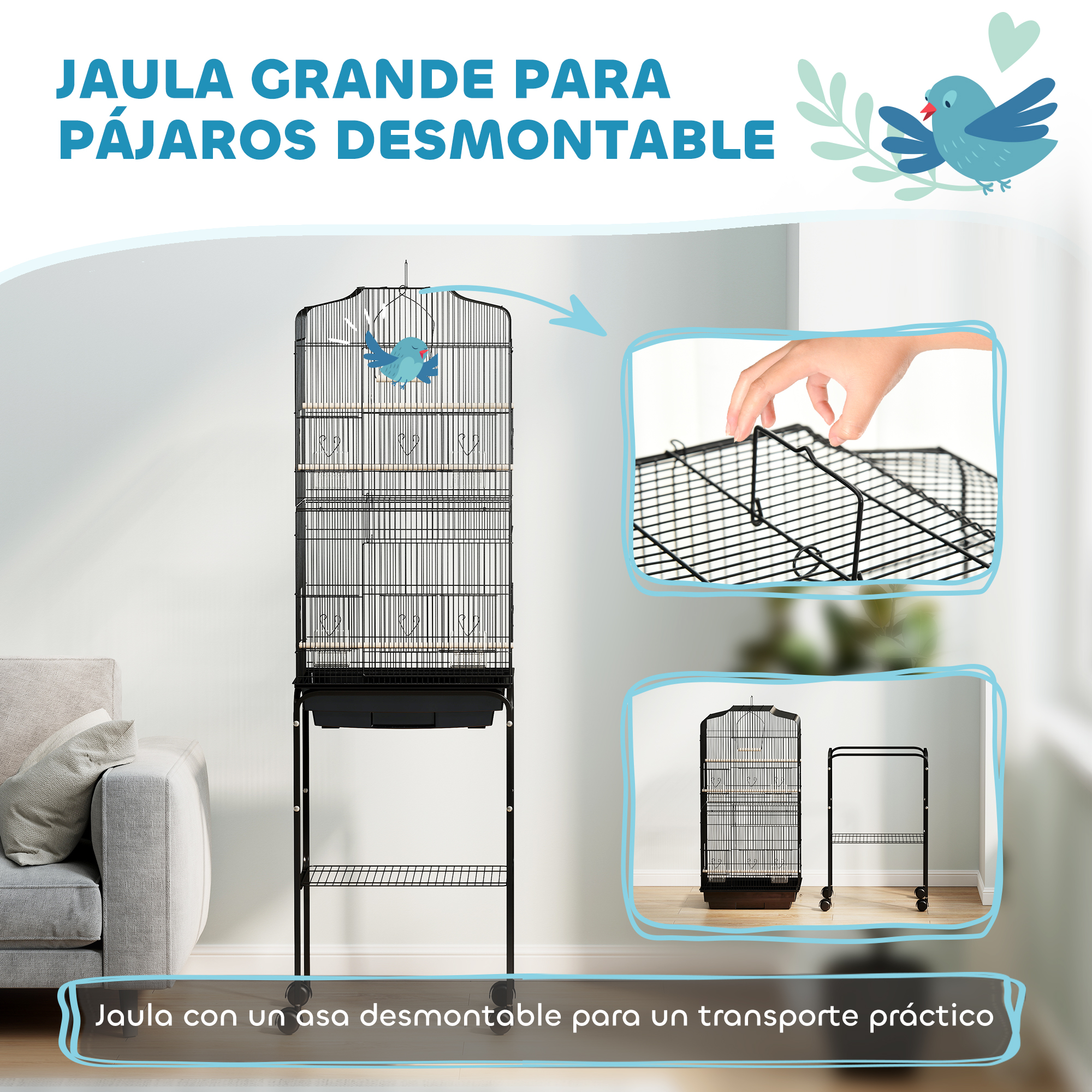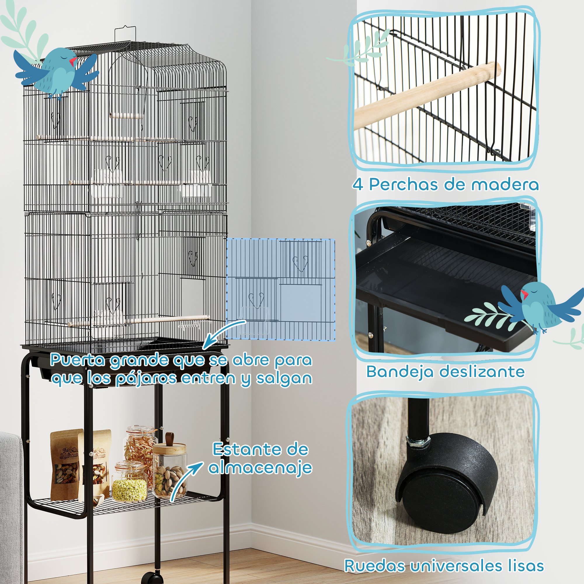 PawHut Jaula para Pájaros con Ruedas 46,5x36x157 cm Jaula Metálica de Aves con Puertas 4 Comederos 3 Perchas Bandeja Extraíble y Estante de Almacenaje para Canarios Periquitos Negro