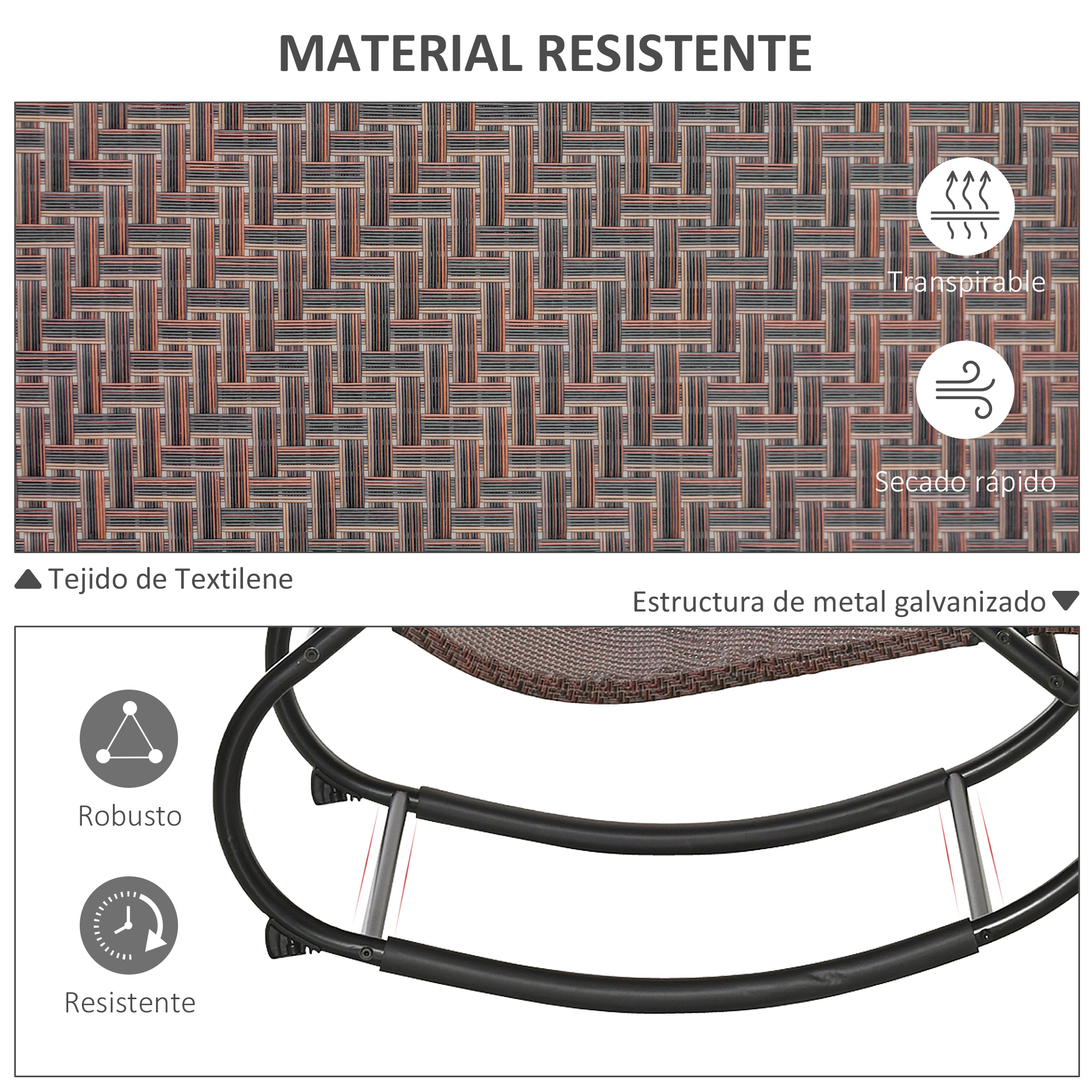 Tumbonas balanceantes para exteriores de Outsunny ideales para relajarse junto a la piscina o en el jardín. Incorporan un reposacabezas extraíble y unos reposabrazos contorneados para que, junto a su forma, tumbarte en ellas y relajarte sea uno de tus momentos preferidos del día. ¿A qué esperas para sacarle el máximo partido a tu espacio exterior? Con estas mecedoras para exterior será súper sencillo. Características: Tumbonas mecedoras perfectas para relajarse en el exterior Estructura ligera de metal para que, aunque resistente hasta para 160 kg, sea fácil de transportar de un lugar a otro El patrón de tejido imita el tejido de ratán para una apariencia elegante Forma de diseño cómodo que se adapta mejor a ti proporcionando un apoyo perfecto Máxima comodidad con reposacabezas acolchado extraíble y reposabrazos suavemente contorneado Las envolturas en los brazos y en la parte inferior crean un acabado suave para evitar que se raye la estructura Perfectas para jardín, patio, piscina o camping Se requiere montaje Especificaciones: Color: marrón Material: texteline y metal galvanizado Medidas totales: 61x160x79 cm (LxANxAL)(cada tumbona) Medidas del asiento: 52×40 cm (LxAN) Altura del asiento: 33 cm Altura del respaldo: 90 cm Longitud del reposapiés: 45 cm Altura del brazo: 65 cm Medidas del cojín: 30x16x4 cm (LxANxAL) Carga máxima: 160 kg (cada una) Cumplen con: EN581-1-28 Referencia: 84B-P181 El paquete incluye: ● 2 x Tumbona individual (referencia: 84B-679BN); ● 1 x Manual de instrucciones