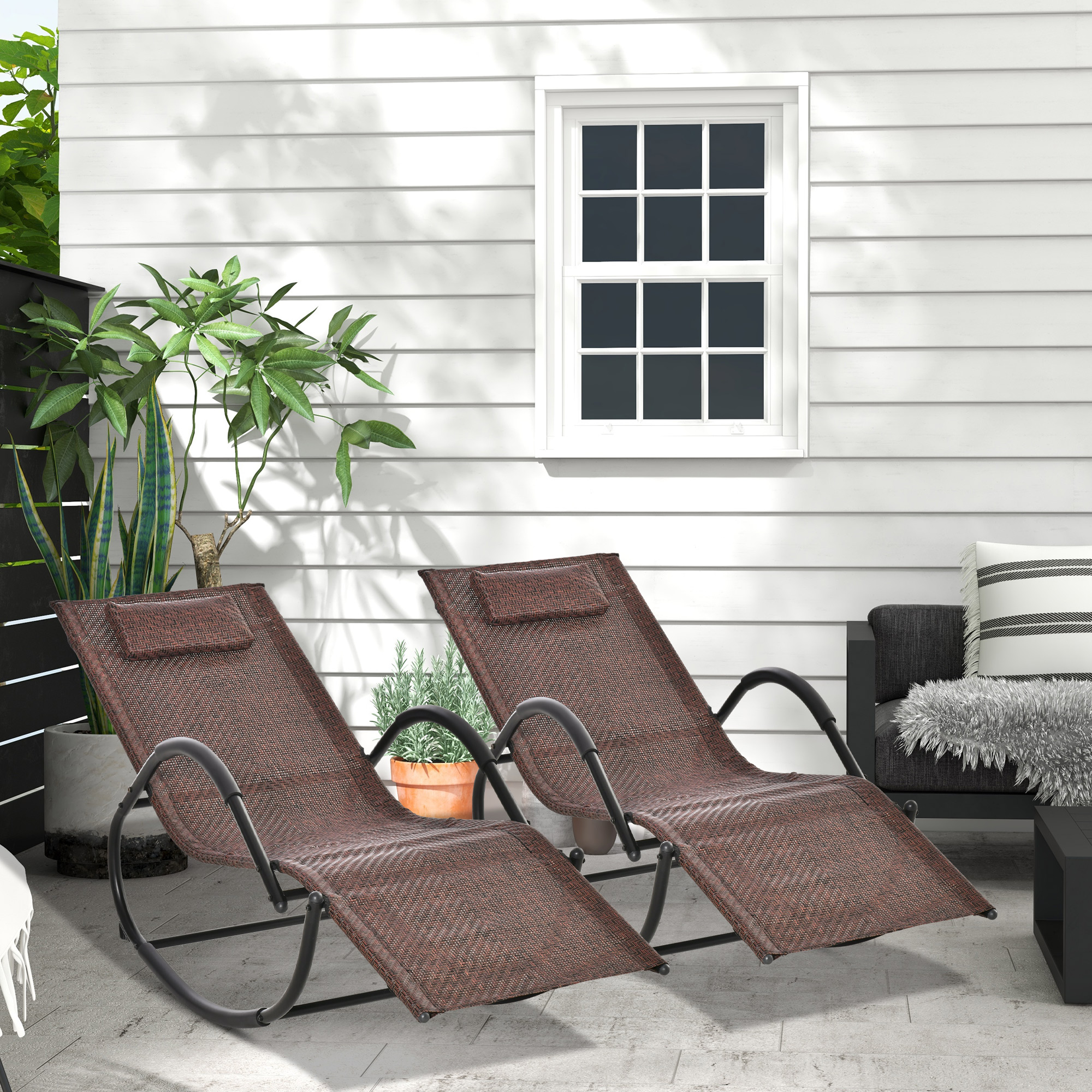 Outsunny Conjunto de 2 Mecedoras de Exterior Tumbonas Mecedoras con Reposabrazos Reposacabezas y Efecto de Ratán Carga 160 kg para Jardín Terraza 160x61x79 cm Marrón