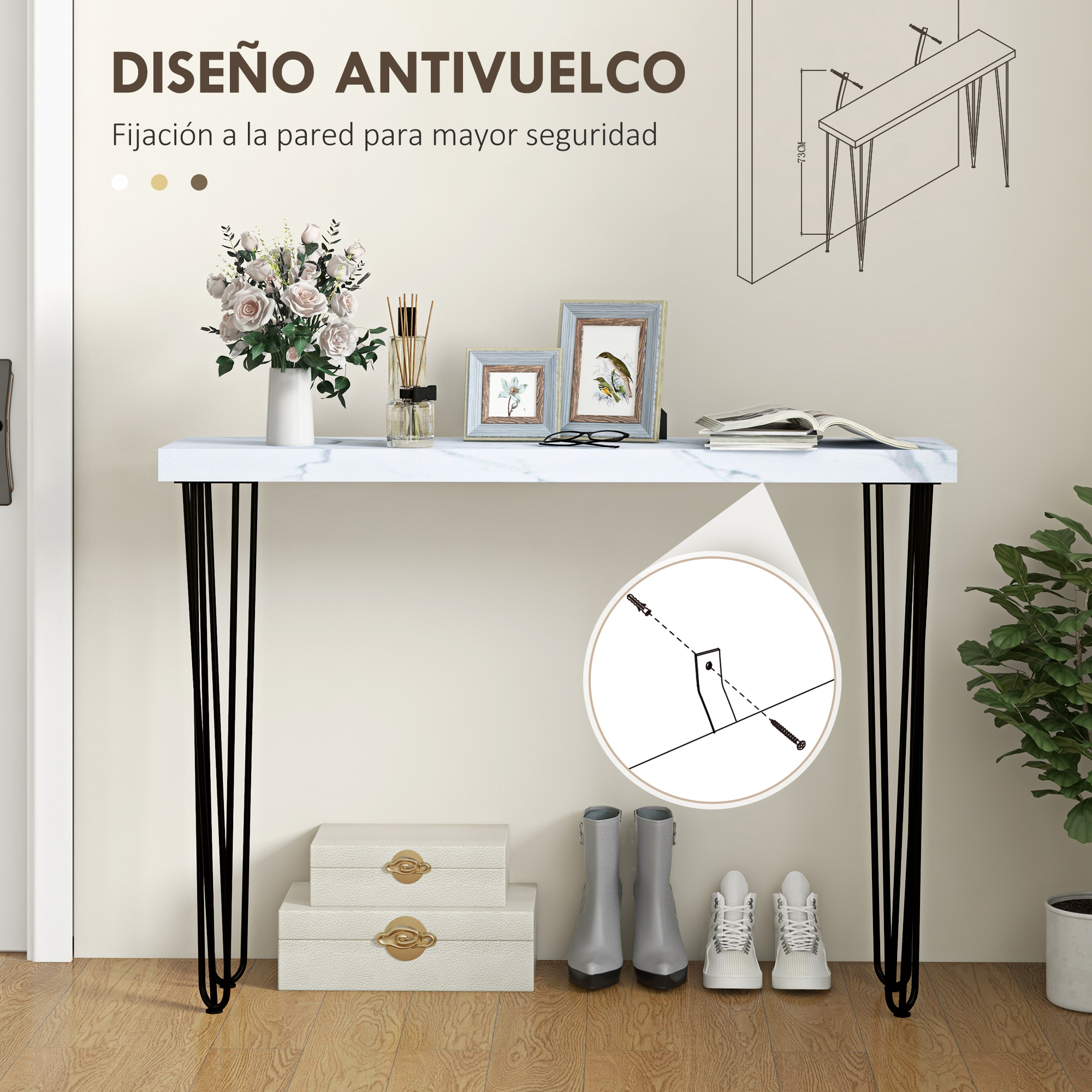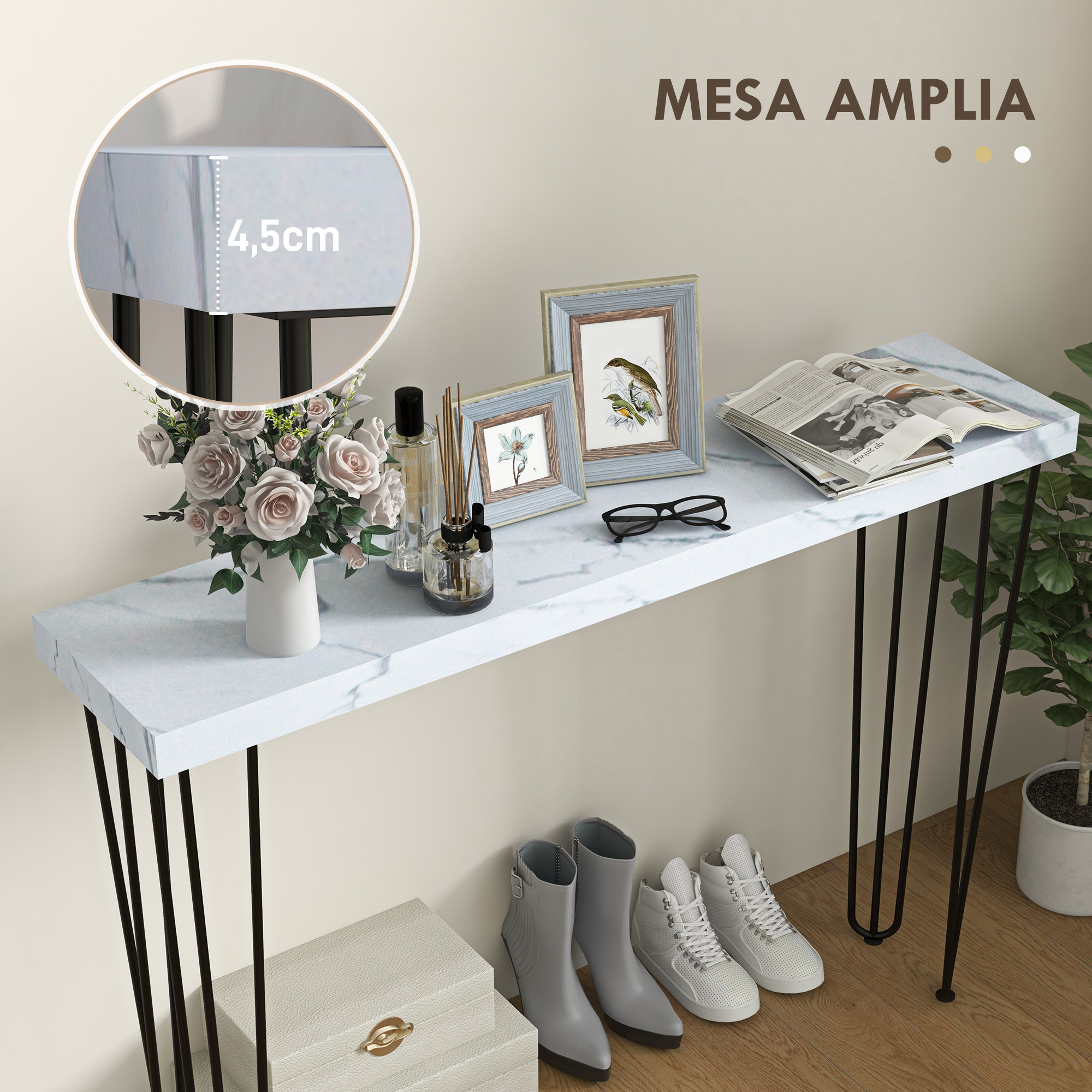 Descubre la magia de un diseño que aprovecha al máximo los espacios con nuestra mesa consola HOMCOM. Perfecta para espacios reducidos, esta mesa de pasillo no solo optimiza el espacio, sino que también lo embellece. Muestra tus decoraciones favoritas en su encimera, respaldada por su resistente estructura de acero lacado y su antivuelco para fijar a la pared que aporta seguridad. Características: La amplia y gruesa encimera, en color que imita el mármol, muestra tus objetos decorativos de manera elegante Su diseño delgado se ajusta perfectamente a espacios reducidos Las patas de acero lacado estilo horquilla y la encimera de melamina garantizan su durabilidad Consola para entrada incluye sistema antivuelco para mayor seguridad en el hogar Las almohadillas antideslizantes protegen tu suelo de arañazos Requiere un montaje sencillo Especificaciones: Color: símil mármol Material: acero, MDF Medidas totales: 110x25x79,5 cm (LxANxAL) Grosor del tablero: 4,5 cm Altura de las patas: 75 cm Carga máxima: 20 kg Referencia: 837-485V00WT El paquete incluye: ● 1 x Mesa consola; ● 1 x Manual de instrucciones