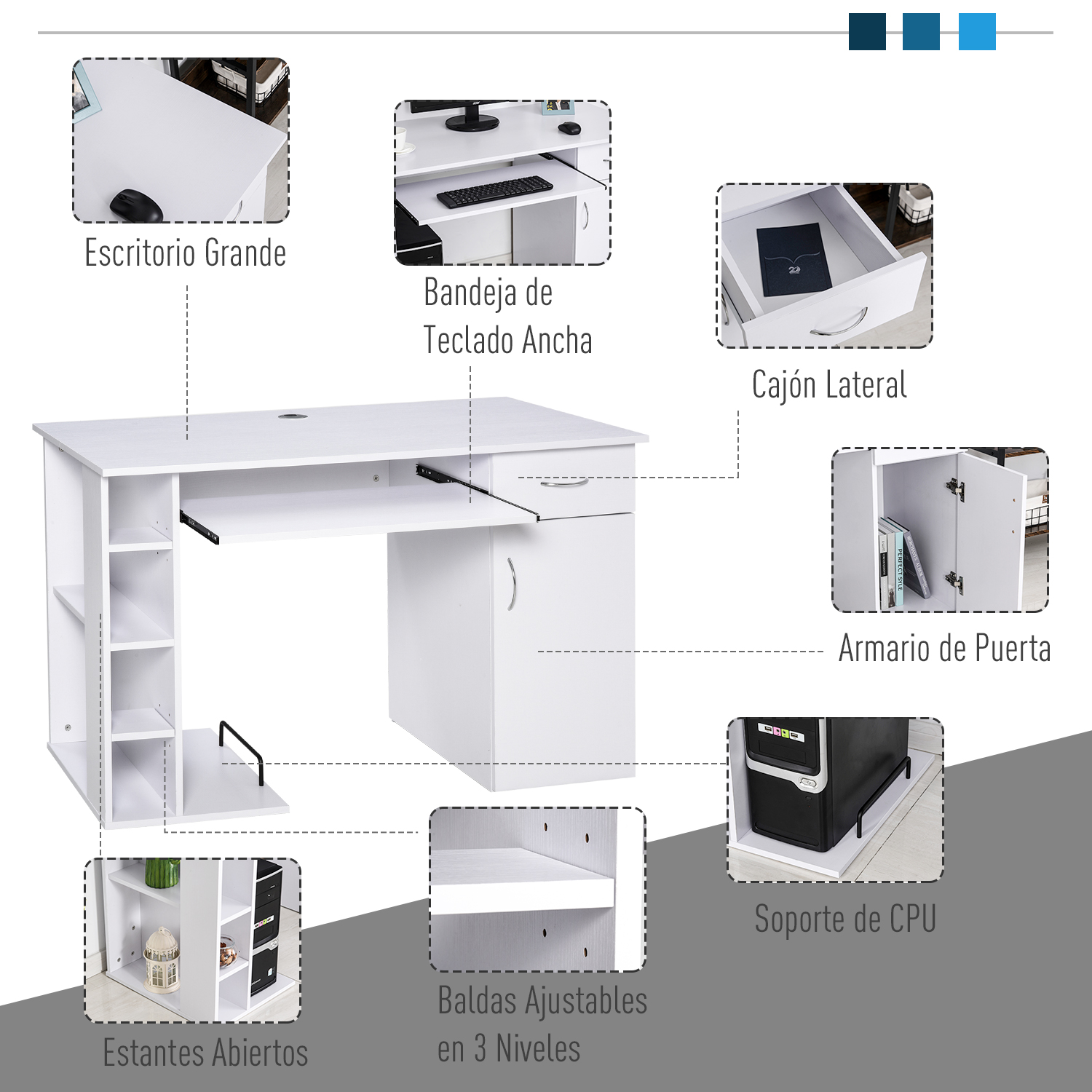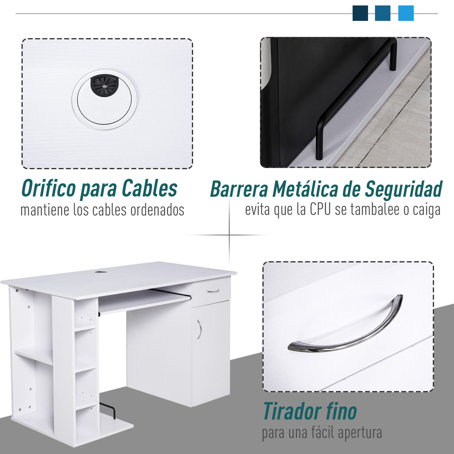Este escritorio de oficina de HOMCOM combina elegancia con funcionalidad. Con varios estantes de almacenaje en su lado izquierdo, y un armario de puerta y un cajón en la derecha, te ofrece múltiples espacios para los artículos o accesorios de ordenador. Con bandeja extraíble para el teclado del ordenador, lo mantiene fuera de la vista cuando no está en uso. Es un mueble práctico para poner en cualquier habitación gracias a su diseño compacto y funcional. Es perfecto para oficina, dormitorio, e ideal para habitaciones y espacios pequeños. Características: Hecho de tablero resistente de MDF de grado E1 Cuenta con bandeja para teclado deslizable, soporte para CPU, cajón y múltiples estantes Múltiples opciones de almacenaje para papeles, suministros de escritura y artículos Estantes abiertos con baldas ajustables Diseño simple y elegante que se adaptará fácilmente en su estudio, oficina o dormitorio Requiere montaje Especificaciones: Color: blanco Material: MDF Medidas totales: 120x60x74 cm (LxANxAL) Medidas de la bandeja extraíble: 66×33 cm (LxAN) Medidas del soporte para CPU: 22,5×50 cm (LxAN) Medidas interiores del cajón: 24,3×33,3×10 cm (LxANxAL) Medidas interiores del armario: 29,8×49,5×54,5 cm (LxANxAL) Capacidad máxima de carga: 30 kg (mesa), 5 kg (cajón), 5 kg (estante) Referencia: 920-012V01WT