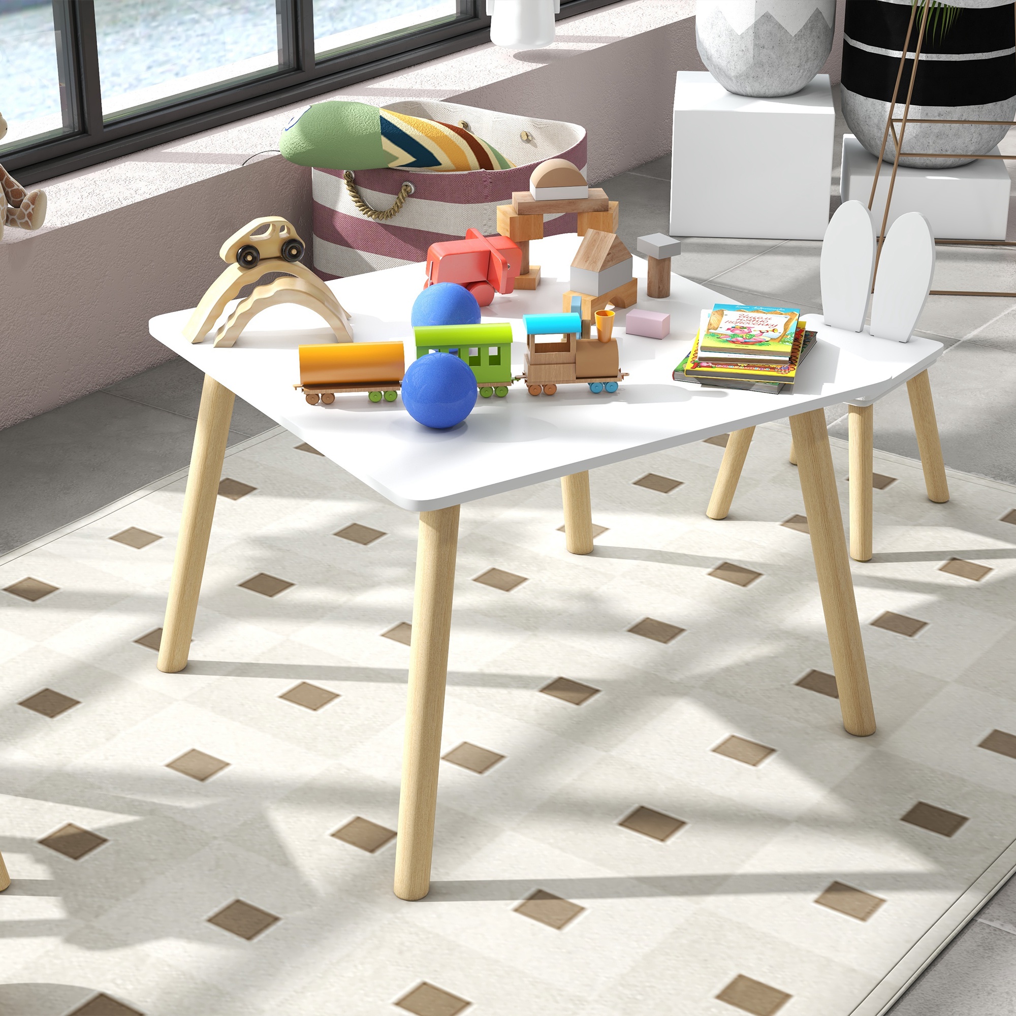 Este encantador conjunto de mesa y sillas infantiles de AIYPLAY, con respaldos en forma de orejas de conejo, cautivará a los más pequeños. Incluye una mesa para niños y dos sillas que encajan perfectamente debajo de ella, optimizando así el espacio. Fabricado en MDF con patas de madera de pino, este conjunto de tres piezas es ideal para cualquier zona de juegos, habitación infantil y más. Características: Este conjunto de muebles infantiles incluye una mesa infantil y dos sillas Los respaldos de este set de mesa para niños con sillas con forma de orejas de conejo encantarán a los niños Las sillas se pueden guardar debajo de la mesa para ahorrar espacio cuando no se usan Fabricado en MDF y patas de madera de pino para mayor resistencia, estabilidad y durabilidad Ideal para guarderías, salas de juegos, dormitorios infantiles, entre otros espacios Requiere montaje Especificaciones: Color: blanco y madera Material: MDF, madera de pino Medidas de la mesa: 60x60x44 cm (LxANxAL) Medidas de las sillas: 26,5×26,5×47 cm (LxANxAL) Altura del asiento: 26 cm Altura del respaldo: 21 cm (hasta el asiento) Carga máxima: 20 kg (mesa), 30 kg (cada silla) Edad recomendada: a partir de 3 años Referencia: 312-115V80WT El paquete incluye: ● 1 x Mesa; ● 2 x Sillas; ● 1 x Manual de instrucciones