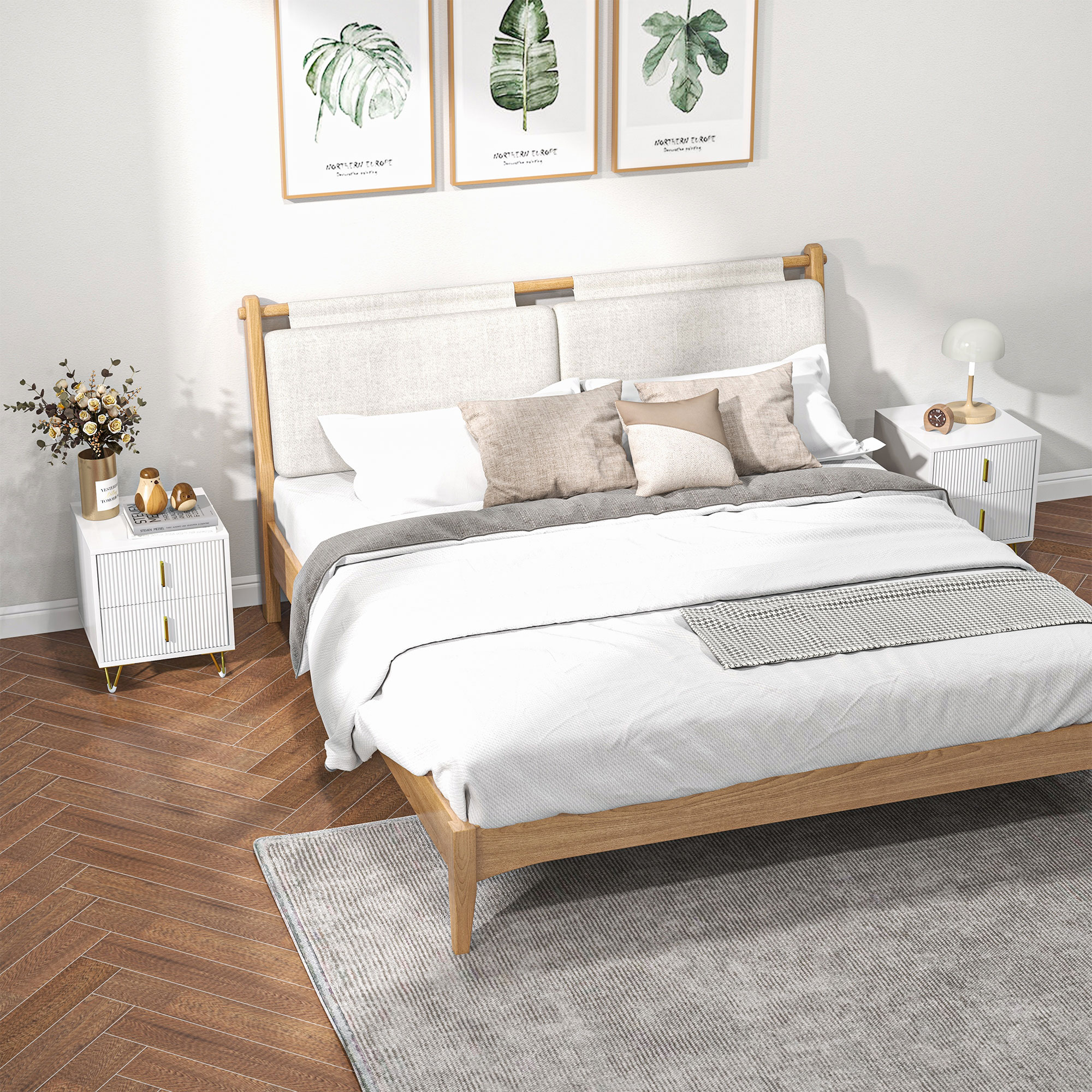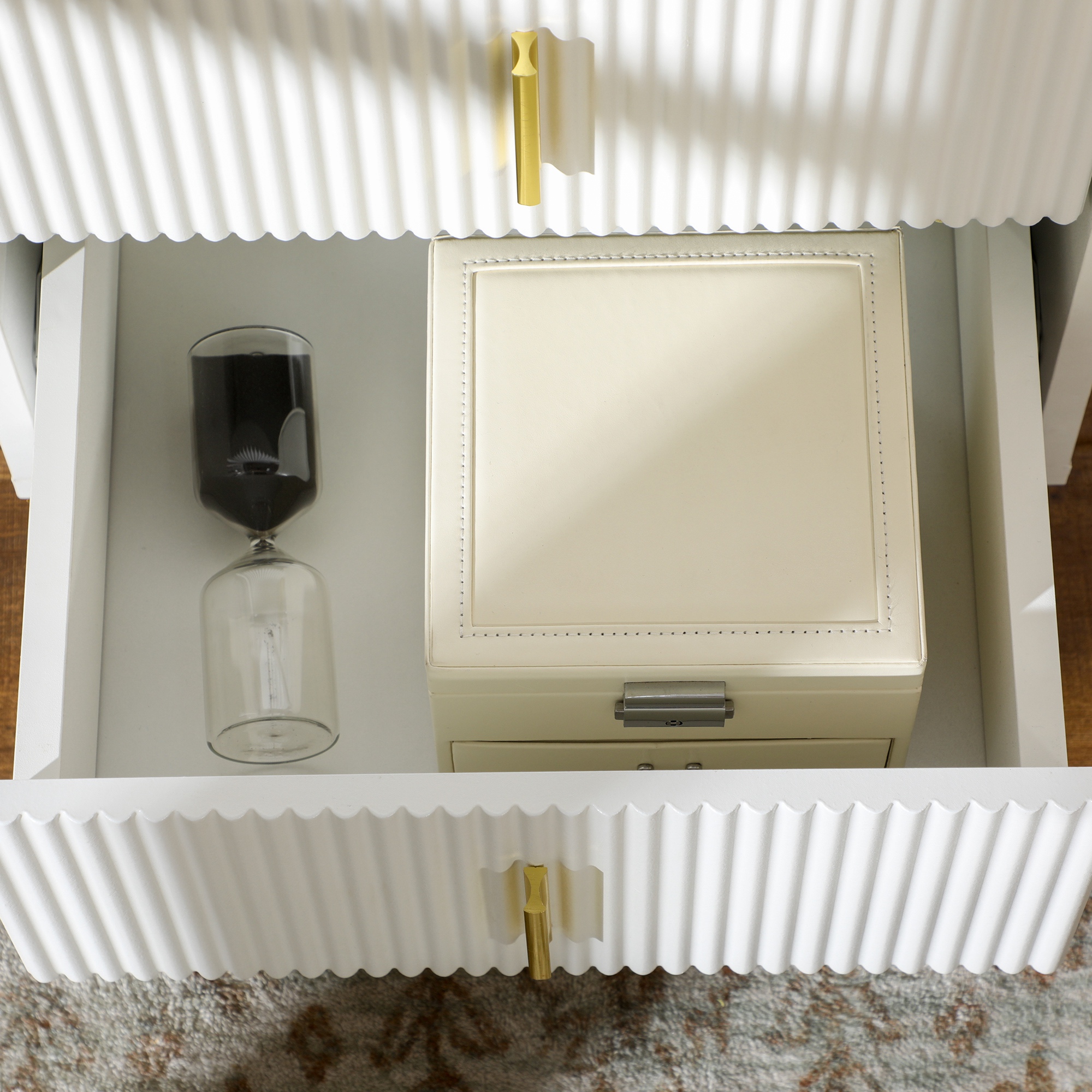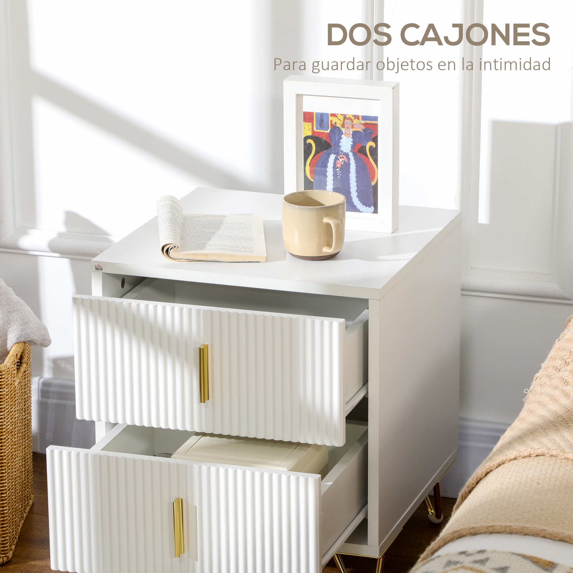 ¿Necesitas más almacenaje? Este pack de dos mesitas de noche de HOMCOM es la solución. Con un diseño elegante y una combinación de blanco y dorado, añadirán estilo a cualquier habitación. Cada mesita tiene una encimera y 2 cajones, duplicando el espacio de almacenamiento. Además, su estructura de melamina de madera y metal garantiza resistencia y estabilidad. Características: Pack de dos mesas auxiliares blancas con marco metálico dorado que añadirán un toque elegante y único a tu hogar Gracias a su versatilidad, estas mesillas blancas pueden ser utilizadas como mesitas de noche, mesas laterales de sofá o mesas auxiliares Compuestas por dos amplias encimeras y 4 cajones en total, estas elegantes mesitas auxiliares ofrecen el doble de espacio de almacenamiento La superficie está revestida en melamina de madera, lo que las hace fáciles de limpiar Equipadas con patas antideslizantes para proteger el suelo Requieren montaje Especificaciones: Color: blanco y dorado Material: melamina de madera, MDF y acero Medidas totales: 40x40x47 cm (LxANxAL) (cada una) Medidas del interior del cajón: 31,1×28,5×8,1 cm (LxANxAL) (cada uno) Altura de cama adecuada: 40-55 cm (colchón + estructura de cama) Carga máxima: 80 kg en total (40 kg cada una), 60 kg en total en la encimera (30 kg cada una), 10 kg en total en el cajón (5 kg cada uno) Referencia: 831-P126 El paquete incluye: ● 2 x Mesita de noche (referencia: 831-641V00WT); ● 1 x Manual de instrucciones
