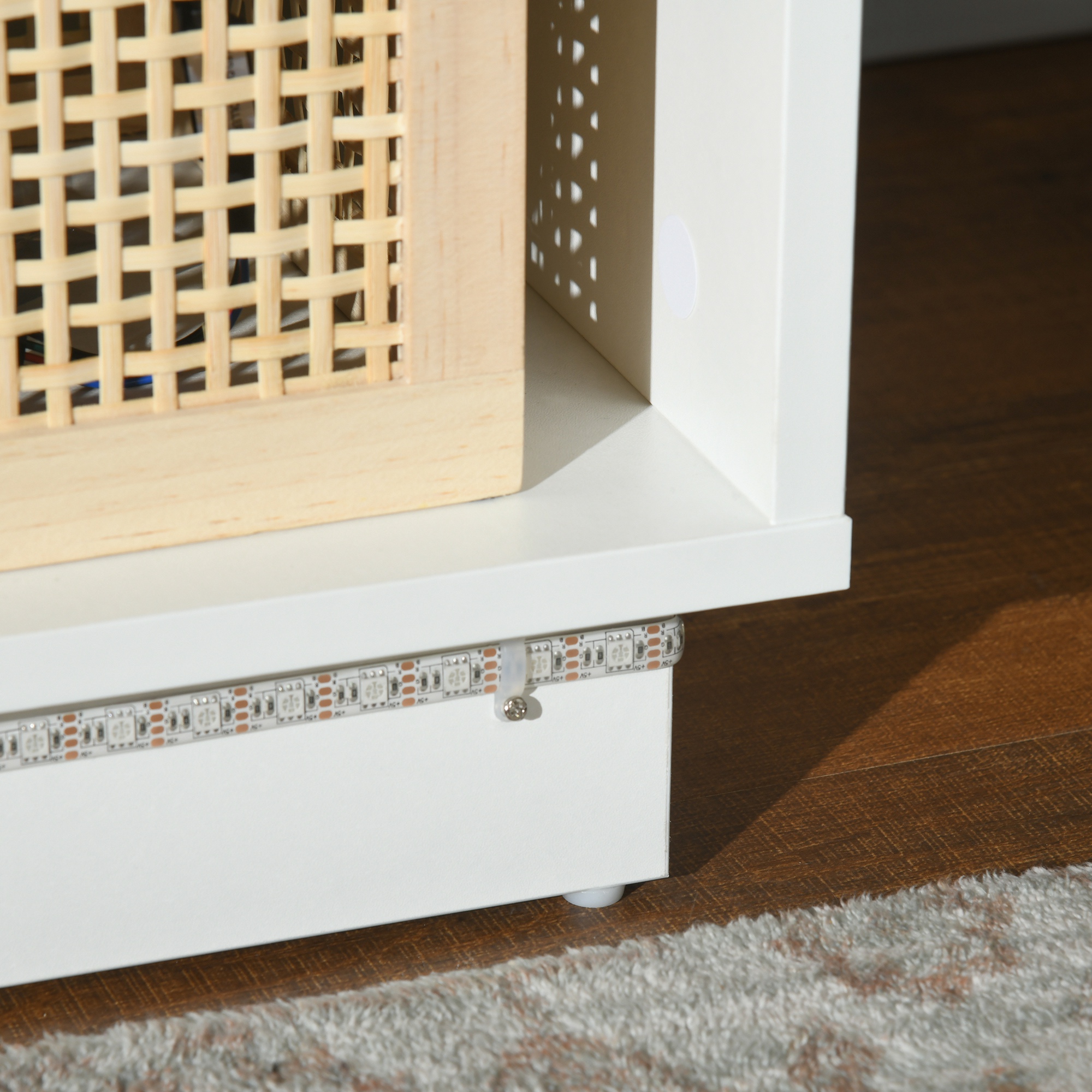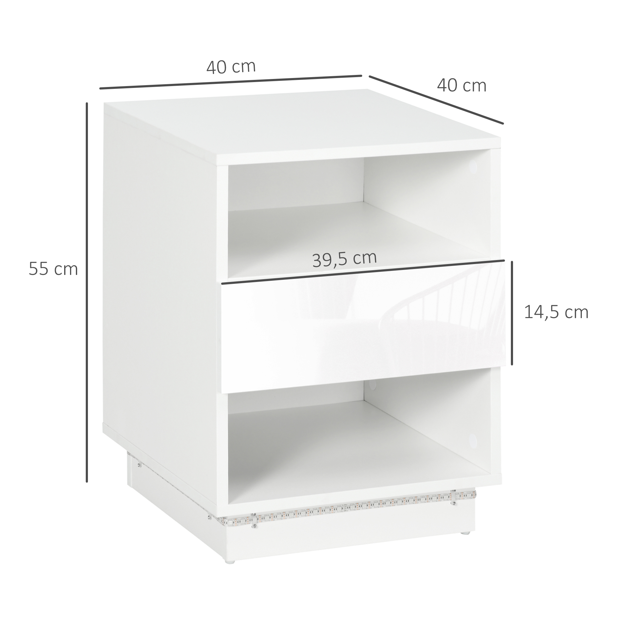 HOMCOM Mesita de Noche Moderna con Luz LED Mesilla de Noche con Mando a Distancia Cajón de Alto Brillo y 2 Estantes para Salón Dormitorio 40x40x55 cm Blanco
