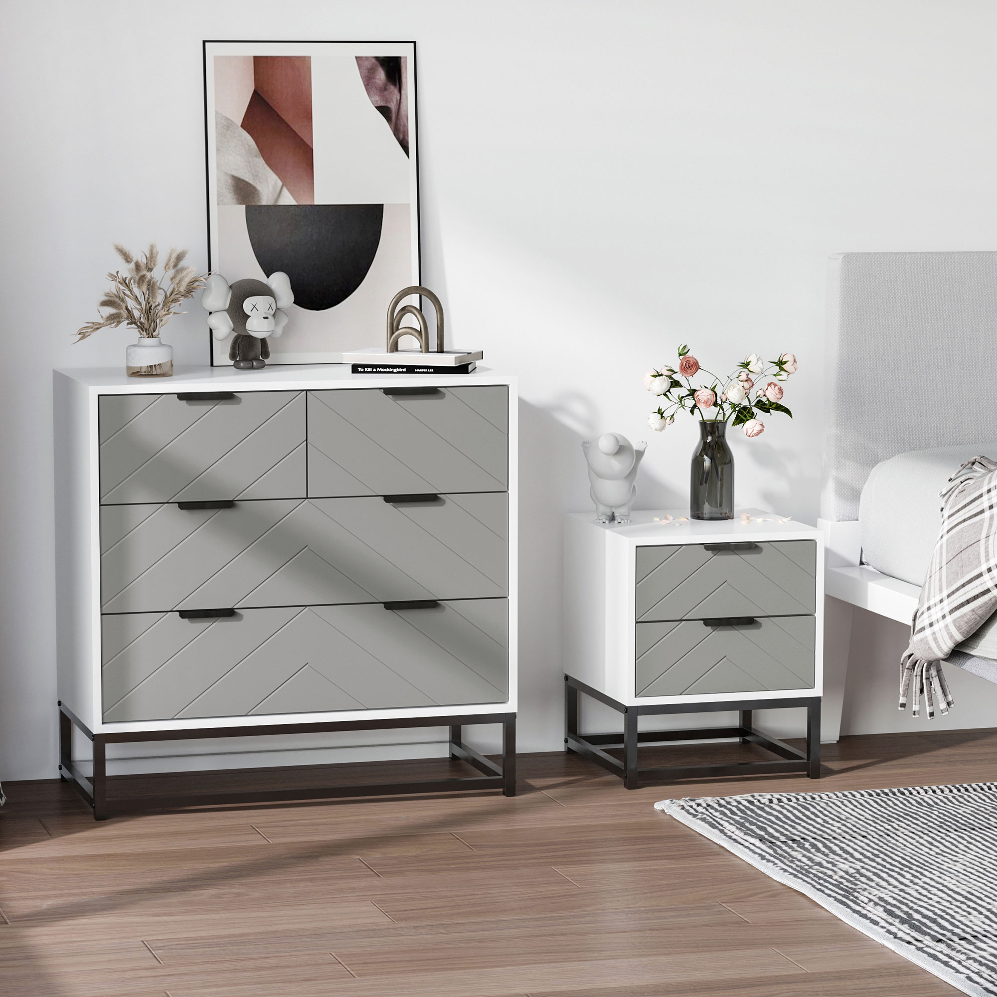 HOMCOM Mesita de Noche Mesa Auxiliar con 2 Cajones y Base Elevada de Metal para Dormitorio Cama Salón Estilo Moderno y Minimalista 39,5x40x48 cm Blanco y Gris