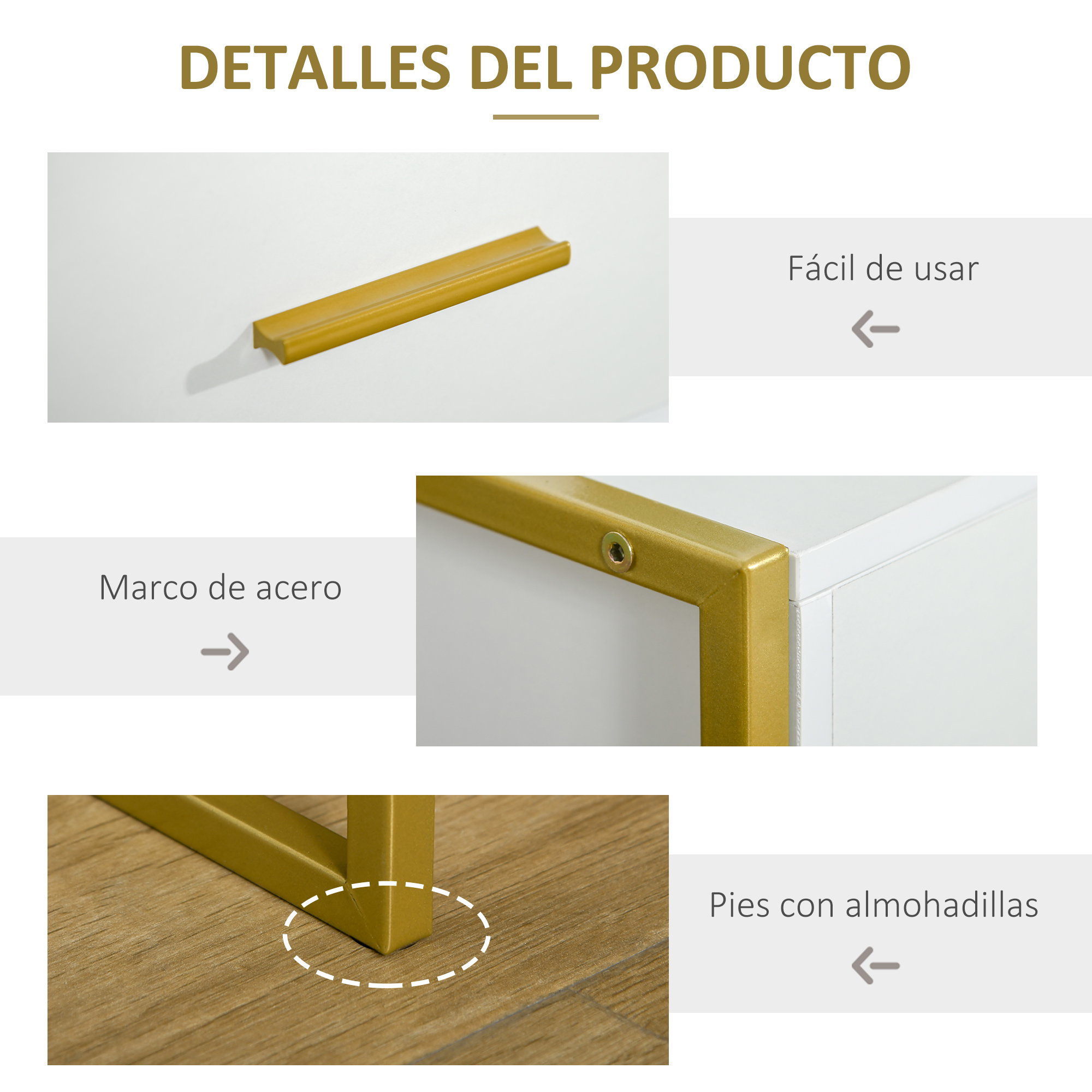 ¿Necesitas espacio de almacenaje extra? ¿Estás buscando unas mesitas de noche originales? Estas mesitas auxiliares de HOMCOM pueden hacer las funciones anteriormente mencionadas y más. Como mesas auxiliares, mesas laterales… su diseño elegante y moderno combinará en cualquier sala de tu hogar, integrándose fácilmente con la decoración de tus otros muebles. Con encimera, cajón y estante de melamina blanca y marco de metal dorado. Características: Este pack está compuesto por 2 mesitas de idénticas características (referencia 831-535) Estas mesas pequeñas se pueden usar como mesitas de noche o mesas auxiliares para la sala de estar o el dormitorio Cada mesita está compuesta por una encimera, un estante inferior y un cajón Ofrecen un amplio espacio para almacenar y exhibir decoraciones, artículos de tocador, etc. Estas mesitas son ligeras para mover y reubicar con facilidad Las patas de las mesitas mantienen la base elevada, facilitando la limpieza del suelo Tienen una estructura de melamina de madera y marco de metal, lo que las hace resistentes y duraderas Requieren montaje Especificaciones: Color: blanco, dorado Material: melamina de madera, metal Medidas totales: 45x40x60 cm (LxANxAL)(cada una) Medidas del interior del cajón: 36,5x36x10,5 cm (LxANxAL) Altura del estante: 26 cm Longitud de las patas: 12 cm Carga máxima (cada una): 10 kg (estante), 5 kg (cajón) Referencia: 831-P102 El paquete incluye: – 2 x Mesita de noche; – 1 x Manual de instrucciones