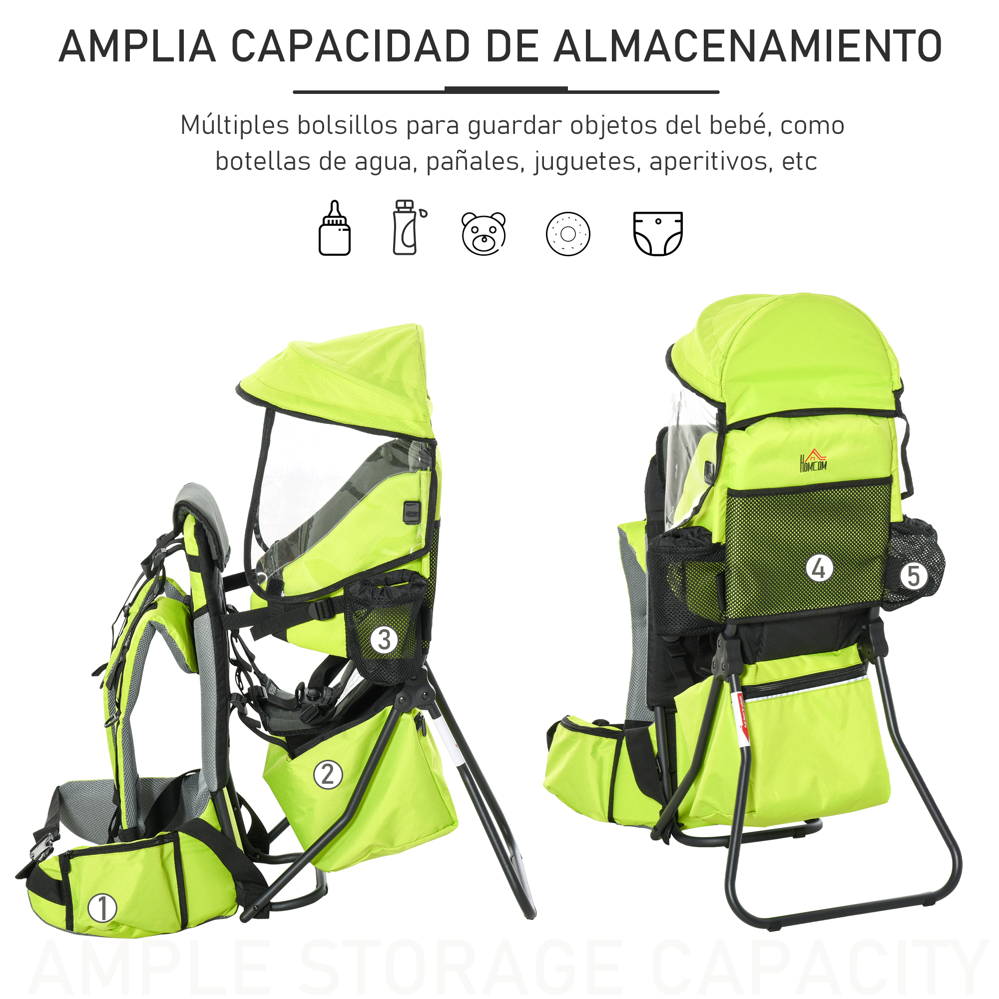 HOMCOM Mochila Portabebés Plegable Portador de Bebé con Techo Impermeable Base de Soporte y Múltiples Bolsillos para 6-36 Meses Carga 15 kg 38x77x87,5 cm Verde Claro