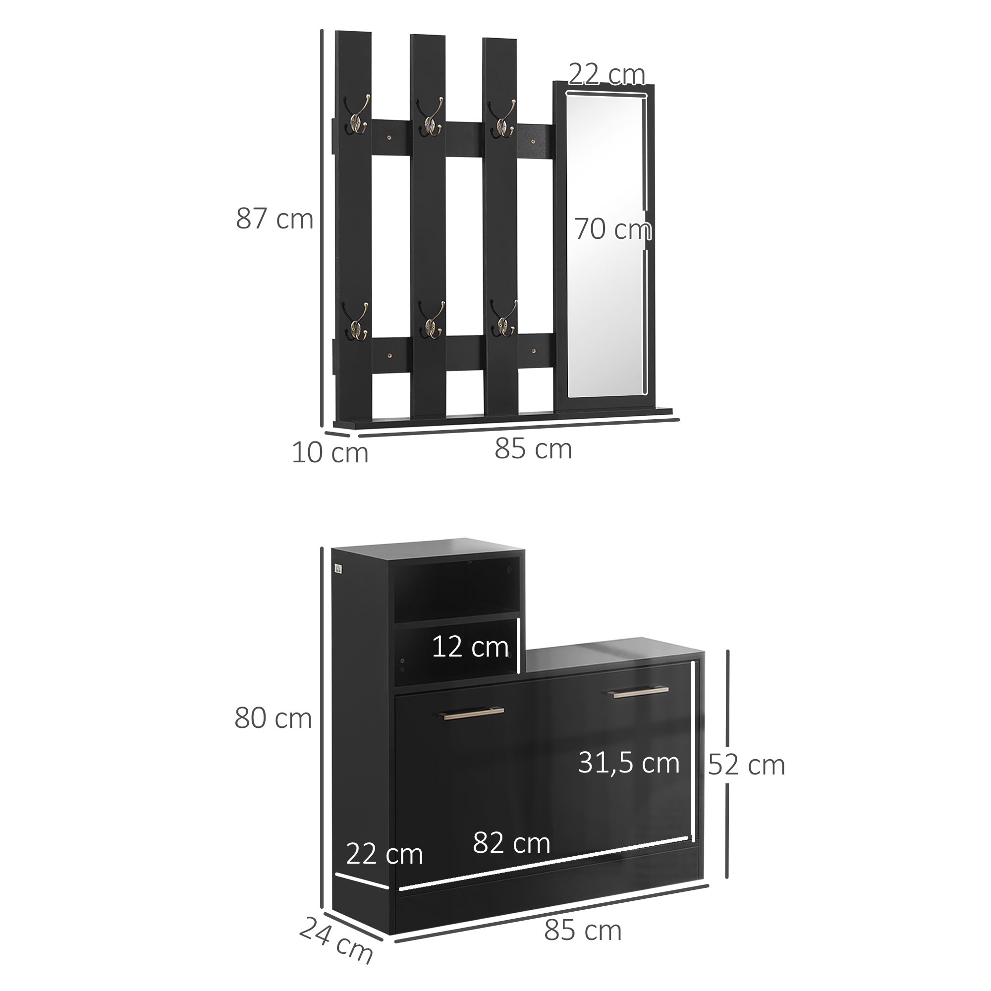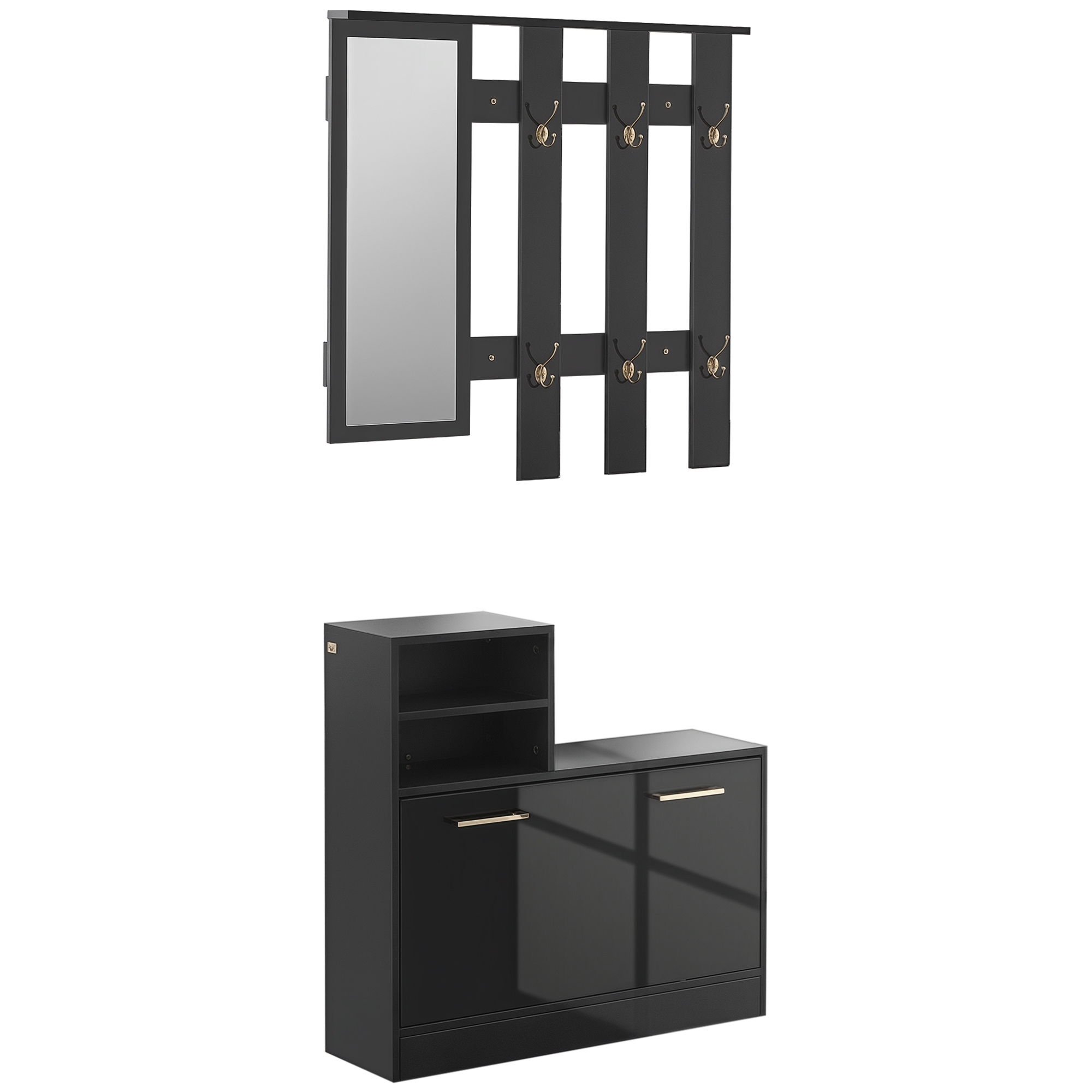 HOMCOM Conjunto de Recibidor de Entrada con Espejo Perchero y Zapatero Muebles de Entrada con 6 Ganchos y Estantes para 8 Pares de Zapatos para Pasillo Negro Brillante