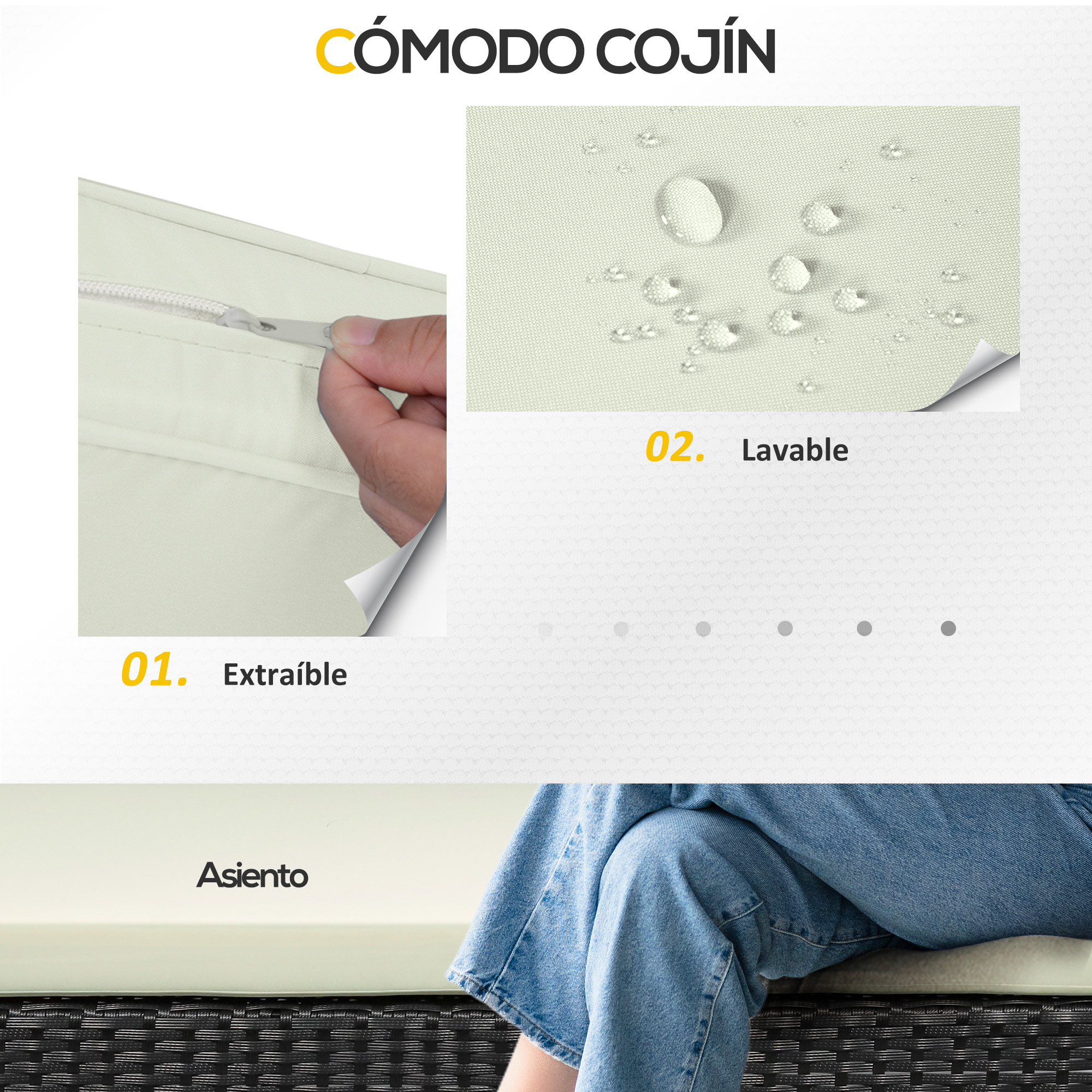 Renueva tu jardín y haz que el área exterior de tu casa sea tan acogedora como el interior con este conjunto de muebles de exterior de Outsunny. Compuesto por 4 piezas, incluyendo un sofá de dos plazas, dos sillones y una mesa de centro con encimera de vidrio templado, este conjunto de muebles de jardín es ideal para disfrutar de los días de verano con amigos y familiares. Características: Conjunto de muebles de patio de ratán PE que incluye un sofá de dos plazas, dos sillones y una mesa de centro a juego La mesa de centro cuenta con una elegante encimera de cristal templado oscurecido y ofrece espacio para colocar bebidas y aperitivos Los cojines ofrecen una gran comodidad y sus fundas se pueden quitar para limpiar fácilmente Las patas tienen almohadillas antideslizantes para mayor estabilidad y para evitar arañazos en el suelo Ideal para colocar en jardines, balcones y patios Requiere montaje, se estima que dos personas pueden instalarlo en una hora Especificaciones: Color: negro, crema Material: acero, ratán PE, poliéster Medidas del sofá doble: 106x61x78 cm (LxANxAL) Medidas de cada sillón: 58x61x78 cm (LxANxAL) Medidas de la mesa: 80x47x42 cm (LxANxAL) Medidas de los asientos: 94×47 cm (sofá), 47×47 cm (sillón)(LxAN) Altura de los asientos: 40 cm(sin cojín) Grosor de los cojines: 5 cm Carga máxima: 240 kg (sofá), 120 kg (cada sillón), 50 kg (mesa) Referencia: 860-331V00CW El paquete incluye: ● 1 x Sofá de 2 plazas; ● 2 x Sillón; ● 1 x Mesa de centro; ● 3 x Cojín de asiento; ● 1 x Manual de instrucciones
