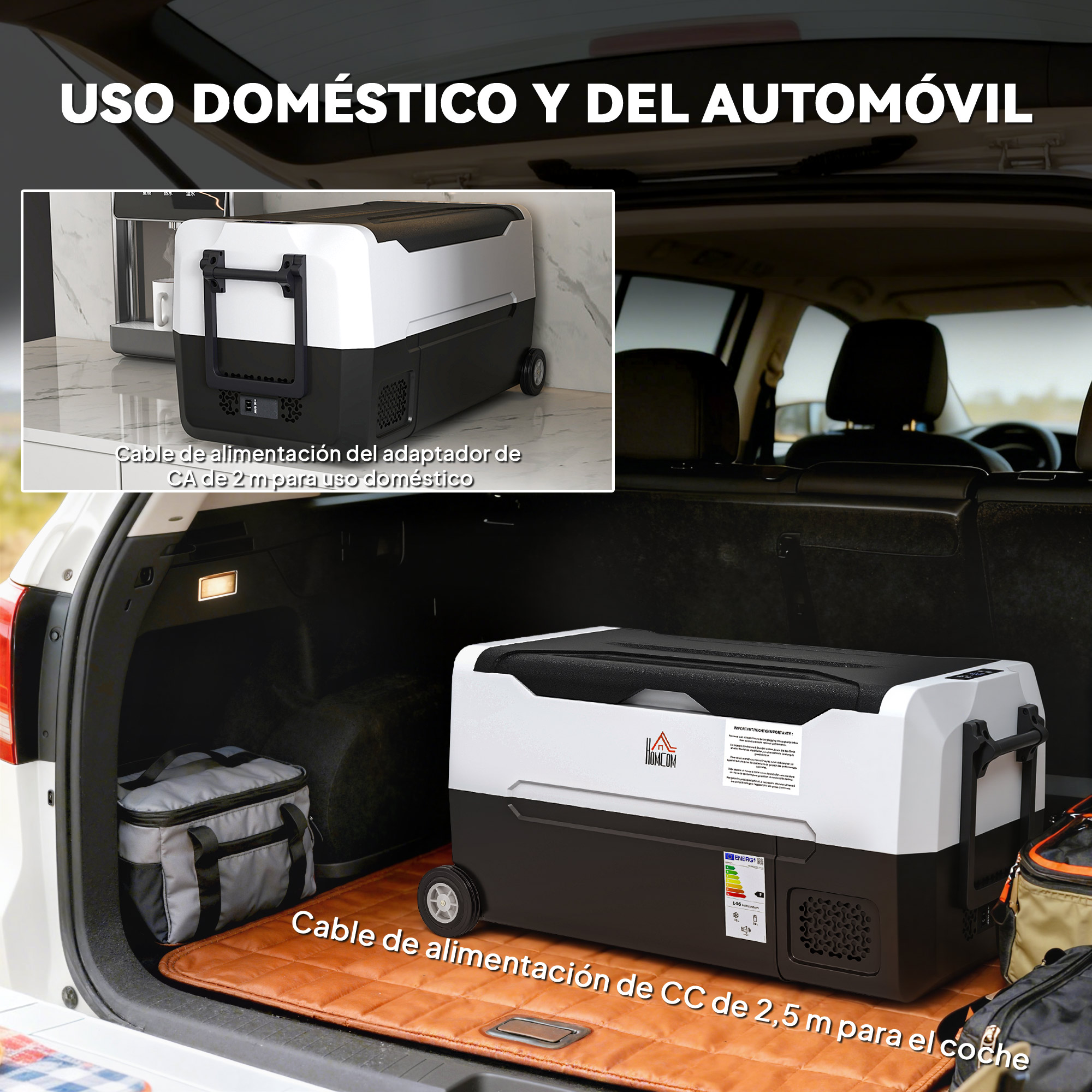 Mantén tus comidas y bebidas frías con esta cómoda nevera congelador para coche de HOMCOM, ¡tu nueva compañera de viaje! Con capacidad para 30,5L, tiene un amplio intervalo de temperatura entre los -20ºC y los 20ºC con dos compartimentos separados, siendo el complemento perfecto para tus aventuras de camping o tus viajes por carretera. Versátil y práctica, esta nevera eléctrica se puede conectar tanto en el coche como en casa, y ofrece dos modos para adaptarse a tus necesidades, ECO y MAX. Características: Nevera eléctrica y portátil con capacidad de 30,5 L y un rango de temperatura entre -20°C y 20°C Dos compartimentos separados para una refrigeración y congelación eficientes Luces LED incorporadas para facilitar el acceso a los artículos por la noche Sigue funcionando en pendientes de hasta 30° para una refrigeración constante Cuenta con asas y ruedas para un transporte más cómodo y manejable Diseño fácil de limpiar gracias a una válvula de drenaje inferior Especificaciones: Color: negro y blanco Material: PP, ABS Medidas totales: 72,6x39x37,3 cm (LxANxAL) Volumen: 30,5 L Rango de temperatura: -20°C-20°C Voltaje: DC 12V/24V (uso en coche), AC 100V-240V (uso doméstico) Cable de alimentación de CC: 2,5 m Cable del adaptador de CA: 2 m Potencia del compresor: 35 W (±20%), 45 W (±20%) Ruido: ≤45dB Clasificación de eficiencia energética: F Carga máxima: 100 kg Referencia: C00-045V90BK El paquete incluye: ● 1 x Nevera portátil; ● 1 x Cable de alimentación de CC; ● 1 x Adaptador de CA; ● 1 x Manual de instrucciones