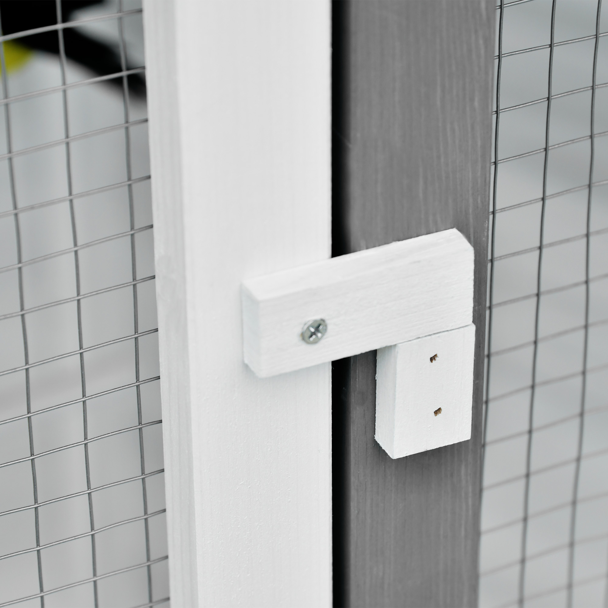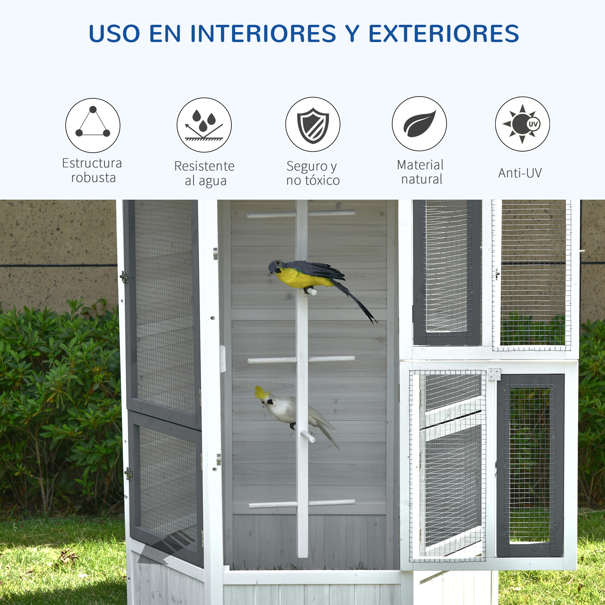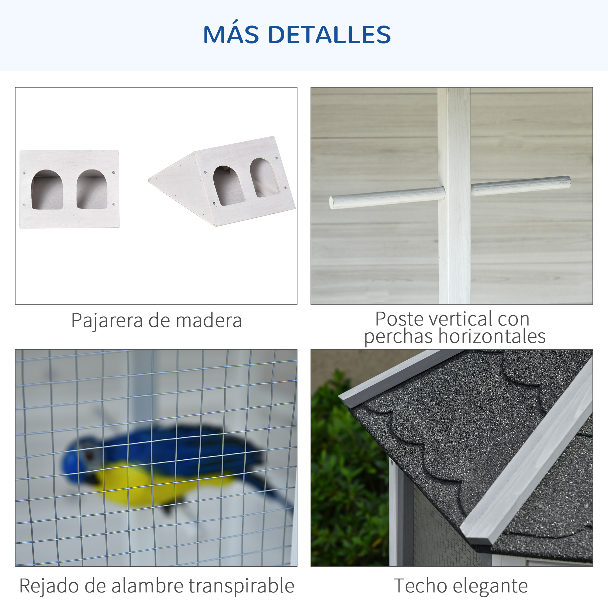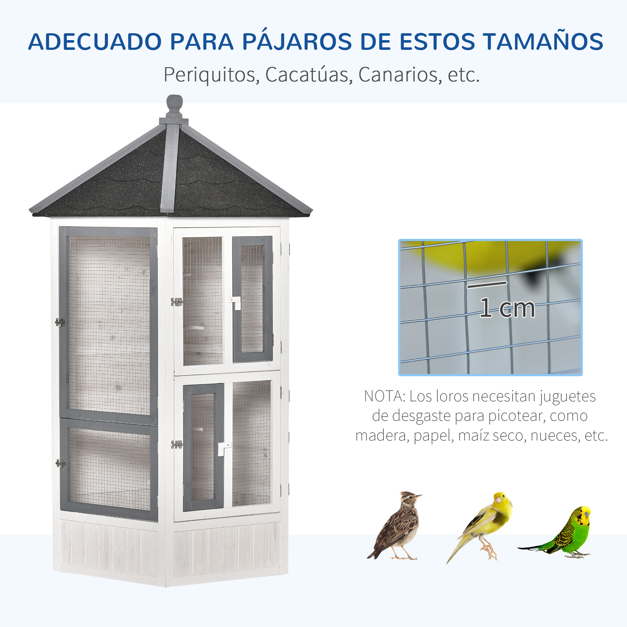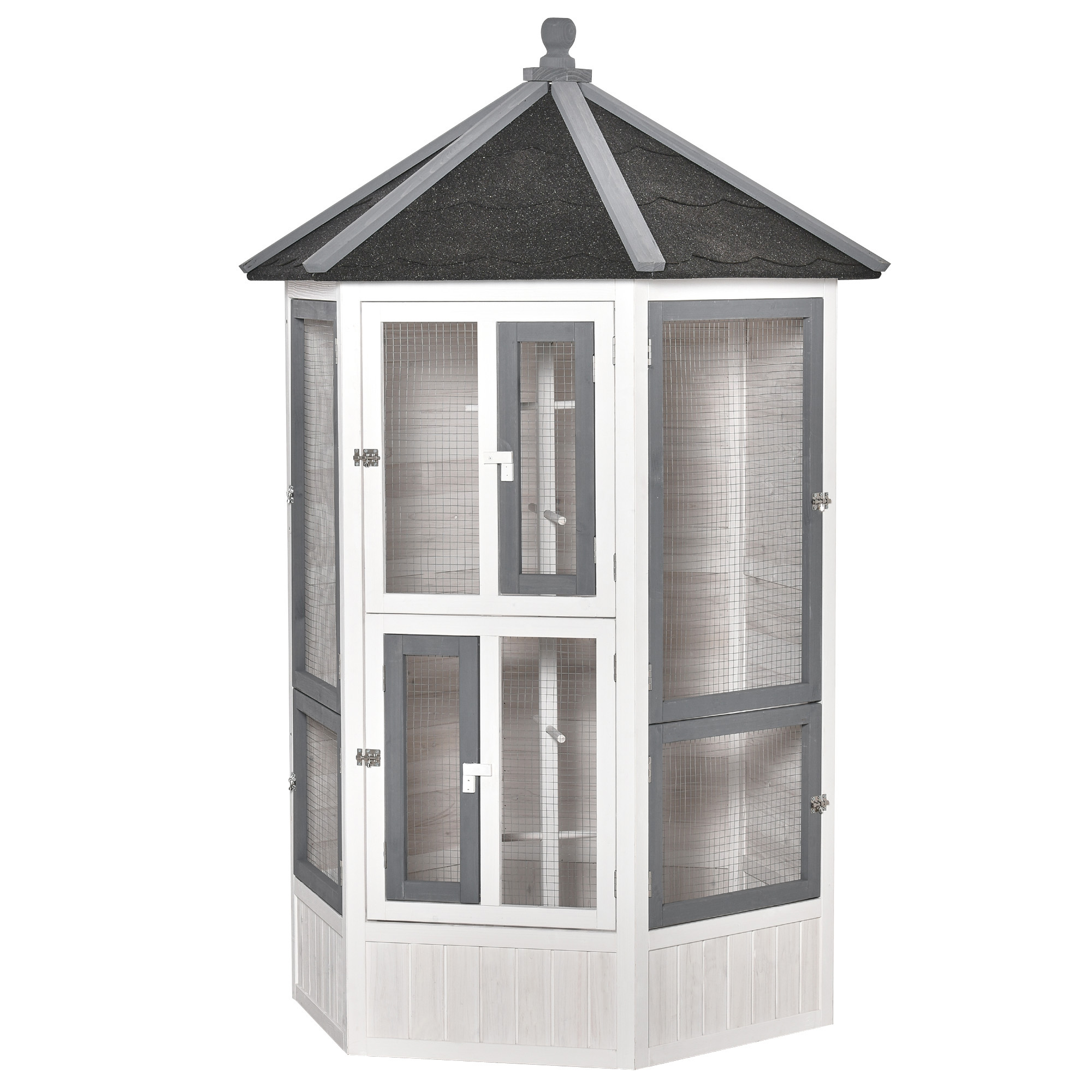 PawHut Pajarera de Madera Grande para Balcón Jardín con Múltiples Puertas Ventanas 2 Nidos de Pájaros 5 Barras y Techo Asfáltico 125x125x183 cm Gris Blanco y Negro